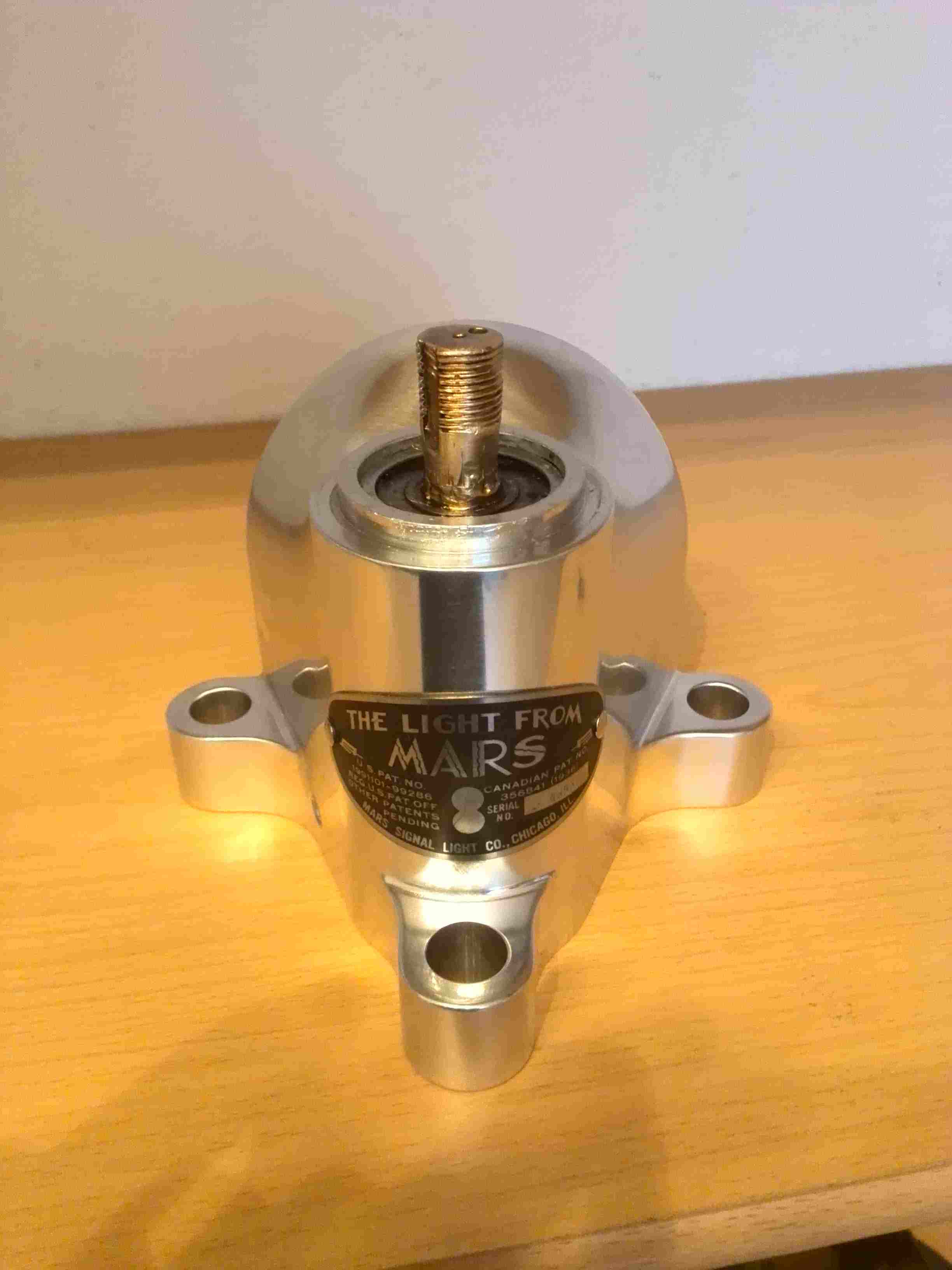 Z.B. Bei der Antriebseinheit konnte ich alle Teile aufarbeiten aber eine Schraube war gebrochen. Da es eine spezial Schraube war mit Loch in der Mitte und ca. 2mm Kopf ohne Gewinde, musste diese durch eine andere Schraube ersetzt werden die ich dann zugefräst bzw. gebohrt habe. Die Bodenplatte musste auch komplett ersetzt werden genauso wie die Halterung der Kopfes. ( Bilder folgen ) Ansonsten alles schleifen, polieren und neu verchromen/verzinken An Neuteile oder im allgemeinen Ersatzteile für diese alte Leuchte ranzukommen ist so gut wie unmöglich oder mit sehr viel Glück verbunden. |