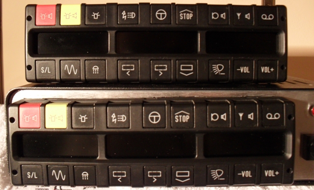 Alle Tasten sind mit Hinterleuchtung ausgelegt, bei Funktion leuchten sie heller. Die Bedienteile lassen sich generell in drei (K-BT 12X vier) Bereiche untergliedern: linker Bereich: Sondersignalbereich Hier lassen sich alle SoSi-Funktionen bedienen, sprich - "nur Kennleuchten ein" - "Kennleuchten ein, Klangfolgebereitschaft" - "Horn ein". Analog zum Hella-Alarmzugdrehschalter erlaubt die Rettungsdienst-/Feuerwehr-Variante nicht die Stellung "nur Kennleuchten ein". Die Funktion der Kennleuchten (links und rechts) wird über rote Kontrollleuchten angezeigt. Beim K-BT 121 ist noch eine dritte Kontrollleuchte vorhanden (H), welche für eine Heckkennleuchte bzw. die Frontblitzer verwendet werden kann. Bei der Möglichkeit einer Stadt-Land-Umschaltung lässt sich diese bei laufendem Horn durch Drücken des Schalters "Kennleuchten ein, Klangfolgebereitschaft" umschalten. Landhorn wird durch eine rote Kontrollleuchte angezeigt. (Natürlich nur bei den Anlagen, welche im "Ruhemodus" Stadtsignal abstrahlen, z.B. K-SM 20 von Pintsch Bamag, bei RTK 4-SL ist es genau umgekehrt.) Bereich rechts oben: Display-Bereich Drei Ausgänge (Belastung je max. 5 A bei K-BT 110, je max. 2 A bei K-BT 121) können beliebig belegt werden. Üblicherweise dienen die Tasten der Schaltung von Anhaltesignalgebern oder der Hinterleuchtung des Balkens. Bei der Polizei-Variante sind die Tasten in der Regel gegeneinander verriegelt, so dass nur je ein ASG aktiv ist. Bei K-BT 12X wird zusätzlich zur stärkeren Beleuchtung der Taste bei Funktion ein Signalton ausgegeben. Bereich rechts unten: Sprachdurchsage / Testfunktion Über die von Hella-Bedienteilen bekannten Symbole können sowohl der Funkverkehr aufgeschaltet wie auch Durchsagen mittels Handapparat/Mikrophon durchgeführt werden. Eine Lautstärkeregelung ist über das Potentiometer mit dem mittig angebrachten Regler möglich. Die beiden Tasten sind gegeneinander verriegelt. Die Testfunktion (nur Taster) erlaubt bei eingeschalteten Kennleuchten und Zündung die Abgabe eines Zyklus des Sondersignals in verminderter Lautstärke (unmittelbar nur bei PB/WG-Anlagen, bei RTK 4-SL z.B. nicht direkt). Bei den Bedienteilen der K-BT 12X-Reihe gibt es unterhalb des Sondersignalbereiches noch bis zu zwei Zusatztasten, z.B. für Frontblitzer, Arbeitsscheinwerfer etc. Die Funktion sowie Schaltbedingungen (Kennleuchten ein, Zündung ein) sind in der Programmierung des K-BT festgelegt und vom Anwender nicht änderbar. Hier die Bilder meiner Bedienteile: K-BT 110 in der Rettungsdienst-/Feuerwehr-Ausführung (noch unverbaut): Anhang 4763 K-BT 110 in der Polizei-Ausführung (steuert meinen TopAs 140 mit Duo-Drehlicht): Anhang 4762 K-BT 120 BaWü (steuert meine schweizer RTK 4-SL, Schalter unterhalb SoSi-Bereich steuert die Zusatzblinkleuchten): Anhang 4764 K-BT NW (noch unverbaut): Anhang 4760 K-BT 121 (noch unverbaut, mit Schaltmöglichkeiten für Frontblitzer, Arbeitsscheinwerfer, Hochleistungsfrontblitz [Display I-Taste, nicht mit den beiden anderen Display-Tasten verriegelt]) Anhang 4765 Hier mal ein Vergleich der unterschiedlichen Längen (links K-BT NW, Mitte K-BT 121, rechts K-BT 110): Anhang 4761 Das K-BT 6 sticht aus den übrigen Bedienteilen heraus. Es ist zur digitalen Ansteuerung der TOP-1 gedacht. Wie auch das Bedienteil der Hella RTK 6-SL wird es in einen DIN-Radio-Schacht eingeschoben und arretiert bzw. mittels der Standard-Entriegelungshaken ausgebaut. Es erlaubt die oben genannten Sondersignal-, Test,- Durchsage-/Funkaufschaltungsfunktionen mit Ausnahme der Stadt-/Land-Umschaltung (nicht möglich aufgrund des verbauten Sondersignalgenerators). Desweiteren lassen sich die gezeigten Texte aus dem Display der Anlage darstellen. Dies allerdings nicht wie bei der RTK 6 durch Auswahl, ob vorne oder hinten, sondern so, wie im Eprom gespeichert. So lassen sich "Bitte Folgen" und die Pfeile nur nach hinten abstrahlen. Anhang 4766 |