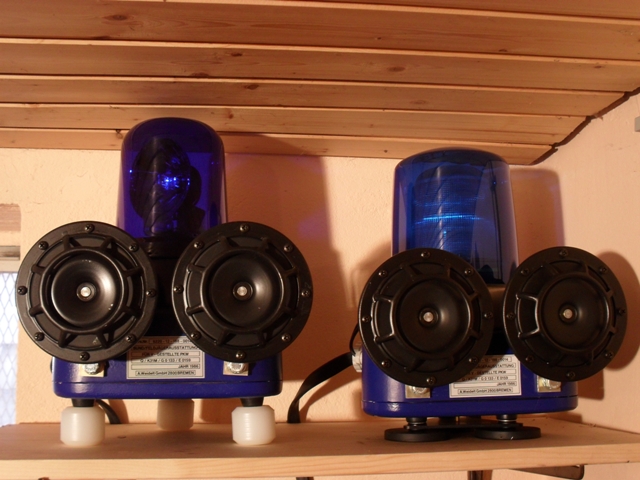 Und noch eine Besonderheit: der rechte Drehschalter stellt die Zündung dar. Die rote LED darüber leuchtet bei "Zündung ein". Anhang 4542 Das hat folgende Bewandnis: laut Anschlussplan kann man die Stromversorgung für das zweite Leuchtmittel der Duo-Drehlichtmodule entweder über Klemme 30 oder 15 anschließen. Ich habe mich für 15 entschieden - so kann ich also den "Sparmodus" im Stand simulieren, bei dem sich beide Spiegel drehen, aber nur eine Leuchtmittel leuchtet. Hier noch die K-LR 8: Anhang 4540 Die Dinger sind echt brutal hell. Pro Modul drei LED, welche leicht versetzt in drei unterschiedliche Richtungen strahlen, um ein weit gefächertes Licht auszustrahlen. Anhang 4538 Und wer sich meinen Sermon bis zum Schluss durchgelesen hat, bekommt noch einen Leckerbissen: das ganze mit roten Hauben. Anhang 4532 Anhang 4541 Die sind aber wieder demontiert und warten mit den roten Endstücken gut verpackt, bis ich mal irgendwann in ferner Zukunft einen weiteren TOPas kriege. Werden ja nicht schlecht... |