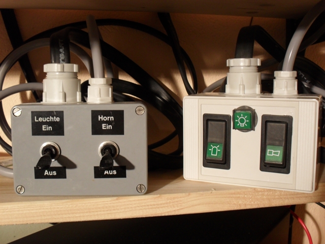 Und hier das Prachtstück in Aktion: vorn vorne: Anhang 6592 Anhang 6593 von hinten: Anhang 6594 Das Stauschild ist leider schon recht mitgenommen und es fehlt ein Spanngurt. Die BE (V3.21) habe ich in ein für meine Sammlung übliches Gehäuse gebaut, der rechte Drehschalter stellt die "Zündung" dar: Anhang 6595 |