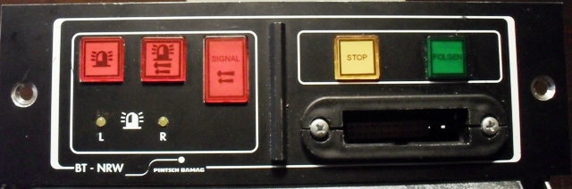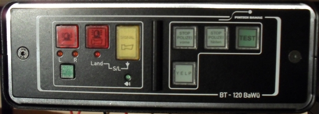 Alle Tasten sind mit Hinterleuchtung ausgelegt, bei Funktion leuchten sie heller. Die Bedienteile lassen sich generell in drei (K-BT 12X vier) Bereiche untergliedern: linker Bereich: Sondersignalbereich Hier lassen sich alle SoSi-Funktionen bedienen, sprich - "nur Kennleuchten ein" - "Kennleuchten ein, Klangfolgebereitschaft" - "Horn ein". Analog zum Hella-Alarmzugdrehschalter erlaubt die Rettungsdienst-/Feuerwehr-Variante nicht die Stellung "nur Kennleuchten ein". Die Funktion der Kennleuchten (links und rechts) wird über rote Kontrollleuchten angezeigt. Beim K-BT 121 ist noch eine dritte Kontrollleuchte vorhanden (H), welche für eine Heckkennleuchte bzw. die Frontblitzer verwendet werden kann. Bei der Möglichkeit einer Stadt-Land-Umschaltung lässt sich diese bei laufendem Horn durch Drücken des Schalters "Kennleuchten ein, Klangfolgebereitschaft" umschalten. Landhorn wird durch eine rote Kontrollleuchte angezeigt. (Natürlich nur bei den Anlagen, welche im "Ruhemodus" Stadtsignal abstrahlen, z.B. K-SM 20 von Pintsch Bamag, bei RTK 4-SL ist es genau umgekehrt.) Bereich rechts oben: Display-Bereich Drei Ausgänge (Belastung je max. 5 A bei K-BT 110, je max. 2 A bei K-BT 121) können beliebig belegt werden. Üblicherweise dienen die Tasten der Schaltung von Anhaltesignalgebern oder der Hinterleuchtung des Balkens. Bei der Polizei-Variante sind die Tasten in der Regel gegeneinander verriegelt, so dass nur je ein ASG aktiv ist. Bei K-BT 12X wird zusätzlich zur stärkeren Beleuchtung der Taste bei Funktion ein Signalton ausgegeben. Bereich rechts unten: Sprachdurchsage / Testfunktion Über die von Hella-Bedienteilen bekannten Symbole können sowohl der Funkverkehr aufgeschaltet wie auch Durchsagen mittels Handapparat/Mikrophon durchgeführt werden. Eine Lautstärkeregelung ist über das Potentiometer mit dem mittig angebrachten Regler möglich. Die beiden Tasten sind gegeneinander verriegelt. Die Testfunktion (nur Taster) erlaubt bei eingeschalteten Kennleuchten und Zündung die Abgabe eines Zyklus des Sondersignals in verminderter Lautstärke (unmittelbar nur bei PB/WG-Anlagen, bei RTK 4-SL z.B. nicht direkt). Bei den Bedienteilen der K-BT 12X-Reihe gibt es unterhalb des Sondersignalbereiches noch bis zu zwei Zusatztasten, z.B. für Frontblitzer, Arbeitsscheinwerfer etc. Die Funktion sowie Schaltbedingungen (Kennleuchten ein, Zündung ein) sind in der Programmierung des K-BT festgelegt und vom Anwender nicht änderbar. Hier die Bilder meiner Bedienteile: K-BT 110 in der Rettungsdienst-/Feuerwehr-Ausführung (noch unverbaut): Anhang 4763 K-BT 110 in der Polizei-Ausführung (steuert meinen TopAs 140 mit Duo-Drehlicht): Anhang 4762 K-BT 120 BaWü (steuert meine schweizer RTK 4-SL, Schalter unterhalb SoSi-Bereich steuert die Zusatzblinkleuchten): Anhang 4764 K-BT NW (noch unverbaut): Anhang 4760 K-BT 121 (noch unverbaut, mit Schaltmöglichkeiten für Frontblitzer, Arbeitsscheinwerfer, Hochleistungsfrontblitz [Display I-Taste, nicht mit den beiden anderen Display-Tasten verriegelt]) Anhang 4765 Hier mal ein Vergleich der unterschiedlichen Längen (links K-BT NW, Mitte K-BT 121, rechts K-BT 110): Anhang 4761 Das K-BT 6 sticht aus den übrigen Bedienteilen heraus. Es ist zur digitalen Ansteuerung der TOP-1 gedacht. Wie auch das Bedienteil der Hella RTK 6-SL wird es in einen DIN-Radio-Schacht eingeschoben und arretiert bzw. mittels der Standard-Entriegelungshaken ausgebaut. Es erlaubt die oben genannten Sondersignal-, Test,- Durchsage-/Funkaufschaltungsfunktionen mit Ausnahme der Stadt-/Land-Umschaltung (nicht möglich aufgrund des verbauten Sondersignalgenerators). Desweiteren lassen sich die gezeigten Texte aus dem Display der Anlage darstellen. Dies allerdings nicht wie bei der RTK 6 durch Auswahl, ob vorne oder hinten, sondern so, wie im Eprom gespeichert. So lassen sich "Bitte Folgen" und die Pfeile nur nach hinten abstrahlen. Anhang 4766 |