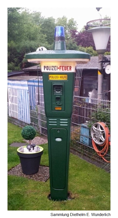 Seit 1924 gab es in Berlin Polizei-Straßenmelder, die an das Telefonnetz angeschlossen waren. Die Beamten im Straßenaufsichtsdienst konnten darüber mit ihrem nächstgelegenen Polizeirevier in Verbindung treten. Aber erst 1956 wurden auf der Internationalen Polizeiausstellung in Essen Notrufanlagen vorgestellt, mit denen auch Bürger jederzeit kostenlos die Polizei alarmieren konnten. Diese Notrufsäulen - auch "Eiserner Schutzmann" genannt - krönte eine Rundumkennleuchte, die bei Betätigung des Hebels zum Aufbau der Sprechverbindung zu leuchten begann. Mit zunehmendem Ausbau der Telefonnetze verschwanden diese Notrufsäulen aus unserem Straßenbild.