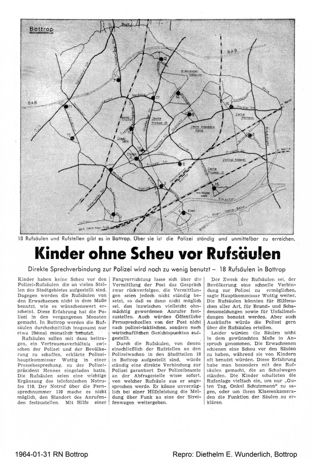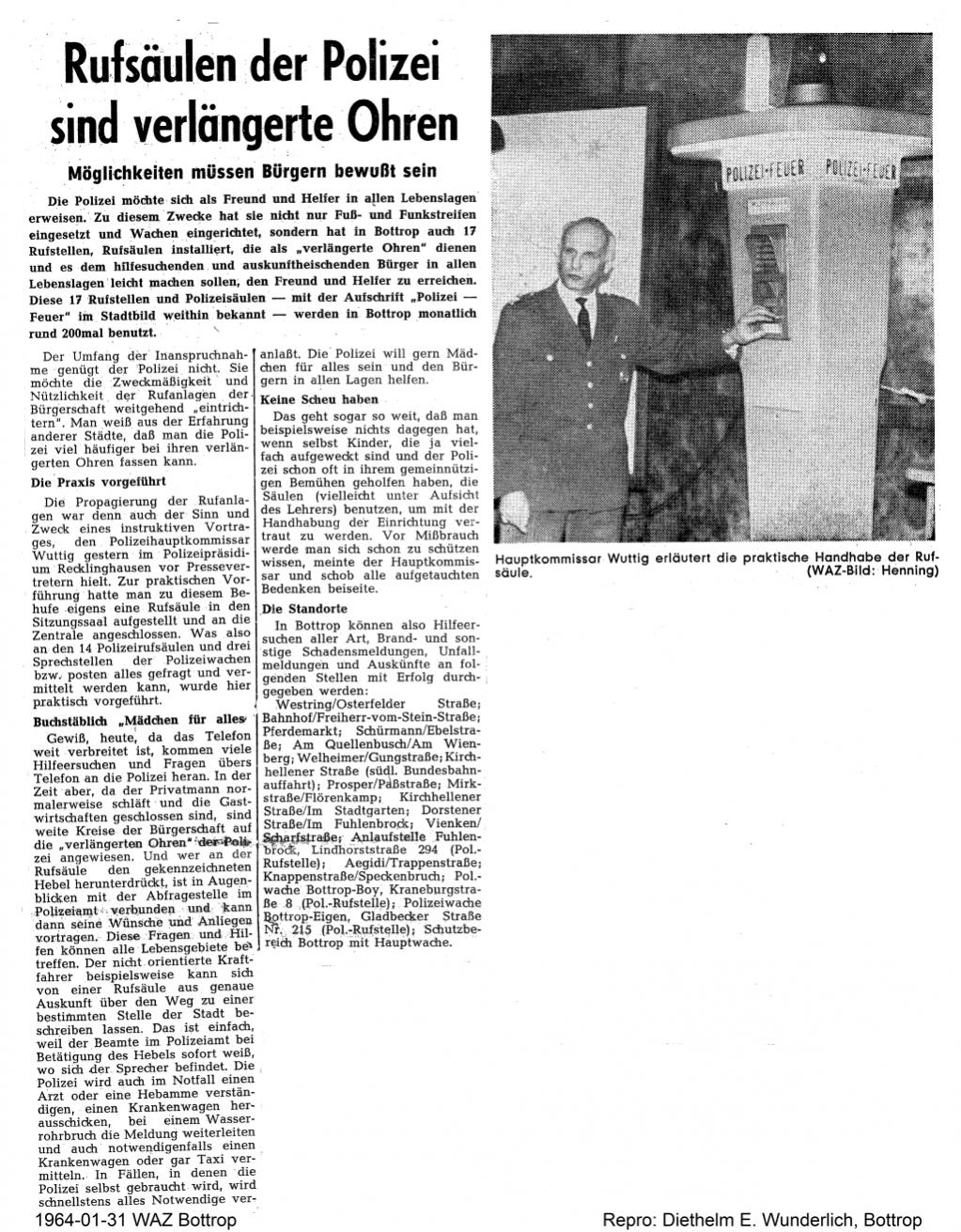Hier noch zwei Presseberichte von 1964, mit denen die Notrufsäulen der Bottroper Bevölkerung bekannt gemacht werden sollten.