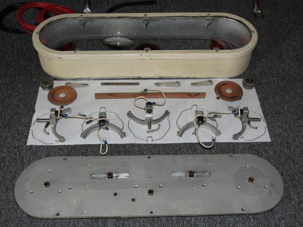 Das es mitunter Eng zugeht, ist Timing alles! Anhang 19731 Anhang 19732 Zustand bei Erhalt: Die Haube wurde mal teilweise von innen lackiert und hat zwei Sprünge. Ist zwar ärgerlich aber zumindest ist die Haube da und die Schadstellen sind oberhalb der Leuchten, sodaß man sie durch lackieren der Oberseite (wäre ja nicht unüblich) etwas kaschieren könnte (wenn man denn wollte). Da der allgemeine Zustand für das Alter doch noch recht gut ist (abgesehen von der Haube), werde ich den Zustand wohl lediglich bewahren. Außer den beiden Sprüngen hat die Haube noch einen leichten Hitzeschaden. An einer Stelle (Mitte rechts vorn) ist sie etwas verformt und an zwei anderen ist eine leichte Blasenbildung zu sehen. Von der eigentlich 4-teiligen Haubedichtung fehlt ein gerades Stück. Da die vorhandenen Teile etwas geschrumpft sind (Schraubenlöcher passen nicht mehr) ist das nicht weiter schlimm. Müßten eh neue angefertigt werden. Anhang 19735 Was bisher geschah: Nachdem der erste Probelauf nicht sehr erfolgreich verlief (der Motor zuckte kurz und die Lampen gingen an), hab ich mir das ganze mal etwas genauer angeschaut. Anhang 19380 Anhang 19379 Die gute Nachricht ist: Der Motor ist i.O. (lief Solo problemlos) Durch das alte zähe/klumpige Graphitfett war ein zerlegen der Mechanik unumgänglich. Alle Einzelteile wurden zunächst vom alten Fett befreit und auch ansonsten nur gereinigt. Die Lagerbuchsen weisen zwar etwas Spiel auf, da sie aber eingekörnt und geklebt sind habe ich von einem erneuern erst einmal abgesehen. Da einige Kabel mal zwischen Grundplatte und Gehäuse eingequetscht waren, hab ich die Verkabelung erneuert. Anhang 19730 Nach den Kleben der Brüche/Sprünge ging es ans schleifen und polieren der Haube. Und zwar von außen und innen. (das durchgehärtete Gewebeklebeband ließ sich ganz phantastisch schleifen) :kotz: Aufbau/Technik: Das Gehäuse (unten offen) besteht aus Alu-Guss. In ihm wird die Grundplatte mit der gesamten Mechanik eingelegt und mit 6 Schrauben befestigt. Die Haube wird zusammen mit dem Zierring am Gehäuse mit 8 Schrauben gesichert. Die Haubendichtung besteht aus 4 Teilen und wird durch Kleber auf dem Gehäuse fixiert. Anhang 19728 Alle 5 Leuchten werden von einem Motor angetrieben. Die beiden äußeren werden über Zahnstangen und die 3 inner mittels Hebelarmen bewegt, wobei zwei der mittleren Leuchten ihren Drehpunkt direkt in der Zahn-/Schubstange haben. |