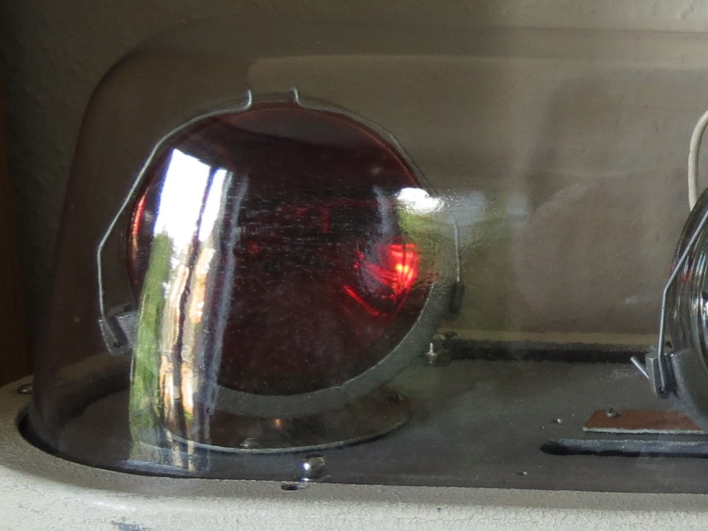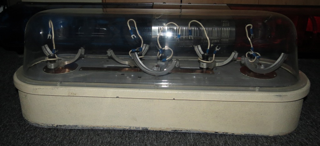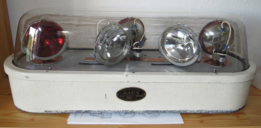 MARS SIGNAL LIGHT COMPANY - Aurora Borealis Model 500, 12V, Serial No. 438 Anhand des schwarzen Typenschildes und der rauen Gehäuseoberfläche (die späteren waren poliert) kann man erkennen, das es sich um eines der frühen Modelle handelt (zumindest was den Sockel betrifft). Die ersten AB hatten noch federbelastete Blechstreifen (anstelle der Drahtbügel), die mittels kleiner Stift gesichert waren. Die Nummer auf der Grundplatte müßte eigentlich mit der Serien-Nr. übereinstimmen, was sie aber leider nicht tut. Das, die neueren Drahtbügel und ein nachträglich vor der Serien-Nr. eingeschlagenes R lassen mich daran zweifeln, dass die AB so Erstausgeliefert wurde. (was mir aber ehrlich gesagt völlig egal ist) Meine Vermutung: Entweder wurde die AB mal Überholt und im Zuge dessen Teile durch neuere ersetzt, oder es wurde einfach aus mehreren Leuchten eine relativ gute zusammengesucht. Die AB kann in zwei Stufen angesteuert werden: Mit der Stufe eins werden die beiden äußeren (roten) Leuchten zusammen mit der nach hinten gerichtetet (ebenfalls roten) Leuchte eingeschaltet. Natürlich incl. Motor. In der zweiten Stufe folgen dann die beiden nach vorn gerichteten (weißen) Leuchten. Anhang 19733 Anhang 19734 Maße (circa):