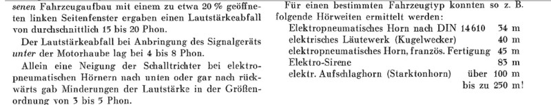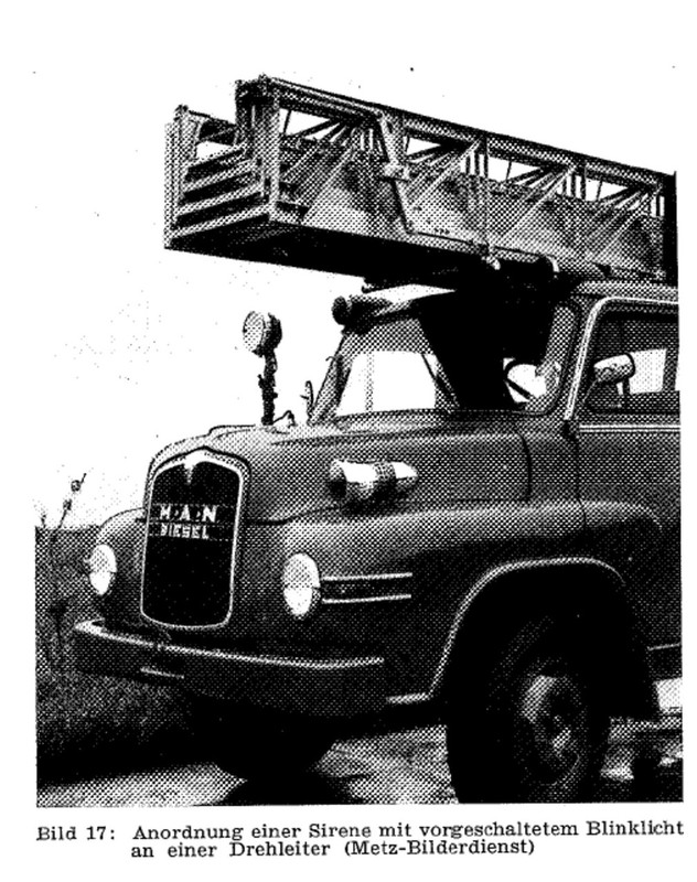 Anhang 4871 Mittels Kurbelbetrieb wurde Versucht, die Glocke zu mechanisieren. Anhang 4872 Mit Zunahme des Verkehrs in den 1930er Jahren und der Tendenz, Autos mit geschlossener statt offener Karosserie zu bauen, wurde die Warnwirkung der Glocke mehr und mehr als unzureichend empfunden Die Firma Siemens & Halske verbesserte die Alarmglocke (Stösselglocke) und produzierte bis in die 50er Jahre ein elektromechanisches Geläute, den Motorkugelwecker. Anhang 4873 In den 50er Jahren gab es in den Grosstädten Klagen darüber, dass die Glocke der Strassenbahn der der Feuerwehr zum Verwechseln ähnlich war, was die Warnwirkung einschränkte. Zudem entsprach das Geklingel in Tonhöhe "h"auch nicht dem Wortlaut der STVO vom 29.3.1956, in der es in § 55 (4) heisst "...eine Warnvorrichtung mit einer Folge verschieden hoher Töne muss an Fahrzeugen angebracht werden..." Der Motorkugelwecker war ab diesem Datum für Neufahrzeuge nicht mehr zulässig, wurde aber an vorhandenen Fahrzeugen belassen und auch weiterhin noch einige Jahre benutzt. Als Exoten unter den Signalen gab es: Anhang 4874 Da direkt nach dem 2. Weltkrieg die einzigen beiden Hersteller von Sondersignalen, die Firmen Max B. Martin und Siemens & Halske (Motorkugelwecker) in der Sowjetischen Besatzungszone lagen und somit als Lieferant (vorerst) ausfielen, bot es sich, insbesondere in der amerikanischen Besatzungszone an, amerikanische Sirenen mit Wail-Signal zu verwenden. Im südwestdeutschen Esslingen/Waghäusel stellte die Firma Elektror elektromechnische Wail-Sirenen her, welche von deutschen Feuerwehren bis gegen Ende der 50er-Jahre verwendet wurden. Anhang 4875 Anhang 4876 Bereits vor dem 2. Weltkrieg fanden diese Sirenen in Deutschland keine Anklang. Nun empfand man den Ton als "nervensägendes Geheul" und fühlte sich dadurch auch an die Luftschutzsirenen des WK II erinnert Negativ war auch der extrem hohe Stromverbrauch, der bei längeren Alarmfahrten rasch die Batteriekapazität überstieg. Sirenen betrachtete man bereits 1957 als "Notlösung der Nachkriegsjahre". Anhang 4877 Im Mai 1954 war im Neuentwurf DIN 14610 für Akustische Signalgeräte neben einem "Mehrklangsignalgeber bisheriger Tonfolge" noch die Sirene vorgesehen. Im Hinblick auf die Ergebnisse von Hamburger Signalversuchen 1954/1955 wurde sie fallen gelassen. In der STZVO vom 29.3.1956 stand unter § 55 (4) explizit: "Sirenen dürfen an Fahrzeugen nicht angebracht sein". Anfangs der 30er Jahre entwickelte die Firma Max B. Martin ein elektropneumatisches Signalhorn DIN 14610 (Tremolo-Fanfare), das Martinhorn, welches entweder vom Hornist via Atemluft, Anhang 4878 oder auch mechanisch mittels "Handpumpe" zu betreiben war. Anhang 4879 Anhang 4880 Es wurde im Verlauf elektropneumatisch ausgeführt: Anhang 4881 Martinhorn 2097: Anhang 4882 Das Martinhorn in der urspünglichen Ausführung war nicht wie heute mit Membranen, sondern mit sogenannten Zungenstimmen versehen, die zu einigen Nachteilen führten. Anhang 4883 Anhang 4884 Anhang 4902 Anhang 4885 Anhang 4886 Die Feuerwehr Hamburg hat sich im Jahr 1955 Drucklufthörner mit Membranen, statt Zungenstimmen bauen lassen. Es ist nicht bekannt, von wem. Anhang 4887 Anhang 4888 Man kann spekulieren, ob es sich dabei um die Firma Max B. Martin handelte, denn diese stellte in der Produktion des Martinhorn auf Membranen um, so dass die Schalltrichter nicht mehr nach Unten oder verdeckt einzubauen waren und zusätzlich mit Fliegengittern gesichert werden konnten. Der deutsche Fahrzeugzulieferer SWF (Spezial Werkzeugfabrik Feuerbach) hatte ebenfalls ein Kompressorhorn im Programm SWF Horn mit Membranen: Anhang 4889 Auf Grund zunehmender Verkehrsunfälle von Feuerwehrfahrzeugen in den deutschen Grosstädten hat die Hamburger Feuerwehr zusammen mit der Hamburger Polizei und dem Sachverständigen für Akustik,Dipl.-Ing. R. Kraege in den Jahren 1954/1955 umfangreiche Messungen mit verschiedenen Sondersignalen im Strassenverkehr durchgeführt Dabei zeigte sich, dass das erst 1954 entwickelte Bosch Starktonhorn / Aufschlaghorn mit 100 bis 250 m Hörweite eine wesentlich höhere Durchdringungskraft besass als das elektropneumatische Martinhorn mit nur 34 m. Die Hamburger Feuerwehr stellte deshalb sämtliche Alarmfahrzeuge auf das Starktonhorn um. Später wurde bewusst, dass das Martinhorn durch die fächerartige, breite Schallausbreitung gerade für Alarmfahrten innerhalb der Stadt ideal ist, wogegen das Starktonhorn durch seine extreme Schallbündelung besser für den Einsatz auf Landtrassen und Autobahnen geeignet ist. Idealerweise wurden deshalb vor Einführung der elektronischen Sondersignalanlagen beide Typen am Einsatzfahrzeug verbaut. Anhang 4890 Anhang 4891 Anhang 4892 Die klassische Wechselklang-Tonfolge nach Din 14610 (Martinhorn) war bis 1957 folgende Tonfolge In den Hamburger Versuchen wurde herausgefunden dass diese Tonfolge nur im Nahbereich gut zu erkennen war. In weiterer Entfernung waren die kurzen Töne nicht gut zu hören. Auf Grund dieser Erkenntnisse wurde in den 60er-Jahren die Tonfolge in die noch heute Gültige geändert. Anhang 4893 Anhang 4894 Anhang 4895 Quellenangabe: VFDB-Zeitschrift Forschung und Technik im Brandschutz Heft 4 1957 Oberbrandrat Dipl.-Ing. H.Brunswig VDI Hamburg |