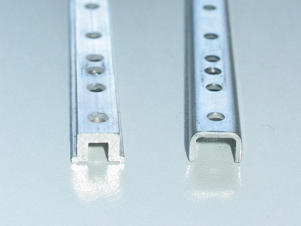 Anhang 11034 Die frühere (auf dem Bild links) ist ein stranggepresstes Alu-Profil und die spätere Ausführung (rechts) ist nur ein aus Flach-Material gekanntetes U-Profil. |