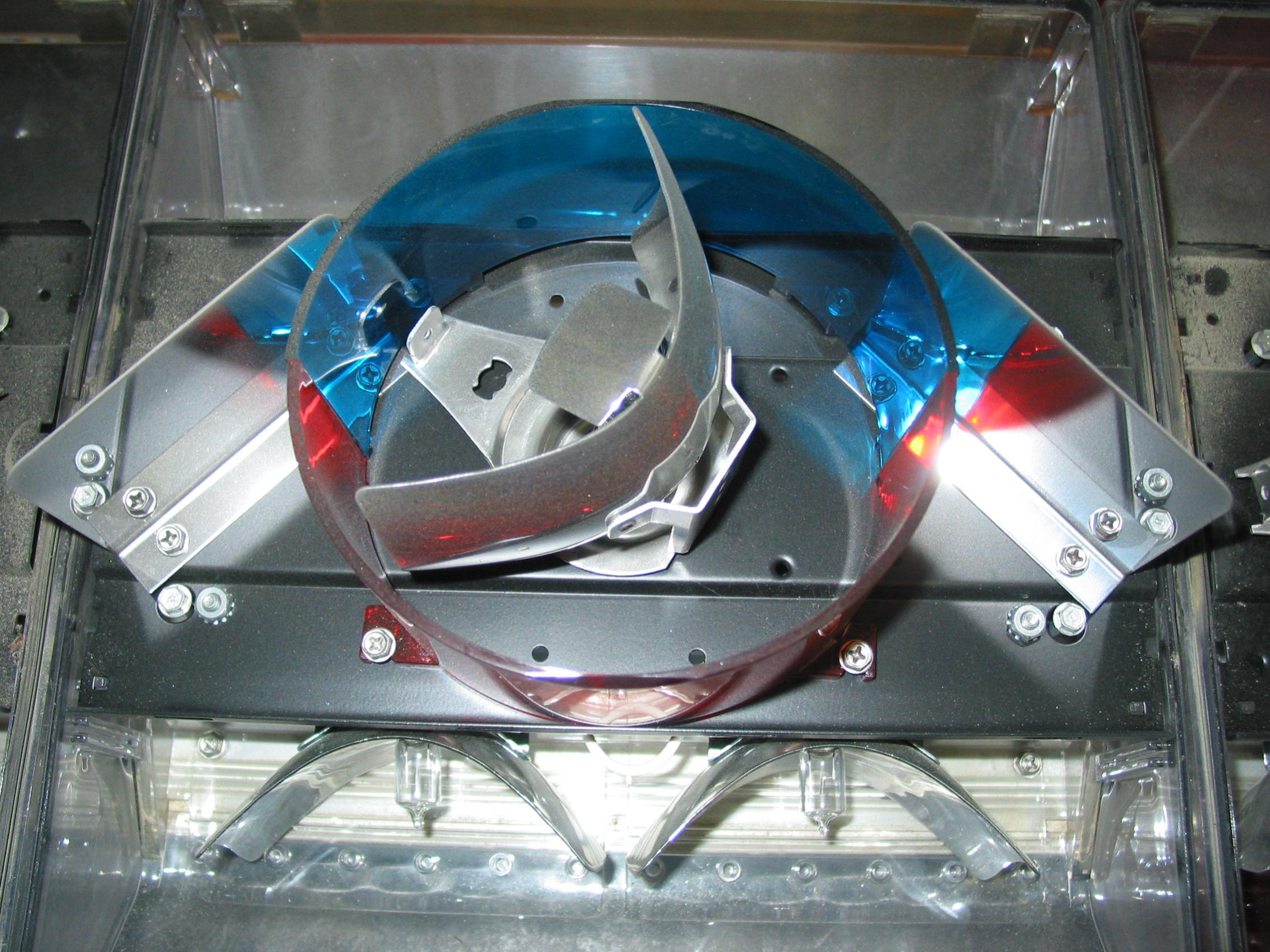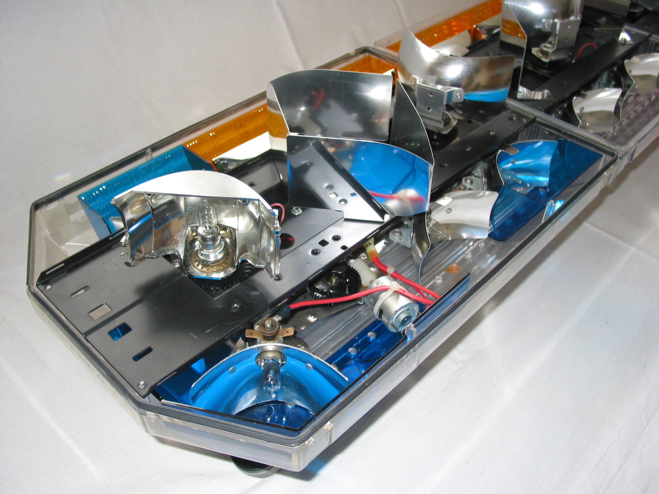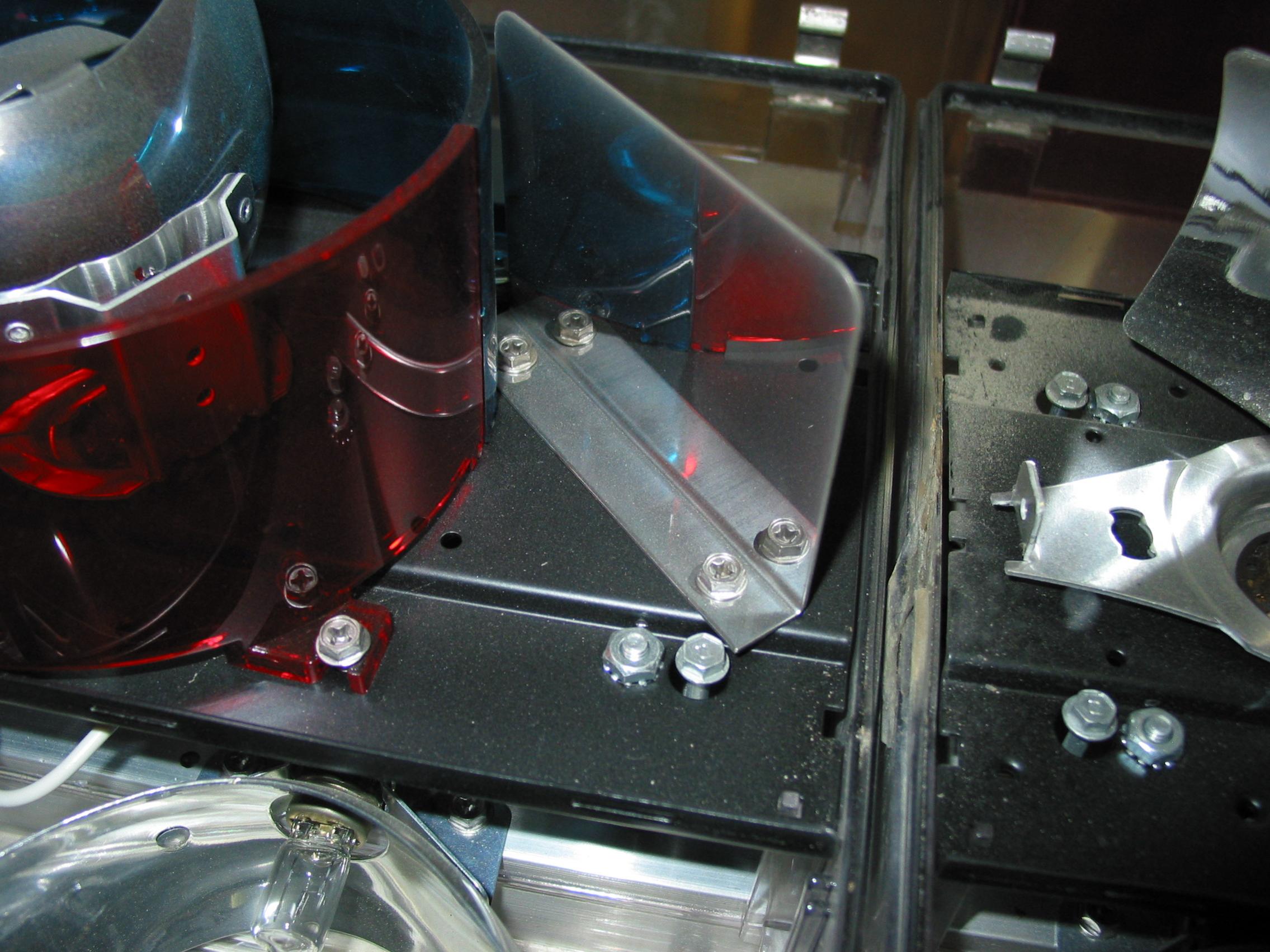 Zu Nummer 3: Besteht wie bei der Halogen-Version aus einem Alu-(Haupt)-Träger mit den aufgeschraubten Metallbügeln. Das darauf zu befestigende U-Profil (auf dem das Power-Supply montiert wird) ist sehr flach und geht, im Unterschied zum Halogen, nicht über die gesamte Breite (siehe Bild). Die vorderen und hinteren Abdeckungen (direkt über den unteren Leuchten) sind L-förmig und werden mit dem U-Profil verschraubt. Auf diesen Abdeckungen werden die Strobe-Heads und zusätzliche Spiegel befestigt. Anhang 8971 Bei der Halogen-Version sind diese Abdeckungen gerade und werden lediglich in das U-Prolil eingehängt! Anhang 8972 |