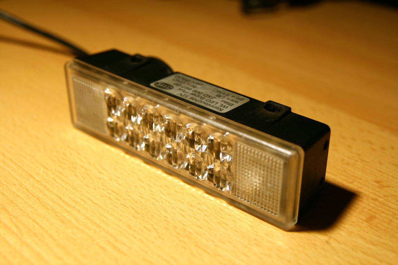 Das ist mein WL-LED (WarnLeuchte LightEmittingDiode) Modul von Hella (was auch sonst?). Es ist meine erste LED Leichte in der Sammlung. Das Modul läuft auf 12V und ist wie unschwer auf den Bildern zu erkennen Blau. In dem Modul befindet sich integriert die Steuerung welche die 12 Super Flux LED's ansteuert. Die LED's sind satt Blau und geben ein gutes Lichtbild ab, welches mich sehr überraschte. Der WL LED ist sehr kompakt, wasserdicht und vielfältig Einsetzbar, als Frontwarner, Heckwarnleuchte, Seitenwarner usw. Man kann auf über 8 Blinkfrequenzen zurückgreifen. Sie werden mit dem Gelben Kontakt geschaltet.