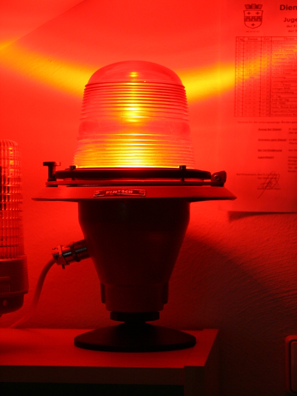 Dies ist zwar keine Sondersignalanlage, aber in einer gewissen weise auch eine Rundumkennleuchte der Fa. Pintsch. Sie Blinkt zwar nicht, aber leuchtet schön.:) Sie war Jahrelang auf einem Hochspannungsmast hier in der Region eingesetzt (daher auch das Grün), ich habe sie dann vor dem Schrott bewahrt. Bilder vor der Restauration: Anhang 11327 Anhang 11328 Ursprünglich war die Leuchte als Paar übereinander aufgebaut, mit einem Relaiskasten unten drin. Da mir das aber für das Zimmer viel zu klobig erschien, habe ich die Zwillinge getrennt. Alles auseinander gebaut, Sandgestrahlt und neu lackiert, in RAL 3000 (war die ursprüngliche Farbe unter dem Grün). Nach dem Anbau eines Sockels für die Leuchte wurde dann noch eine neue Kabeldurchführung aus Metall angebaut und alles angeschlossen. Auch wenn sie keine Sosi ist, macht sie doch eine gute Figur neben den ganzen Leuchten. Aktuell: Anhang 11329 Anhang 11330 Anhang 11331 :) |