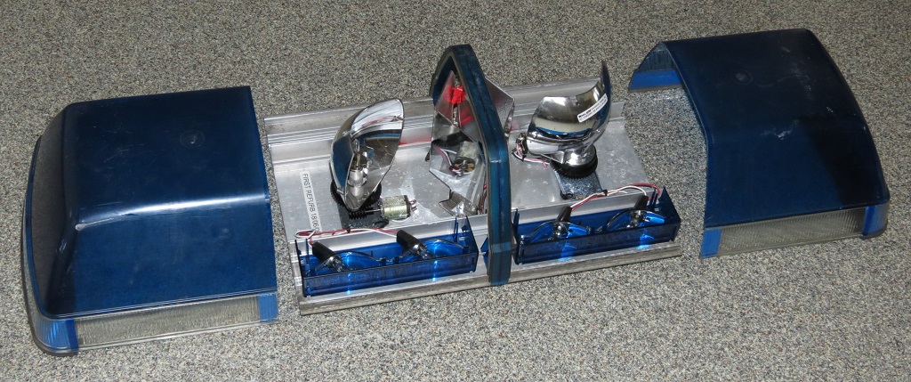 Da ich mit dem Balken zusammen noch zwei weitere Flasher-Ensätze und zwei "lose" Doppelreflktoren bekommen habe, wurden diese nach dem Reinigen/Aufpolieren natürlich ebenfalls verbaut! Da für die Alley Lights die zur Montage notwendigen Halter nicht vorhanden waren, habe ich diese kurzerhand nachgebaut. Anhang 28515 Durch den Einbau der Alley Lights störten nun die seitlichen WoodWay Aufkleber und wurden deshalb kurzerhand entfernt. Aufbau: Alle Komponenten sind direkt mit dem Alu-Grundprofil verschraubt und die Hauben werden lediglich von der Seite her auf das Grundprofil geschoben und mit jeweils 2 Schrauben in ihrer Position gehalten. Die V-Spiegel sowie die Reflektoren sind aus Kunststoff, wobei die Reflektorflächen der Drehspiegel auch noch in 4 Teilbereiche aufgeteilt sind. Die beiden Seitlichen Viertel sind glatt und das obere und untere Segment sind gestuft. Der Antrieb der Drehspiegel erfolgt mittels eines Schneckengetriebes. |