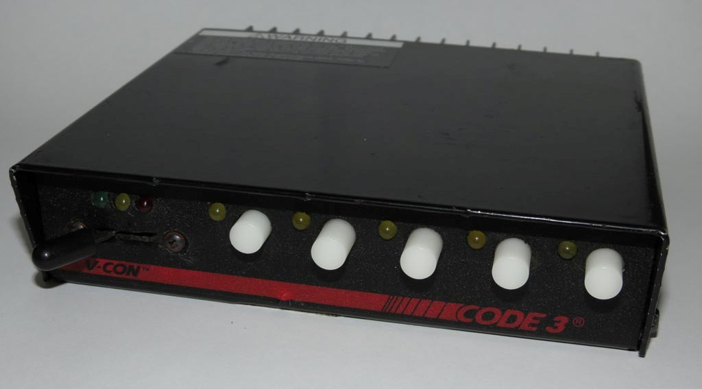 Anhang 16596 Die Schalterbox verfügt über 5 Einzelschalter und einen 4 stufigen Schiebeschalter (off, 1, 2, 3). Die einzelnen Schalter sind unabhängig voneinander schaltbar und mit jeweils bis zu 10A belastbar (Gesamt nicht mehr als 40A). Mittels des Schiebeschalters werden 3 Last-Relais angesteuert, welche jeweils mit bis zu 15A belastbar sind Gesamt nicht mehr als 40A). Die folgende Stufe wird zur bereits aktivierten zugeschaltet (0 -> 1 -> 1+2 -> 1+2+3). Die angeschlossenen Leuchten/Funktionen können also nur in der durch die Beschaltung festgelegten Reihenfolge aktiviert werden. Die Beschriftungsfelder sind Beleuchtet und der Schalltzustand wird mittels Kontrolllampen in den Schaltern bzw. mit den LEDs oberhalb des Schiebeschalters angezeigt. (Bild folgt) Auf der Rückseite befinden sich integrierte Sicherungen (für die Einzelschalter). Code3 - Model 3680 V-CON Halfpak Anhang 16411 Die Schalterbox verfügt über 4 Einzelschalter (A, B, D, E), einen Taster (B) und einen 4 stufigen Schiebeschalter (off, 1, 2, 3). Von allen Schaltern werden Last-Relais angesteuert. Die Relais A, B, D, E verfügen über eine gemeiname Zuleitung und können zusammen mit max. 20A belastet werden. Das fünfte Relais ist als Wechsler ausgelegt, hat eine separate Zuleitung und ist mit max. 20A belastbar. Mittels des Schiebeschalter werden 3 weitere Relais angesteuert, welche zusammen mit max 30A belastbar sind. Für Relais C kann mittels zweier Schalter im Inneren festgelegt werden, ob es auch vom Schiebeschalter in Pos.2 und/oder Pos.3 aktiviert werden soll. Die Tasten sind Beleuchtet und der Schaltzustand wird mittels der LEDs oberhalb des Schiebeschalters bzw. neben den Tasten angeszeigt. Anhang 16412 Auf der Rückseite befindet sich lediglich ein Schraubterminal. Code3 - Model 3681 V-CON Halfpak Anhang 16413 Die Schalterbox verfügt über 4 Einzelschalter (A, B, D, E), einen Taster (B) und einen 4 stufigen Schiebeschalter (off, 1, 2, 3). Von allen Schaltern werden Last-Relais angesteuert. Die Relais A, B, D, E verfügen über eine gemeiname Zuleitung und können zusammen mit max. 20A belastet werden. Das fünfte Relais ist als Wechsler ausgelegt, hat eine separate Zuleitung und ist mit max. 20A belastbar. Mittels des Schiebeschalter werden 3 weitere Relais angesteuert, welche zusammen mit max 30A belastbar sind. Das Relais B hat zudem einen 5-Sec. Timer und es kann mittels eines Schalters im Inneren ausgewählt werden, ob es mit oder ohne aktivierter Zündung geschaltet werden kann. Für Relais C kann mittels zweier Schalter im Inneren festgelegt werden, ob es auch vom Schiebeschalter in Pos.2 und/oder Pos.3 aktiviert werden soll. Die Tasten sind Beleuchtet und der Schaltzustand wird mittels der LEDs oberhalb des Schiebeschalters bzw. neben den Tasten angeszeigt. Anhang 16414 Auf der Rückseite befindet sich lediglich ein Schraubterminal. Bei einem Blick auf die Platine wird klar: Eine normale Schalterbox ist das nicht. Anhang 16410 Code3 – Model 3600 Sie besteht aus zwei Teilen: Anhang 14379 Zum einen aus dem Bedienteil in dem sich sämtliche Schalter und Regler befinden. Anhang 14380 Zum anderen aus dem Verstärker-Baustein in welchem sich zusätzlich zur Leistungselektronik auch die Steuerung der Haupt- und Nebenwarnleuchten sowie die Anschlußklemmen befinden. Die Sirene kann Wail, Yelp, Hi-Lo und AirHorn. Außendurchsagen, über ein angeschlossenes Mikrofon, und Funkaufschaltung sind ebenso möglich. Desweiteren kann man einen Schalter zur (Fern-)Steuerung vom AirHorn oder Manual Wail (über Schalter wählbar) anschließen. Zum Anschluß des Lautsprechers steht entweder ein 58W oder 100W Ausgang zur Verfügung. Die Impedanz des Lautsprechers sollte 11Ohm betragen! Die Steuerung der Hauptwarnleuchten erfolgt mit einem 4-stufigen Schiebeschalter (off, 1, 2, 3). Außerdem stehen noch 4 Schalter für die Nebenwarnleuchten zur Verfügung. Zusätzlich gibt es einen Schaltausgang der beim Einschalten des Gerätes aktiviert wird (z.B. Umschaltung Fzg.-Hupe auf AirHorn). Die insgesamt 8 Schaltausgänge müßen extern über Lastrelais die Leuchten ansteuern, da sich intern keine befinden. Über 2 Dip-Schalter läßt sich die Schaltweise des Schiebeschalters ändern. Standardmäßig wird die nächste Stufe dazu geschaltet ( 1 / 1+2 / 1+2+3). Zum einen besteht die Möglichkeit Stufe 2 ohne Stufe 1zu schalten ( 1 / 2 / 1+2+3) und zum anderen Stufe 3 ohne Stufe 2 ( 1 / 1+2 / 1+3 ). Oder auch beides ( 1 / 2 / 1+3). Mit einem weiterern Dip-Schalter kann man wählen, ob die Sirene nur in Stufe 3 (Schiebeschalter) oder jederzeit (unabhängig von der Stellung des Schiebeschalters) aktiviert werden kann. Anhang 16091 Kam in einem stark gebrauchten Zustand bei mir an. Der Schiebeschalter hatte keine definierten Raststellungen mehr und wurde deshalb ausgebaut und komplett zerlegt. Zum Glück stellte sich dieser Schaden (lose Lagerbuchse der Drehachse) als reparabel heraus. Der Rest bedurfte lediglich einer Reinigung bzw. leichten Auffrischung. Bei Gelegenheit (finden der nötigten Teile) müssen nur noch die Drehknöpfe ersetzt werden. Code3 – Model 3942L6 Mastercom Anhang 14377 Anhang 14378 Die Sirene kann Wail, Yelp (HyperYelp), Hi-Lo (HyperLo) und AirHorn. Ein Mikrofon für Durchsagen ist ebenso vorhanden. Als weitere Funktionen sind zu erwähnen: Funkaufschaltung, Hupenringsteuerung (AirHorn oder Manual), Abgabe eines Signaltons bei aktivierten Kennleuchten (LightAlert) und deaktivieren der Sirene beim Parken (Park Kill). Es kann ein 100W Lautsprechers angeschlossen werden. Die Impedanz des Lautsprechers sollte 11Ohm betragen! Für die Steuerung der Lampen stehen ein 4 stufiger Schiebeschalter (off, 1, 2, 3), 4 Schalter und 2 Taster (mit 8sec. Timer) zur Verfügung. Der Schiebeschalter ist pro Kontakt mit 30A belastbar (insgesamt aber nicht mehr als 50A) Die einzelnen Schalter/Taster sind jeweils mit 20A belastbar nicht mehr als 30A gesamt). 1 Taster betätigt 2 NC Kontakte zur Abschaltung der Bremslichter un