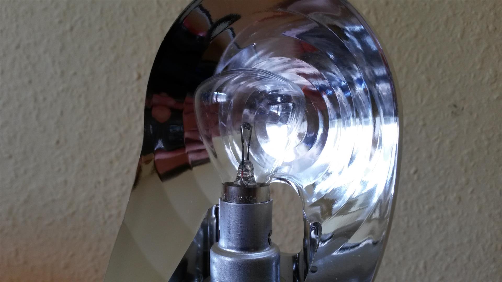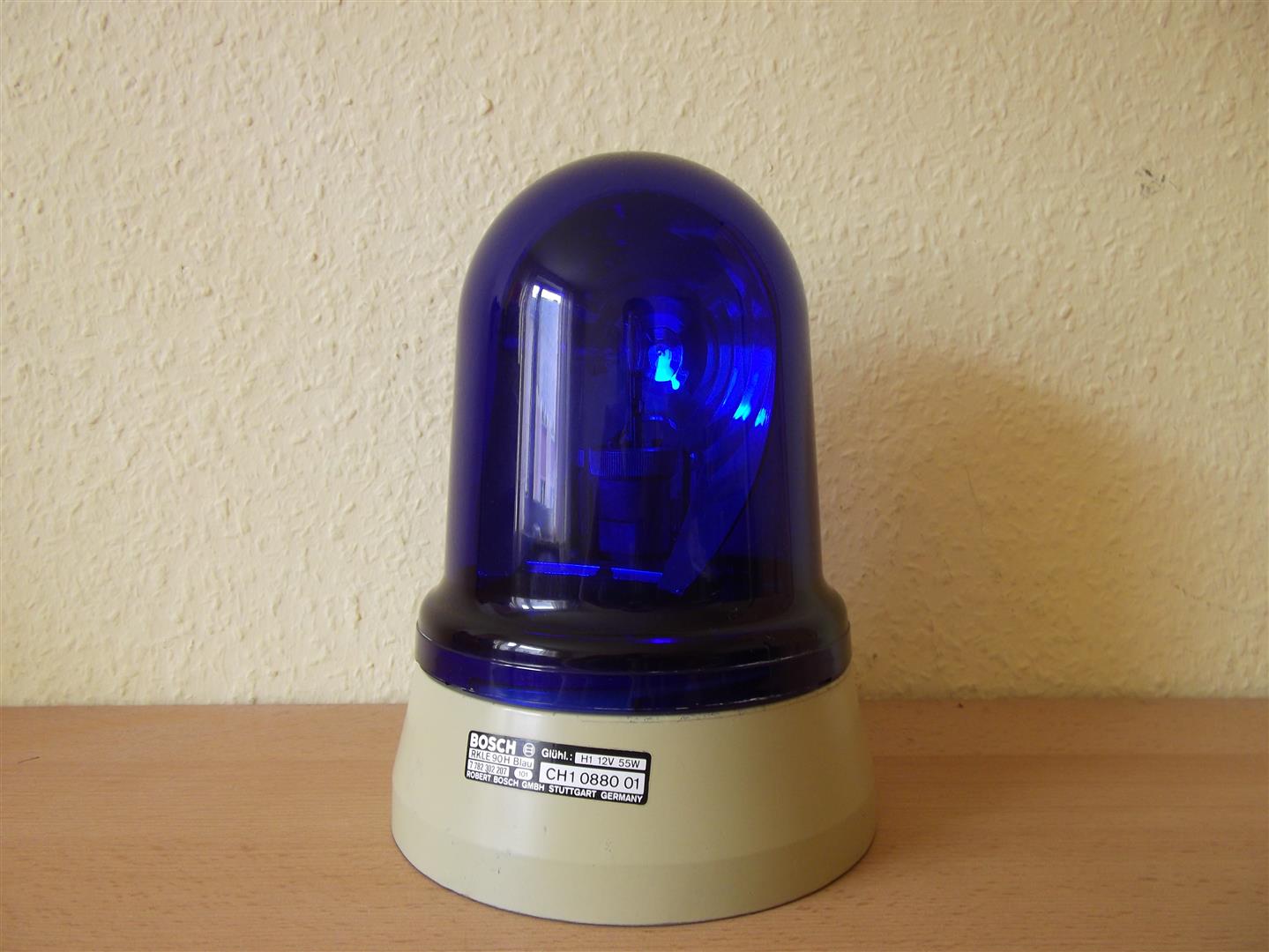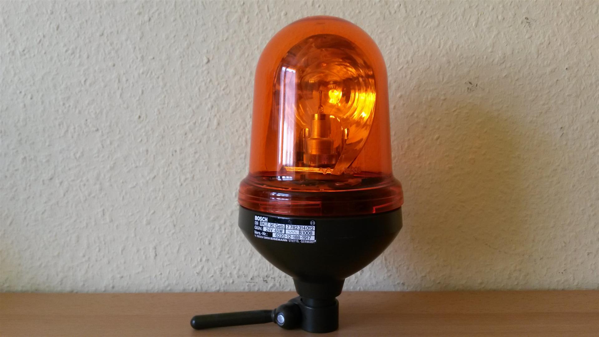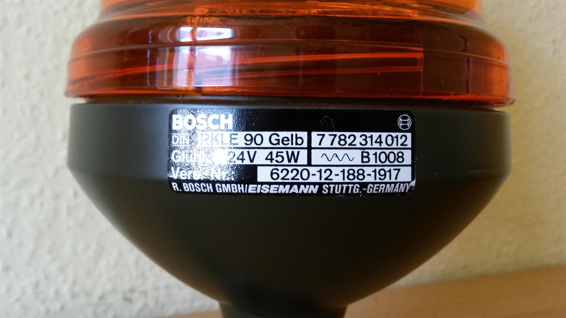 Bosch Kennleuchten Bosch RKLE 90 "Bundeswehr" Die hier abgebildete Kennleuchte ist eine RKLE 90 der Bundeswehr. Wie zu sehen, ist die Kennleuchte zur Aufsteckmontage gedacht. Die Kennleuchte befindet sich im Neuzustand und wurde neu in der Originalverpackung geliefert. Anhang 21507 Unter der Haube dreht ein Stufenspiegel, der für Bosch typisch ist, seine Runden. Der Reflektor dreht um eine U 45 Watt Normallichtglühlampe. Die Kennleuchte ist für eine Spannung von 24 Volt ausgelegt. Anhang 21509 Auf der Rückseite des Reflektors ist ein Aufkleber angebracht, der darauf hinweist, dass der Reflektor nicht von Hand gedreht werden soll / darf. Anhang 21511 Per Zahnradantrieb wird der Stufenspiegel bewegt. Anhang 21508 Das Typenschild sieht wie folgt aus: Anhang 21510 Die Zulassung auf der Haube, bzw. die Artikelnummer: Anhang 21512 Anhang 21513 http://www.bildercache.de/minibild/2...205939-358.jpg |