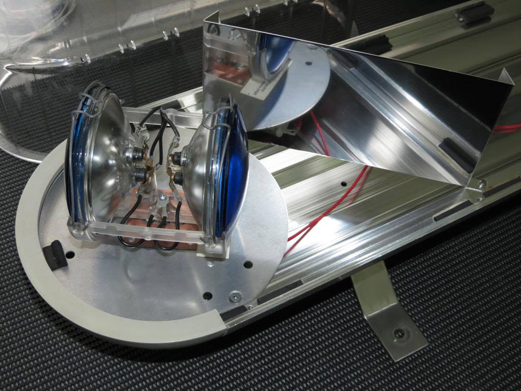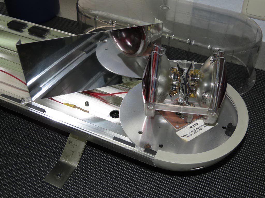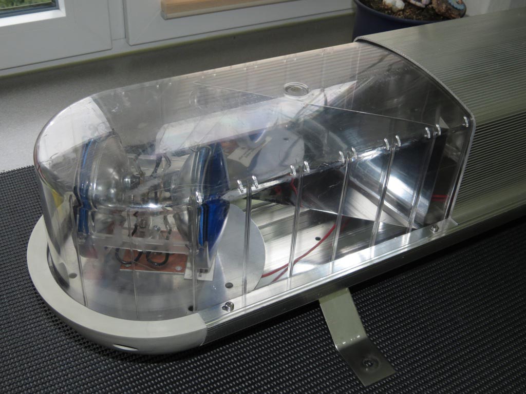 Anhang 18017 Zustand bei Erhalt: Auf den ersten Blick sah der Balken zwar noch recht ordentlich aus, aber es gab doch einige Problemzonen. Die Hauben hatten diverse kleine Risse und ein paar Sprünge und am Frame müssten einige (eigentlich fast alle) Gewinde (aufgebohrt oder bei Schraube ausbohren abgerutscht) neu gemacht werden. Einer der Lampenhalter ist leider angebrochen. Als großes PLUS seien hier die vollkommen intakten Endkappen erwähnt. Anhang 18012 vorher Was bisher geschah: Vom ursprünglichen Balken sind „nur“ die Endkappen, die mittlere Abdeckung, der Befestigungssatz und Teile der Doppeldreher. Das Grundprofil, die Hauben sowie Teile der Doppeldreher stammen von einem Spectrasystem, dass ich in eBay-Kleinanzeigen gefunden habe. Anhang 18013 der Teilespender Wegen dem noch recht guten Zustand der verwendeten Teile, habe ich es bewusst bei einer leichten (optischen) Aufbereitung (Reinigung) belassen. Die Doppeldreher sind ab Werk mit Steckanschlüssen ausgestattet. Die PAR36 Leuchten gibt es aber sowohl mit Steck- als auch mit Schraubanschlüssen. Da man nicht immer die passenden PAR36 Leuchten zur Hand hat (oder bekommt), musste ich mir bezüglich der Anschlüsse etwas einfallen lassen. Anhang 18014 Um nun auch PAR36 Leuchten mit Schraubanschlüssen (ohne an den Kabeln rumbasteln zu müssen) verwenden zu können, habe ich mir schraubbare Steckzungen (ähnl. den Terminals im StreetHawk oder VISTA) besorgt um damit die Schraubanschlüsse auf steckbar umzurüsten. Anhang 18016 Aufbau/Technik: Der Grundträger ist ein schweres, korrosionsbeständiges, Aluminium Strangpressprofil und bildet zusammen mit den Kunststoff-Endkappen eine Art Wanne. Bild siehe --> http://sosi.myds.me/forum/showthread.php?t=21853 Die Auflageflächen der Hauben und der Mittelabdeckung sind von einem erhöhten (etwa 1cm) Rand umgeben, sodass Wasser, welches von den Hauben bzw. der Mittelabdeckung herunterläuft, eigentlich nicht weiter außen abfließen kann. Ist also die Abdichtung der Hauben/ der Mittelabdeckung i.O. bleibt das Wasser dort stehen und falls nicht läuft es zwangsläufig ins Inneren des Balkens. Aber anscheinend wurde der Abdichtung bei der Army-Version keine große Beachtung zu teil. Gibt nämlich keine. Es ist auch nicht erkennbar das da mal eine war. Die Hauben werden von jeweils zwei Alu-Leisten gehalten. Die einteilige Mittelabdeckung wird mit 4 Schrauben am Grundträger fixiert Die Lampenhalter sind aus Kunststoff und haben (anders als bei der Alu-Ausführung) zwischen den Aufnahmepunkten der Haltebügel noch zusätzliche Streben. Jeder Dreher hat seinen eigenen Motor, welcher über ein Schneckengetriebe die Drehachse antreibt |