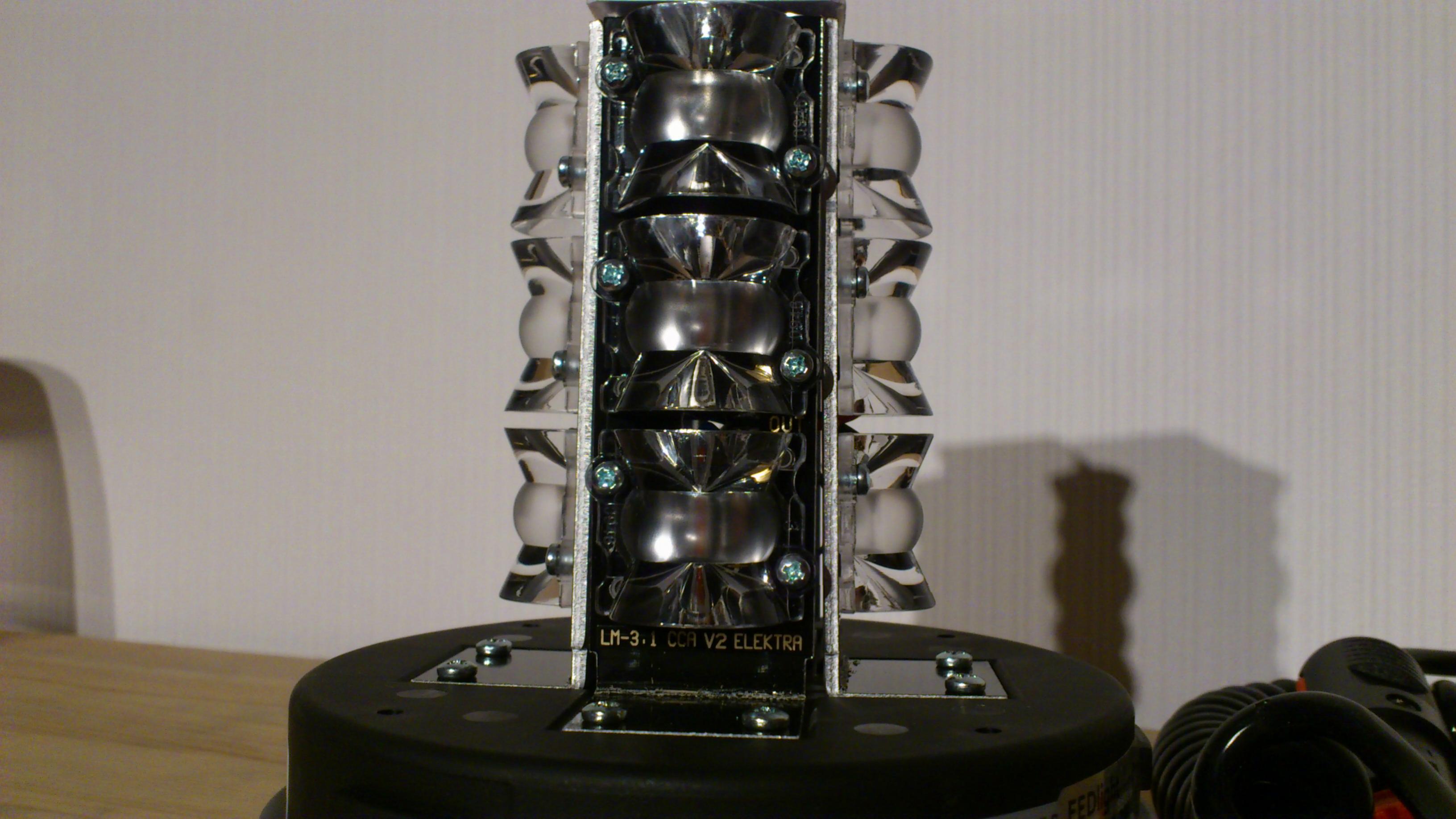 Die Leuchte ist für 12 und 24 Volt Betriebsspannung ausgelegt. Die Stromversorgung erfolgt über ein Spiralkabel mit Glattanteil an der Leuchte. Unausgezogen ist es ca. 105 cm lang, am Ende ist ein Universalstecker angebracht. Anhang 18854 Die Typenschilder sind am am Gehäuse in Form von Aufklebern angebracht und unter der Lichthaube gut lesbar. Angaben zum Hersteller: Anhang 18855 Die e- und ECE-R65 Zulassung: Anhang 18856 Angaben zum Hersteller und dem Produktionsdatum (29.03.2014): Anhang 18857 Die Lichthaube ist durch drei Aufnahmen mit dem Gebäuse verbunden und lässt sich nach dem Entfernen der Sicherungsschraube durch eine kurze Drehung gegen den Uhrzeigersinn abnehmen. Anhang 18860 Oben auf der Lichthaube wiederholt sich die ECE-R65 Zulassung "TA1 E20 [im Kreis] 001323". Weiter fällt auf, dass die Lichthaube nach oben nicht klar, sondern milchig / trübe ist. Anhang 18859 An der Unterseite des Leuchtengehäuses sind unter dem schwarzen Kunststoff vier runde Magneten erkennbar. Sie halten die Leuchte lt. Hersteller bis zu einer Geschwindigkeit von 280 km/h. Anhang 18858 Nach dem Entfernen der Lichthaube ist die Lichtquelle der Leuchte erkennbar. Jeweils drei LED mit einer Linse sind übereinander im 90° Winkel angeordnet. Anhang 18861 Drei Linsen sind jeweils an einem L-förmigen Träger angebracht. Unter der untersten Linse ist "LM-3.1 CCA V2 ELEKTRA" zu lesen. Auf diesem Bild ist deutlich erkennbar, dass die Linsen im mittleren Bereich nicht klar sind, sondern eher milchig / undurchsichtig. Anhang 18862 An der Oberseite sind die Träger mit einem viereckigen Metallstück verbunden, das für Stabilität und vermutlich auch Wärmeableitung sorgt. Anhang 18863 Nach dem das Metallstück oben abgebaut und die Verschraubung zweier Träger am Leuchtengehäuse gelöst wurde, ist erkennbar, dass jeweils drei LED zu einer Baugruppe zusammengefasst sind und die vier Gruppen augenscheinlich in Reihe geschaltet sind. Anhang 18864 Weiter lässt sich die LBL-20K1N leider nicht zerlegen, so dass der Blick auf die Platine im Gehäuse verborgen bleibt. Mit einer Höhe von 140 mm und einem Durchmesser von 120 mm ist die LBL-20K1N sogar noch etwas kleiner als die Movia D LED. Die Leuchtfläche beider Leuchten dürfte jedoch annähernd gleich groß sein. Anhang 18867 Hier ein Vergleich der Linsen beider Leuchten. Anhang 18865 Meine LBL-20K1N leuchtet orange, das Signalbild ist ein schneller Vier(?)fachblitz, gefolgt von einer längeren Pause. Anhang 18868 Auch eine gewisse Mißweisung lässt die LBL-20K1N zu, jedoch lässt die Wahrnehmbarkeit des Signals außerhalb des Fokus schnell deutlich nach. Anhang 18869 Ein interessanter optischer Effekt ist mir noch aufgefallen: Auf kurze Entfernung wirkt das Signalbild wie ein Blinken, aus der Entfernung ist der Vier(?)fachblitz deutlicher erkennbar. Ich habe mich bei der Anschaffung dieser Leuchte bewusst für das Modell mit der klaren Lichthaube entschieden, da sie mir optisch besser gefiel. Nachdem ich bereits eine LBL-20K1N mit oranger Haube in freier Wildbahn erlebt habe, muss ich nun für mich feststellen, dass mit der klaren Haube die Warnwirkung deutlich besser erscheint. |