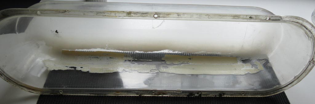 Das es mitunter Eng zugeht, ist Timing alles! Anhang 19731 Anhang 19732 Zustand bei Erhalt: Die Haube wurde mal teilweise von innen lackiert und hat zwei Sprünge. Ist zwar ärgerlich aber zumindest ist die Haube da und die Schadstellen sind oberhalb der Leuchten, sodaß man sie durch lackieren der Oberseite (wäre ja nicht unüblich) etwas kaschieren könnte (wenn man denn wollte). Da der allgemeine Zustand für das Alter doch noch recht gut ist (abgesehen von der Haube), werde ich den Zustand wohl lediglich bewahren. Außer den beiden Sprüngen hat die Haube noch einen leichten Hitzeschaden. An einer Stelle (Mitte rechts vorn) ist sie etwas verformt und an zwei anderen ist eine leichte Blasenbildung zu sehen. Von der eigentlich 4-teiligen Haubedichtung fehlt ein gerades Stück. Da die vorhandenen Teile etwas geschrumpft sind (Schraubenlöcher passen nicht mehr) ist das nicht weiter schlimm. Müßten eh neue angefertigt werden. Anhang 19735 Was bisher geschah: Nachdem der erste Probelauf nicht sehr erfolgreich verlief (der Motor zuckte kurz und die Lampen gingen an), hab ich mir das ganze mal etwas genauer angeschaut. Anhang 19380 Anhang 19379 Die gute Nachricht ist: Der Motor ist i.O. (lief Solo problemlos) Durch das alte zähe/klumpige Graphitfett war ein zerlegen der Mechanik unumgänglich. Alle Einzelteile wurden zunächst vom alten Fett befreit und auch ansonsten nur gereinigt. Die Lagerbuchsen weisen zwar etwas Spiel auf, da sie aber eingekörnt und geklebt sind habe ich von einem erneuern erst einmal abgesehen. Da einige Kabel mal zwischen Grundplatte und Gehäuse eingequetscht waren, hab ich die Verkabelung erneuert. Anhang 19730 Nach den Kleben der Brüche/Sprünge ging es ans schleifen und polieren der Haube. Und zwar von außen und innen. (das durchgehärtete Gewebeklebeband ließ sich ganz phantastisch schleifen) :kotz: Aufbau/Technik: Das Gehäuse (unten offen) besteht aus Alu-Guss. In ihm wird die Grundplatte mit der gesamten Mechanik eingelegt und mit 6 Schrauben befestigt. Die Haube wird zusammen mit dem Zierring am Gehäuse mit 8 Schrauben gesichert. Die Haubendichtung besteht aus 4 Teilen und wird durch Kleber auf dem Gehäuse fixiert. Anhang 19728 Alle 5 Leuchten werden von einem Motor angetrieben. Die beiden äußeren werden über Zahnstangen und die 3 inner mittels Hebelarmen bewegt, wobei zwei der mittleren Leuchten ihren Drehpunkt direkt in der Zahn-/Schubstange haben. |