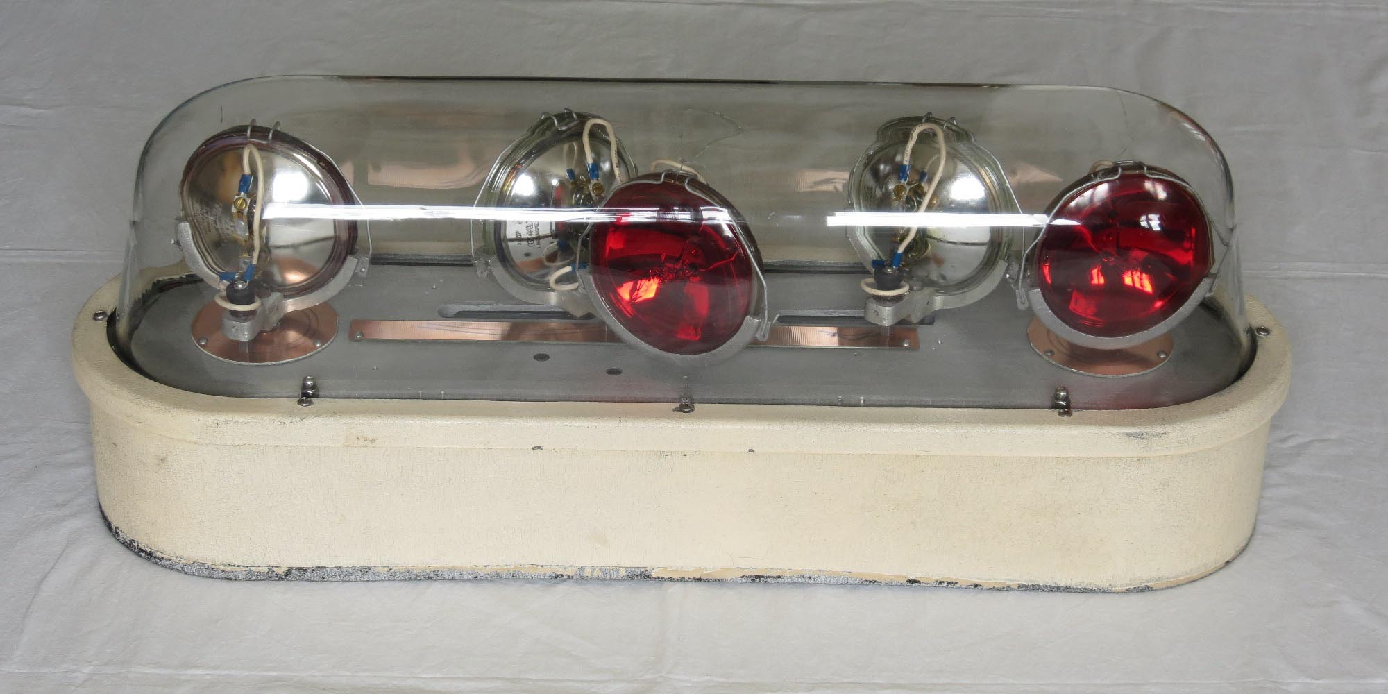 MARS SIGNAL LIGHT COMPANY - Aurora Borealis Model 500, 12V, Serial No. 438 Anhand des schwarzen Typenschildes und der rauen Gehäuseoberfläche (die späteren waren poliert) kann man erkennen, das es sich um eines der frühen Modelle handelt (zumindest was den Sockel betrifft). Die ersten AB hatten noch federbelastete Blechstreifen (anstelle der Drahtbügel), die mittels kleiner Stift gesichert waren. Die Nummer auf der Grundplatte müßte eigentlich mit der Serien-Nr. übereinstimmen, was sie aber leider nicht tut. Das, die neueren Drahtbügel und ein nachträglich vor der Serien-Nr. eingeschlagenes R lassen mich daran zweifeln, dass die AB so Erstausgeliefert wurde. (was mir aber ehrlich gesagt völlig egal ist) Meine Vermutung: Entweder wurde die AB mal Überholt und im Zuge dessen Teile durch neuere ersetzt, oder es wurde einfach aus mehreren Leuchten eine relativ gute zusammengesucht. Die AB kann in zwei Stufen angesteuert werden: Mit der Stufe eins werden die beiden äußeren (roten) Leuchten zusammen mit der nach hinten gerichtetet (ebenfalls roten) Leuchte eingeschaltet. Natürlich incl. Motor. In der zweiten Stufe folgen dann die beiden nach vorn gerichteten (weißen) Leuchten. Anhang 19733 Anhang 19734 Maße (circa):