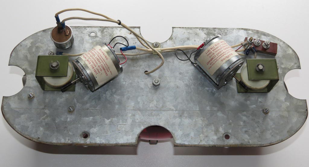Abgesehen von dem fehlenden Zierring, einer fest sitzenden Schraube/defekten Gewinde ist die Leuchte für ihr Alter noch gut beieinander! Klar gibt es ein paar Kratzer und an einigen Stellen blättert der Chrom aber das hält sich in Grenzen. Selbst die Haube scheint noch die ursprüngliche (originale) zu sein. Sie hat nämlich an den Stirnseiten (anders wie die Hauben bei den Spectrasystemen) keine nach außen hin offenen Langlöcher, sondern geschlossene. Die verbauten roten PAR36 Leuchten sind teilweise vom falschen Typ (7400R) Anhang 19721 Was bisher geschah: Die bisherigen Arbeiten beschränkten sich auf das Reinigen und dem überprüfen/instandsetzen der Verkabelung, sowie den Austausch der falsche PAR36 Leuchten. Die Haube wurde an der Rückseite noch mit roten Farbfiltern ausgestattet. Damit die Dreher genügen Platz haben um arbeiten zu können, ruht die Haube vorerst auf Abstandshaltern. Bliebe noch das anfertigen der fehlenden Haubendichtung und viel wichtiger, das Suchen (und hoffentlich auch finden) des fehlenden Zierrings. Aufbau/Technik: Das Gehäuse, obwohl es verchromt ist, besteht aus Kunststoff. In ihm wird die verzinkte! Grundplatte, auf der die gesamt Technik montiert ist, eingelegt und mit 4 Schrauben befestigt. Die Haube wird zusammen mit dem Zierring (fehlt hier leider :() am Gehäuse mit 6 Schrauben gesichert. Die Farbfilter werden einfach von unten zwischen die Stege auf der Haubeninnenseite geschoben. Die Dreher und die Motoren sind separat an der Grundplatte verschraubt. Zudem sind die Motoren schwenkbar, sodass man den Abstand zwischen Schnecken- und Zahnrad einstellen kann. Anhang 19722 Durch die gespiegelte Anordnung (einmal rechts und einmal links vom Zahnrad) der Motoren drehen sich die Lampenhalter gegenläufig. Der Halter der Blinkleuchten ist mit denen der Doppeldreher identisch, nur das hier die Halterung für den Schleifkontakt abgesägt wurde. |