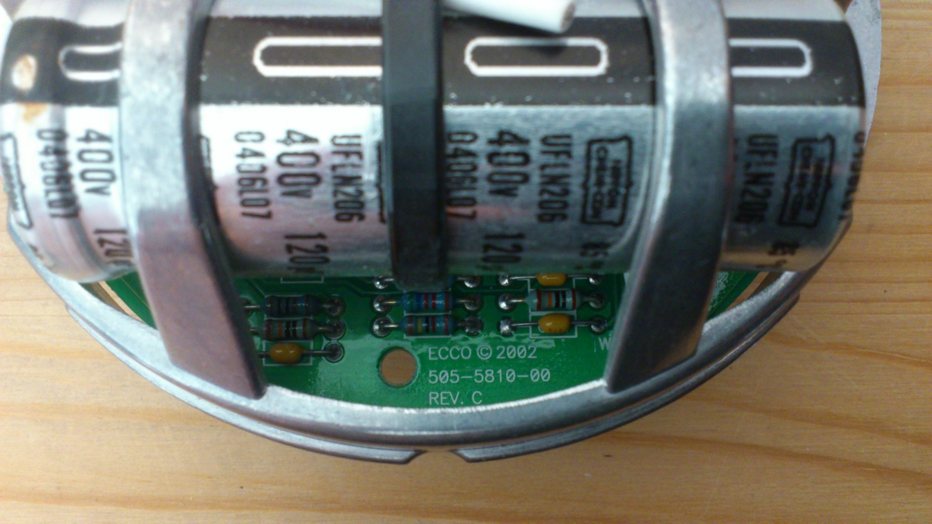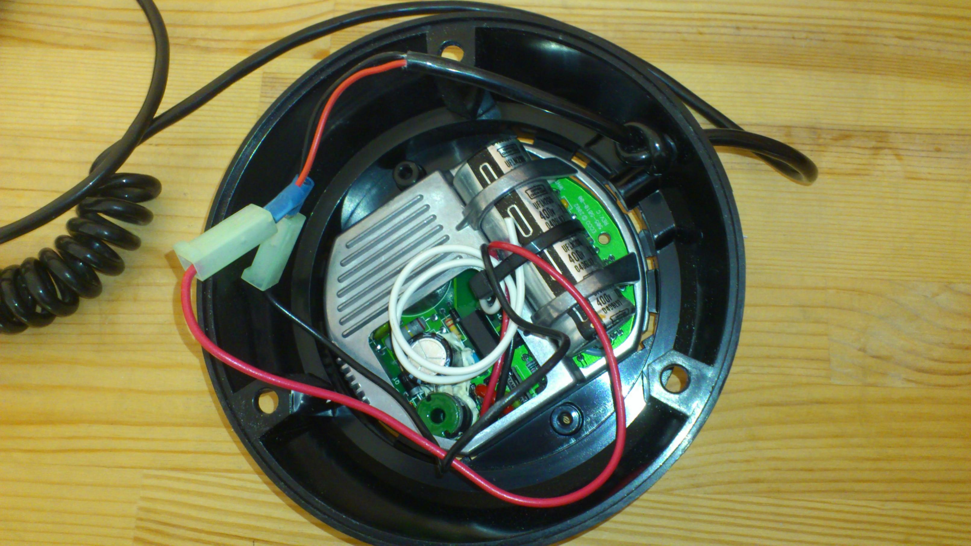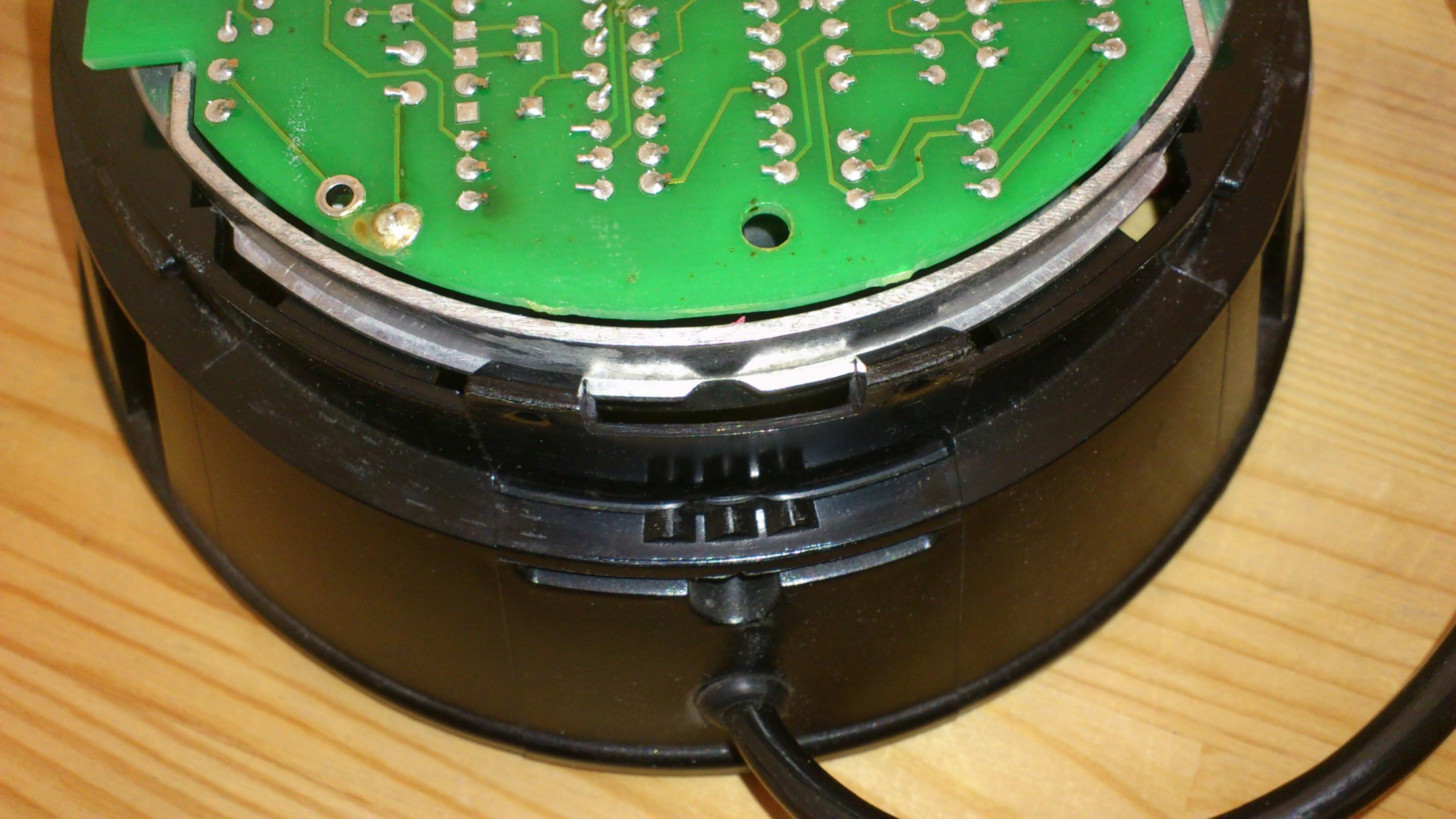 Die Stromversorgung erfolgt durch ein Spiralkabel mit je einem knapp 25 cm langen Glattanteil an beiden Enden und einem Universalstecker. Die Leuchte ist für Betriebsspannungen von 10 bis 48 Volt ausgelegt. Anhang 19772 Lt. Hinweisschild wird die Leuchte mittels des Magnet-Saugers bis zu einer Maximalgeschwindigkeit von 112 km/h gehalten. Anhang 19774 Die Lichthaube ist als Fresnelllinse ausgestaltet und auf Grund der außenliegenden Riffelungen sehr griffig. Oben auf der Haube findet sich der VISION ALERT-Schriftzug, die Zulassung "B1 E11[im Kreis] 000051" so wie die Materialbezeichnung der Haube ("PC") mit einem Recyclingsymbol. Anhang 19775 Da ich seinerzeit gerne eine grüne Leuchte haben wollte, wurde kurzerhand eine grüne und eine gelbe Haube beschafft. Diese haben allerdings keine Zulassungsnummern aufgedruckt. Anhang 19779 Anhang 19780 Auf der Leuchte selbst findet sich ein Typenschild, das augenscheinlich mit einem Beschriftungsgerät nachgemacht wurde. Die "510.1D0" deutet jedoch auf eine Leuchte der 500 Series hin, die eine etwas höhere Lichthaube besitzen. Da Blitzröhre und Fresnell jedoch in der 400er Höhe zusammenpassen neheme ich an, dass meine Leuchte eine 400er mit 500er-(Nachbau)Schild ist. ;) Anhang 19773 Nach dem Entfernen der Lichthaube ist die Oberseite der Platine und die gesteckte Blitzröhre sichtbar. Lt. Aufdruck ist die Platine vom 25. Februar 2004. Anhang 19776 Mit leichtem Druck links und rechts lässt sich die Röhre aus der Fassung herausziehen. Anhang 19777 Die Röhre ist mittels einer Nase am mittleren Kontakt so gestaltet, dass sie nicht verkehrt herum eingesetzt werden kann. Anhang 19781 Um in eine Blick in die Leuchte zu werfen muss der Magnet-Sauger vom Gehäuse abgebaut werden. Dazu löst man die drei Schrauben an der Außenseite der Leuchte. Anhang 19782 Nun ist der Blich von unten frei und man erkennt ein grau-silbernes Alu-Gehäuse, in dem die grüne Platine befestigt ist. Weiter die Zugentlastung des Kabels - ein Knoten. Anhang 19783 Um das Alu-Gehäuse auszubauen müssen die beiden Schrauben oben auf der Platine nicht gelöst werden - die Platine und das Alu-Gehäuse sind irgendwie zusätzlich miteinander verbunden (verlötet?)! Stattdessen sollte mit viel Gefühl die Platine aus den beiden Rastnasen am Gehäuse gelöst und dann Alu-Gehäuse und Platine nach oben aus dem Gehäuse genommen werden. Anhang 19784 Blick von der Seite auf das ausgebaute Alu-Gehäuse mit Platine und Elko. Anhang 19786 Man erkennt an den Rippen, dass das Alu-Gehäuse zur Wärmeableitung dient. Weiter ist daran ein Elko zur Erzeugung der Hochspannung verbaut. Anhang 19785 Weiter erkennt man auf diesem Bild die Aufschrift der grünen Platine. Anhang 19787 Fazit: Solide aufgebaute und helle Doppelblitzleuchte mit ECE-R65 Zulassung. Auf Grund der Haftkraft des Magnet-Saugers eignet sie sich nicht für Hochgeschwindigkeitsfahrten. Das Blitzsignal ist gut sichtbar und die Lichthaube wird voll ausgeleuchtet. |