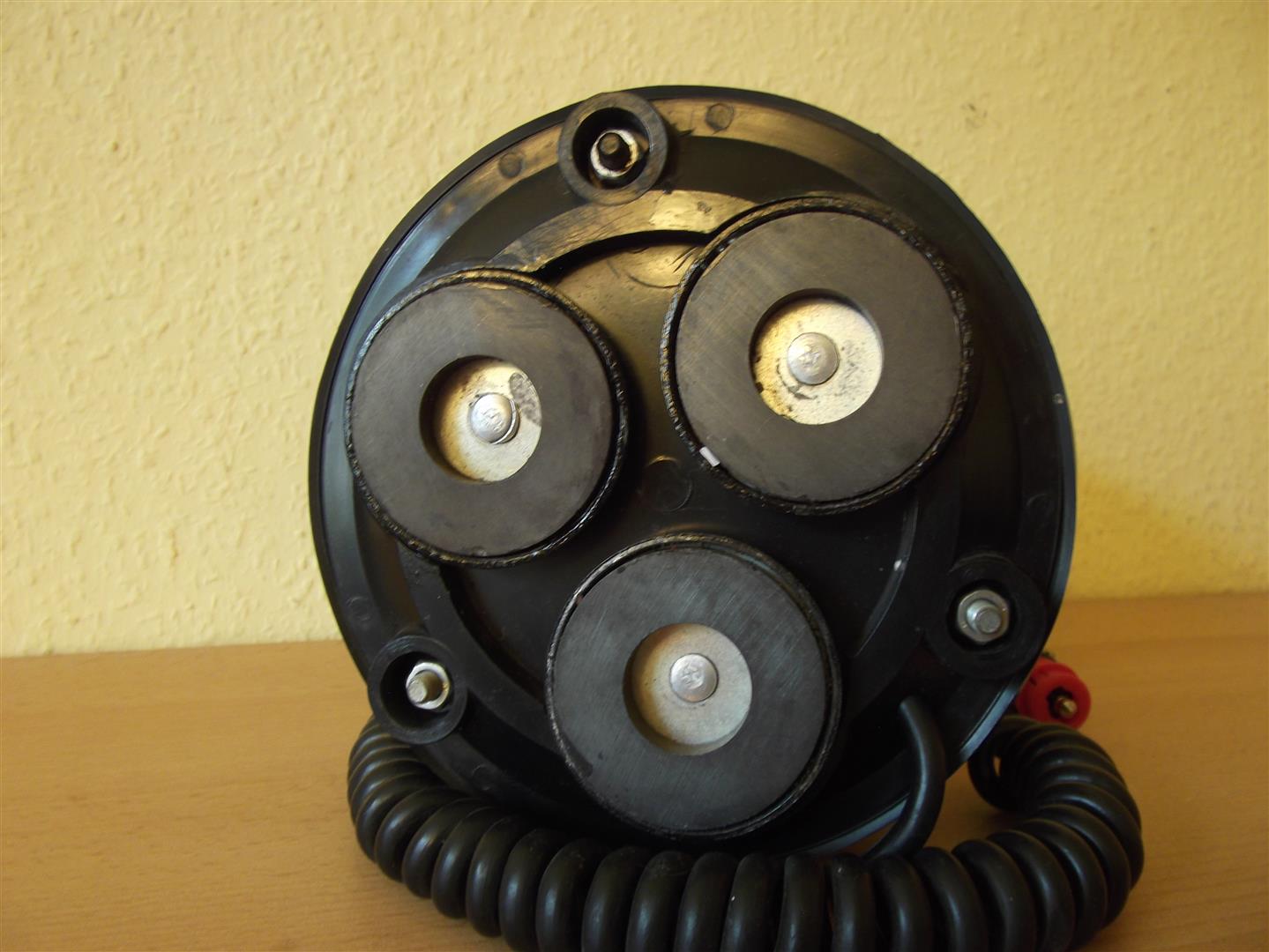 Aric Kennleuchten CEM FG 300 Hierbei handelt es sich um eine recht große Magnetkennleuchte. Diese Kennleuchte stammt aus italienischer Produktion. Umgelabelt wurde die Leuchte wohl von der Firma "CEM". Die genaue Modellbezeichnung ist mir leider nicht bekannt, ich vermute, dass die Kennleuchte die Modellbezeichnung FG 300 trägt. Anhang 21483 Wie man sieht, hat die Leuchte eine zitronengelbe Lichthaube, keine orange Lichthaube. In Italien war es früher üblich, dass Rundumkennleuchten zitronengelbe Lichthauben hatten. Die KL 710 von Hella gab es beispielsweise auch mit zitronengelber Haube für den italienischen Markt. Als Leuchtmittel kommt eine 21 Watt Glühlampe zum Einsatz. Um diese dreht sich ein mattierter Blechspiegel, welcher auf einem Drehteller angebracht ist. Der Drehteller wird von einem Riemen angetrieben. Anhang 21485 Die Warnwirkung ist aufgrund des Leuchtmittels und des Reflektors nicht wirklich gut. Erwähnenswert ist noch, dass diese Kennleuchte auch bei 12 Volt nur 90 Umdrehungen pro Minute hat. Nicht nur die zitronengelben Lichthauben waren früher in Italien üblich, sondern auch die langsame Drehgeschwindigkeit der Kennleuchten. Auf dem Drehteller ist ein kleines Typenschild angebracht. Anhang 21486 Die Zulassungsnummern sind in die zitronengelbe Lichthaube eingepresst worden. Anhang 21484 Da es sich um eine Magnetkennleuchte handelt, erfolgt die Stromzufuhr natürlich über ein Spiralkabel mit Zigarettenanzünderstecker. Auf dem Dach gehalten wird die Leuchte von drei beweglich gelagerten Magneten. Nach dem Lösen der drei Muttern kann die Magnetplatte entfernt werden. Anhang 21487 |