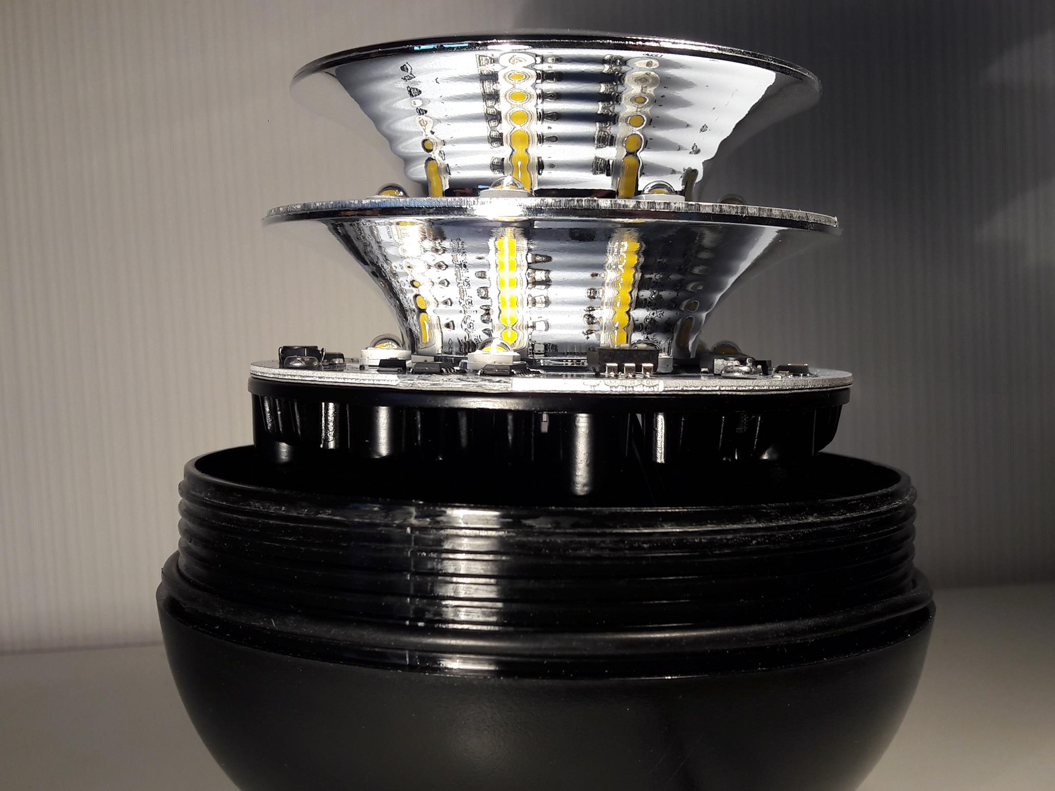 Anhang 24997 Auf den ersten Blick hat diese Leuchte große Ähnlichkeit mit der bereits vorgestellten FKS-Rundumleuchte mit Magnetfuß. Zu den Gemeinsamkeiten und Unterschieden jedoch später mehr. Die Stromversorgung erfolgt über ein relativ dünnes und bei größerer Zugbelastung zum ausleiern neigenden Spiralkabel mit Universalstecker. Hervorzuheben sind die Glattanteile stecker- und leuchtenseitig. Anhang 24998 Durch fünf runde Magneten, die unter einer schwarzen Folie verborgen sind, und eine Art Sauglippe wird die ca. 620 Gramm schwere Leuchte auf Stahlflächen und anderen magnetischen Untergründen gehalten. Hinweise auf die zulässige Höchstgeschwindigkeit oder andere Angaben sind an der Leuchte nicht vorhanden. Der Aufkleber deutet jedoch auf das Produktionsdatum (7/2016) hin. Anhang 24999 Die Lichthaube ist durch sechs Stege (innen erhaben) unterteilt und mit einem Innengewinde auf das Leuchtengehäuse geschraubt. Auf der Lichthaube befindet sich ein silberner Aufkleber, der auf die Fahigkeit zur Verwendung von 12 und 24 Volt Betriebsspannung hinweist. Weiter sind hier die Zulassungsnummern, Hinweise auf die Betriebsspannung und das Leuchtmittel kreisförmig angeordnet zu finden: "12V/24 V" "16W" "YL" "TA1 E9[im Kreis] 00.1653" "E9[im Kreis] 10R-05.1905" "LED" Anhang 25000 Lichthaube von oben, ohne Leuchte / spiegelnden Untergrund. Anhang 25001 Nach dem Entfernen der Lichthaube ist der Blick auf das Gewinde für die Lichthaube mit einem Gummiring (zur Abdichtung) und die zwei Decks mit den LED frei. Anhang 25004 Insgesamt 8 LED pro Deck leuchten nach oben. Durch einen verspiegelten, pilzförmigen Reflektor darüber wird das Licht seitlich abgelenkt. Anhang 25002 Die Leuchte verfügt über drei Leuchtmodi (Drehsimulation, einfaches Blinken und Achtfachblitz). Sie können durch betätigen eines der drei Dip-Schalter ausgewählt werden. Die gezeigte Schalterposition (1) schaltet die Drehsimulation. Anhang 25003 Im direkten Vergleich mit der Drehspiegelleuchte von FKS fällt die Gleichheit der Hauben- und Gehäuseform auf. Jedoch ist der Magnetsauger der LED-Leuchte etwas hochbeiniger angebracht. Anhang 25005 Auch die Zulassungsnummern auf den Hauben unterscheiden sich. Die FKS-Leuchte verfügt zudem über kein Gewinde in der Haube, sondern Stege. Ein Haubentausch ist damit nicht möglich. Anhang 25006 Die hier vorgestellte LED-Leuchte macht eine ganz ordentliche Drehsimulation - im Vergleich zur FKS-Leuchte und im Low Budget-Bereich. Das Einzelblinken ist wenig aufregend, jedoch ausreichend hell. Der Achtfachblitz verbreitet ein hektisches, jedoch auf Distanz schwächelndes Signalbild. Abseits des Dauer- und Profieinsatzes hat diese Leuchte, außerhalb von Autobahnen und Schnellstraßen, sicher ihre Berechtigung und wird Abnehmer finden. Hier ein Video mit den drei Blitzmustern: <iframe src="https://www.youtube.com/embed/58fvy_HXngo" allow="autoplay; encrypted-media" allowfullscreen="" width="560" frameborder="0" height="315"></iframe> |