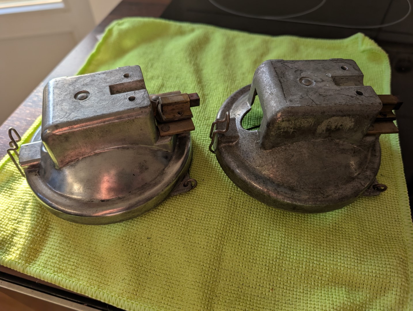 Anhang 29921 Da eine kompetente Fachkraft die Leuchte kopfüber verpackt hat und somit die Haube sämtliche Stöße abfedern durfte, hat sich diese leider etwas übernommen und spaltete sich. Da sie vorab eh schon ziemlich hinüber war, bin ich da weniger traurig drüber. Schlimmer ist, dass der Motor sich nicht zuckt. Das wird eine entscheidende Aufgabe sein. Immerhin habe ich einen Teil erstattet bekommen, so dass die 14er nun inkl. Versand 66€ gekostet hat... Zwischenzeitlich habe ich die Leuchte zerlegt und gereinigt. Anhang 29922 Anhang 29923 Anhang 29924 Anhang 29925 Bei dem linken Teil werde ich noch mal nachpolieren, da sind noch Flecken drauf. |