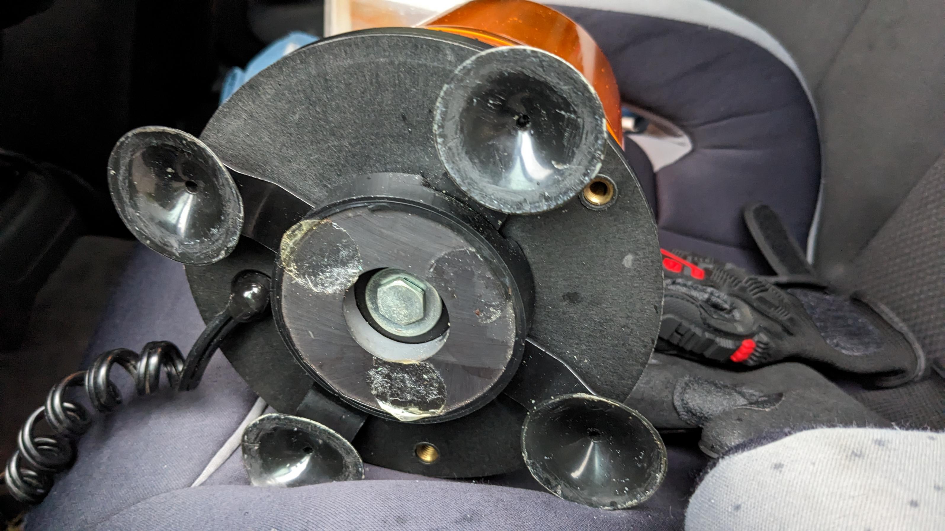 So, jetzt habe ich endlich einmal den Fuß genauer betrachten können. Der Magnet wird gar nicht mit der Verschraubung gehalten, sondern wird nur mit seiner magnetischen Kraft an dem Kreuz für die Saugnäpfe gehalten. Rein theoretisch könnte es passieren, dass beim Abnehmen der Leuchte der Magnet auf dem Fahrzeugdach bleibt, oder die Leuchte während der Fahrt die Rückreise antritt. Wenigstens einkleben hätte man den Magnet müssen.