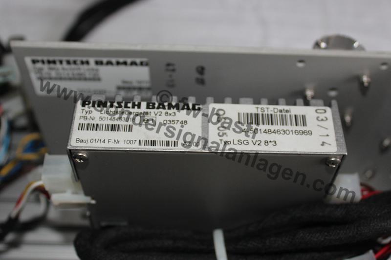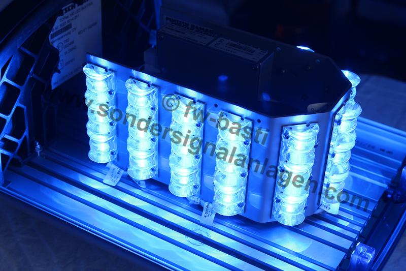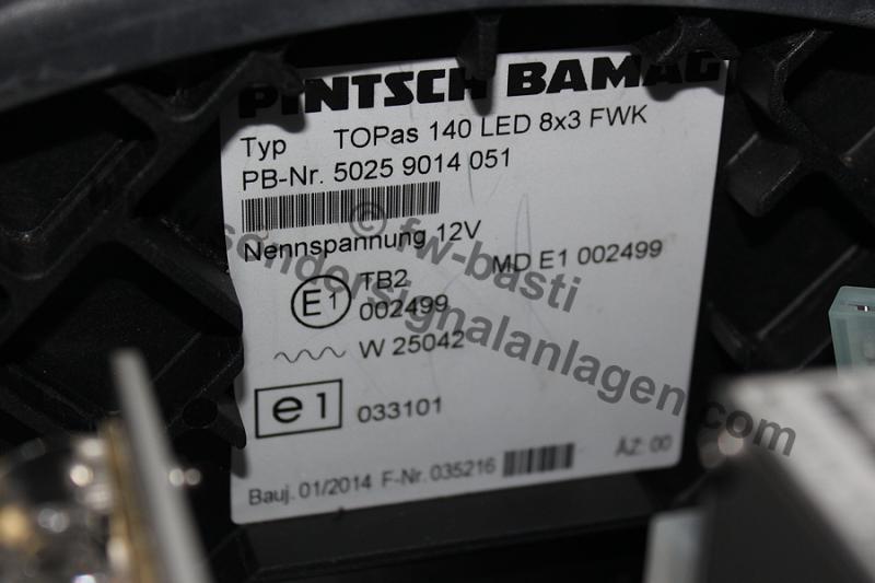 Anhang 28086 Das Typenschild der TOPas, welches alle der wichtigen Informationen beherbergt. Allerdings weiß ich nicht, wofür das FWK am Ende steht, vielleicht kann hier ein Pintsch Bamag Spezialist weiterhelfen? Anhang 28087 Wie der Name schon verrät sind pro Seite insgesamt 8 LED Platinen mit je 3 LEDs als Hauptkennleuchte verbaut. Die Platinen sind identisch zu den bekannten 4x3 oder 5x3 LED Modulen, lediglich der Metallhalter wurde angepasst. Anhang 28088 Jedes 8x3 Modul besitzt ein eigenes LSG, um die insgesamt 24 LEDs anzusteuern. Anhang 28089 8x3 Modul im eingeschalteten Zustand. Durch die Zusatz LEDs die direkt nach vorne leuchten wird ein schönes und kräftiges Leuchtbild erreicht. Anhang 28090 Die beiden Hauptmodule sind aktuell miteinander synchronisiert, ein asynchroner Betrieb wäre jedoch auch möglich. Anhang 28092 Angesteuert wird der Balken über ein BT 121 F/N, welches ich im Lager liegen hatte. Das Bedienteil ist im Kasten komplett verkabelt, sodass nur der balkenseitige Kabelsatz an der Rückseite angesteckt werden muss. Eine Umschaltung auf das Kompressorsignal ist im laufenden Betrieb jederzeit über die Taste möglich. Die Frontblitzer können ebenfalls separat zugeschalten werden. Anhang 28091 Zum Abschluss das komplette Set, wie es in der Sammlung betreibbar ist. Die Nanos sind im Regal am Brett des Balkens befestigt und können mit betrieben werden. Das Set an sich gefällt mir sehr gut, ich habe es auch bewusst relativ schlicht gehalten und nichts am Balken verändert, außer den beiden Schriftzügen. |