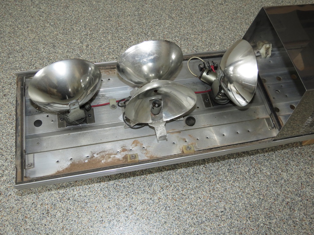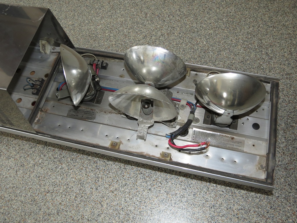 Wie es der Zufall so wollte hatte ich noch aus einem Schlacht XL zwei stationäre Doppelreflektor die eigentlich in einen SD gehören. Also wurden die Spiegel durch diese stationären Reflektoren ersetzt. Und auch die defekten Haltewinkel wurden ersetzt. Da ich noch nicht sicher bin wie er schlussendlich Aussehen soll habe ich mich bezüglich der Haubenfarben noch nicht festgelegt. Ansonsten muß er nur mal ordentlich geputzt werden. Fortsetzung folgt ... Aufbau/Technik: Die Basis bildet ein Alu-Profil welches auf der Unterseite mit zwei (der Länge nach verlaufenden) Nuten zur variablen Befestigung der Montagefüße versehen ist. Die einzelnen Komponenten werden direkt auf dem Alu-Profil befestigt. Die Hauben werden außen von den (mit den Typenschildern versehenen) Endkappen und innen von jeweils 2 Klemmwinkel und/oder der LSP-Abdeckung gehalten. Die Leuchtenmodule (Drehspiegel, Flasher etc.) werden direkt auf den Grundträger geschraubt. |