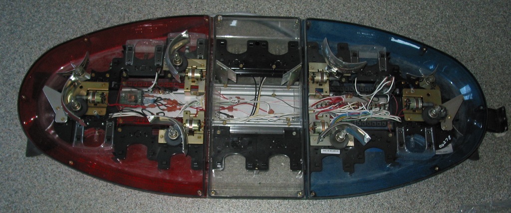 Anhang 28543 Anhang 28544 Als Besonderheit sei hier erwähnt, daß die Gehäuseunterteile (genauso wie die Hauben) rot/blau gefärbt sind. Deshalb sind auch keine weiteren Farbfilter verbaut, sondern lediglich klare Streulinsen (bei Flasher und SteadyBurn). Da es beim Vista (im Gegensatz zum MX7000 von Code3) nicht möglich ist 2 Intersection-Lights pro Seite (vorn und hinten) zu montieren, wurden hier anstelle der hinteren Intersection-Lights jeweils 2 Rear-Flasher und flashing Alley Lights verbaut. Zustand bei Erhalt: Der Balken hat den Transport, abgesehen von der blauen Haube, gut überstanden. Auch bei diesem Vista ist, wie auch schon beim ersten Halogen-Vista, ein Drehspiegelreflektor gebrochen und ich frage mich immer noch wie sowas geht. Anhang 28545 Anhang 28546 Was bisher geschah: Die defekte blaue Haube und der zerstörte Reflektor wurden durch gute Gebrauchtteile ersetzt sodass der Balken wie voll funktionstüchtig ist. Eine gründliche Reinigung steht noch aus! Fortsetzung folgt ... Aufbau/Technik: Die Basis besteht aus einem stranggeprssten Alu-Profil, welches auf der Unterseite mit zwei (Der Länge nach verlaufenden) Nuten zur variablen Befestigung der Montagefüße versehen ist. Die unteren Gehäuseteile werden direkt am Grundträger befestigt. An ihnen werden sowohl die Leuchtenträger als auch die Hauben befestigt. Die Hauben werden jeweils mit 5/4 (Außen/Mitte) Schrauben an den unteren Gehäusehälften befestigt. Die Leuchten der unteren Ebene sind nur am Leuchtenträger, die Drehspiegel sind am Leuchtenträger und teilweise zusätzlich noch am Frame befestigt wohin gegen die Diamant-Spiegel in den äußeren Hauben befestigt sind. |