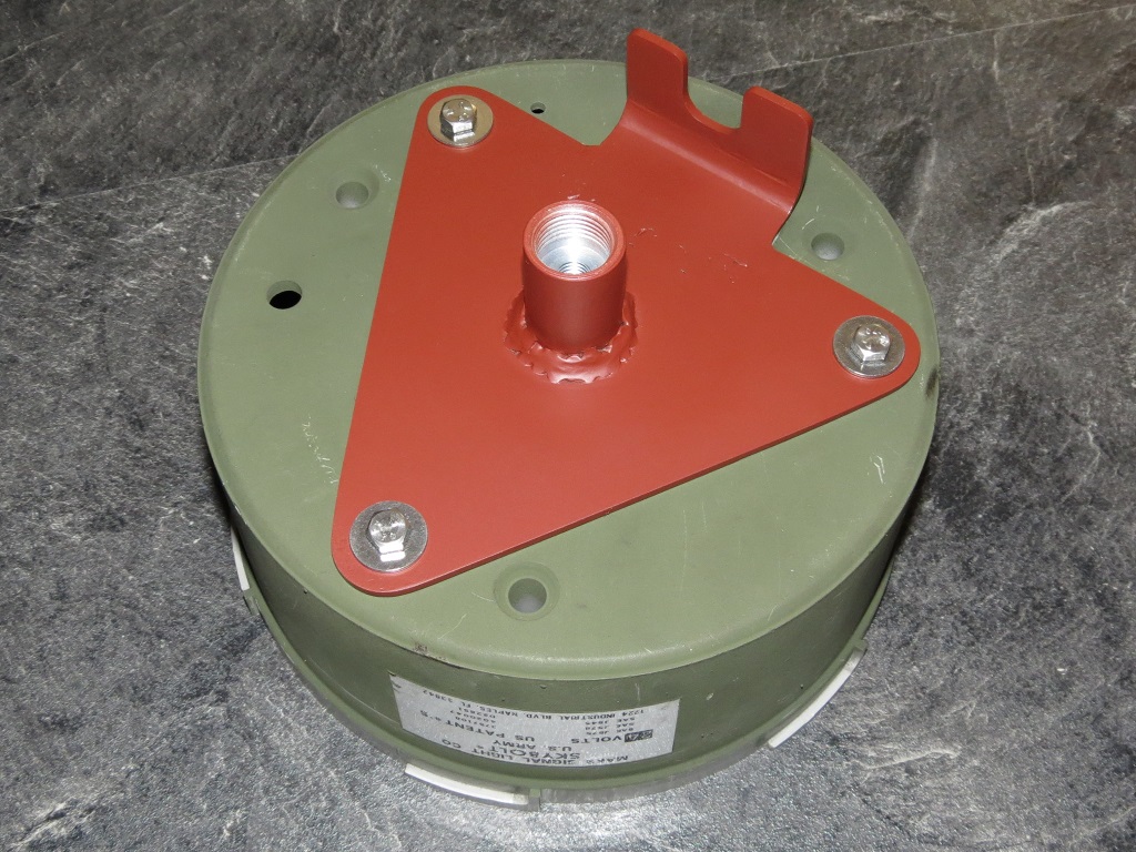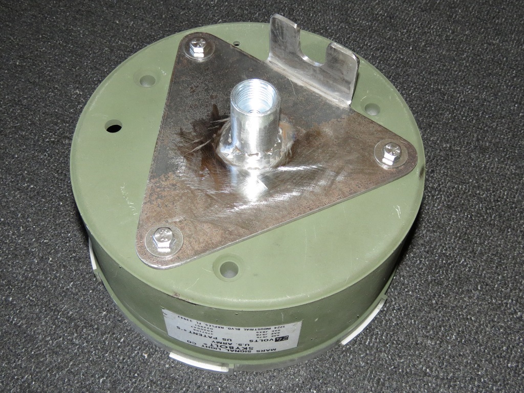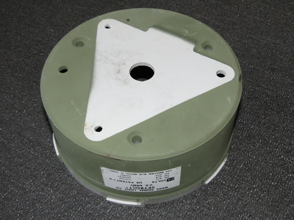 MARS SIGNAL LIGHT COMPANY - Skybolt Model US-Army, 24V Diese Leuchte habe ich auf ebay gefunden. Dem Aufdruck auf dem Motor nach ist sie (oder zumindest das Innenleben) von 6-77. Aber 77 hatten die Skybolt, meine ich, noch die hohen Gehäuse und genietete Typenschilder – scheint also eine Mischung aus einem altem Innenleben und nem neueren Gehäuse zu sein. Anhang 29203 Maße (circa):