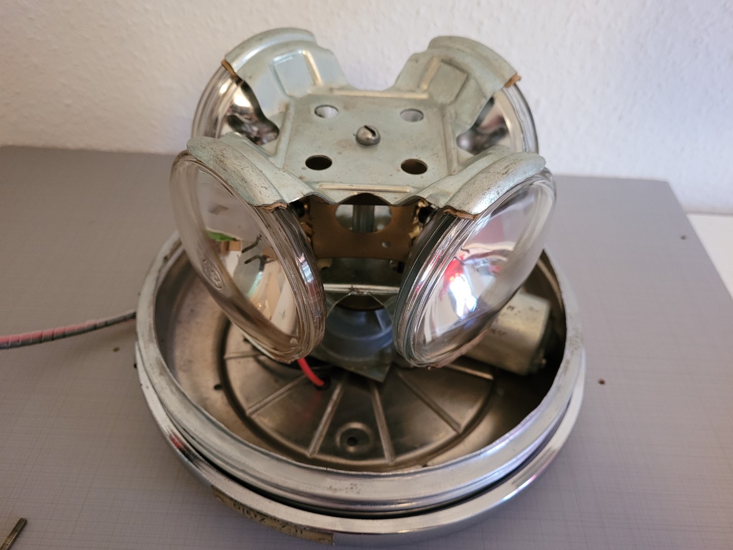 Hersteller: Dietz, Syracuse, NY Model: 7-11 Lampen: 2x 4416, 2x 4416R Volt: 12V Produktionsjahr: Mai 1974 SerienNr.: 051574 Macht einen guten Eindruck und ist auch vollständig, bis auf die Stratolite 80 Haube, die aber auch noch neu ist. Herstellungsdatum des Motors ist 29.04.1974, daher ist die Seriennr. stimmig mit dem Motor. Das polierte Metall ist teilweise sehr korrodiert, aber ich habe versuchsweise -mit Erfolg- bereits an der Behebung gearbeitet. |