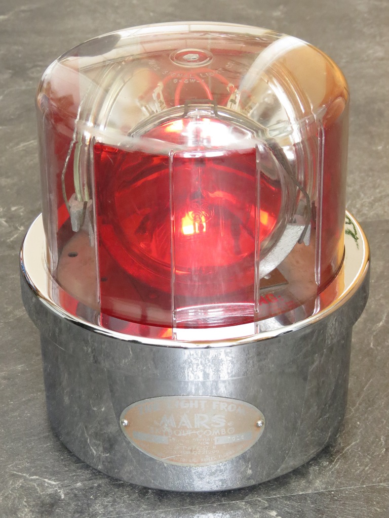 Anhang 29360 Zustand bei Erhalt: Gebraucht, mit 1-2 Fehlteilen! Der Chrom ist relativ gut aber das Gehäuse ist mehrfach gebrochen – ebenso wie ein roter Filter + die Haubendichtung fehlt. Hat neue Repro-Schilder – das verblasste original ID-Label ist aber zu glück auch noch vorhanden. Der Motor hat (genau wie sein „Geschwisterchen“) axiales Spiel dreht aber ruhig - die Lampen sind teilweise falsch aber i.O. Was bisher geschah: Habe die Brüche im Gehäuse stabilisiert und den Chrom aufpoliert sowie das originale ID-Label wieder montiert. Auch hier (wie bei der „Schwesterleuchte“) rührte das erhöhte axiale Spiel im Motor von einer verschlissenen Wellscheibe her. Diese wurde ersetzt und dabei gleich alles einmal gereinigt und neu gefettet. Des Weiteren wurden die Anschlußkabel des Lampenhalters erneuert. MARS SIGNAL LIGHT COMPANY - Skybolt Model Skybolt Combo SW3, 12V Serial No. F 7018 Diese Leuchte habe ich zuerst auf ebay.com gefunden, dann (nachdem der Artikel gelöscht wurde) habe ich den VK auf elightbars angeschrieben und anscheinend ein faires Angebot gemacht. Anhang 29361Anhang 29362 Maße (circa):