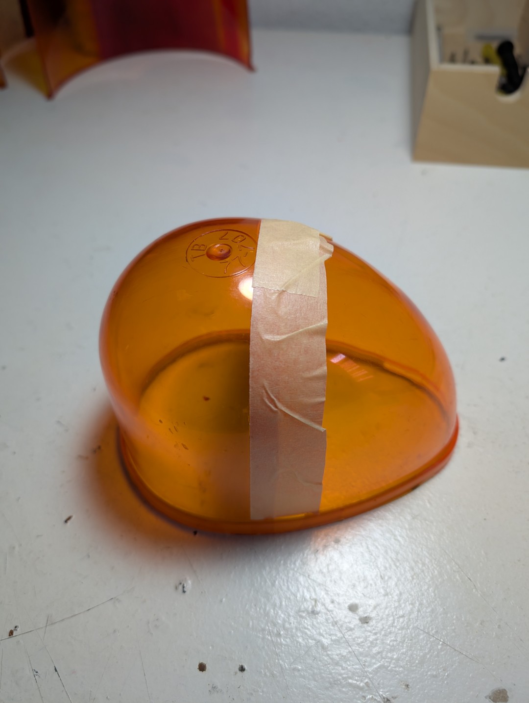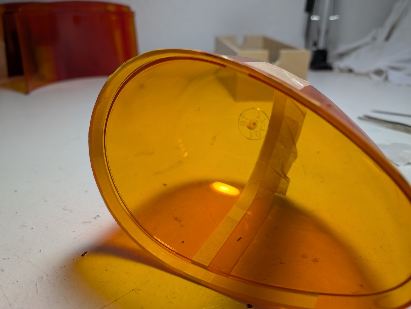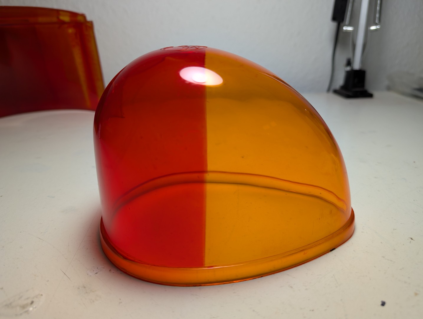 Es gibt ja zwei Möglichkeiten (mit allen Vor- und Nachteilen): zwei Hälften zusammenkleben oder einen amber dome hälftig in transparent rot lackieren. Mit folgenden Sachen habe ich den Versuch gestartet: Anhang 30726 Auto-K Nummer 33115 in 150ml Anhang 30727 ein arg gebrauchter model 14 dome, der allein vom hinschauen schon zerfallen ist. Anhang 30728 und so kam es auch... Anhang 30729 Das Abkleben diente nur zur Einschätzung der Farbkante. Im richtigen Einsatz muss natürlich alles abgeklebt werden was amber bleiben soll. Ich habe links nicht angeschliffen, rechts etwas angerauht mit 3000er NSP. Anhang 30730 Anhang 30731 Nach dem Lackieren von außen gesehen Anhang 30732 Anhang 30733 Innenseite, ein Kreppband bereits entfernt. Lackbild ist soweit gut. Anhang 30734 Anhang 30735 Aber dann zeigt sich das Dilemma. Auch wenn die Grundlage nicht mehr toll ist, zeigt sich das milchige Gesamtbild der lackierten Fläche. Hier mal zum Vergleich die werkseitige Lackierung bei einer GROTE 7622 Haube. Anhang 30736 Anhang 30737 |