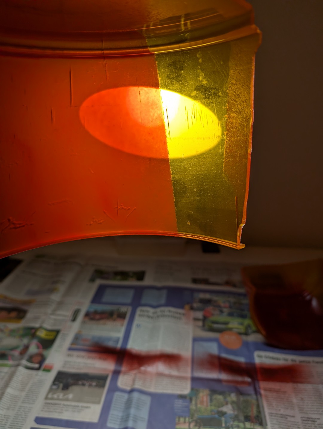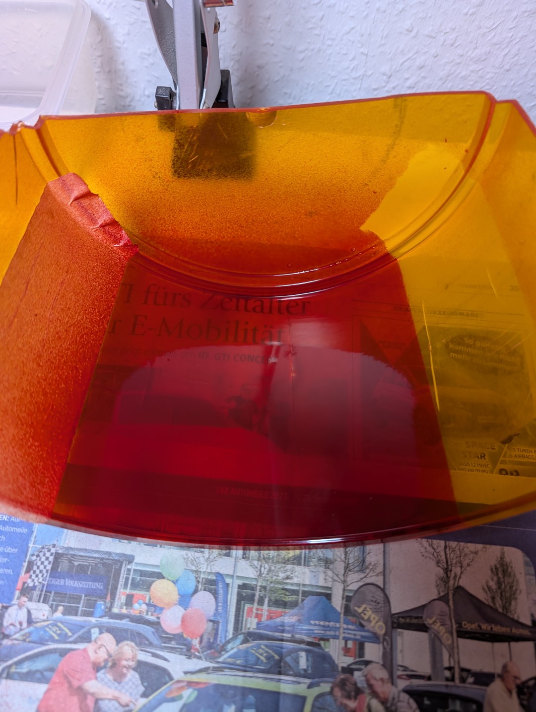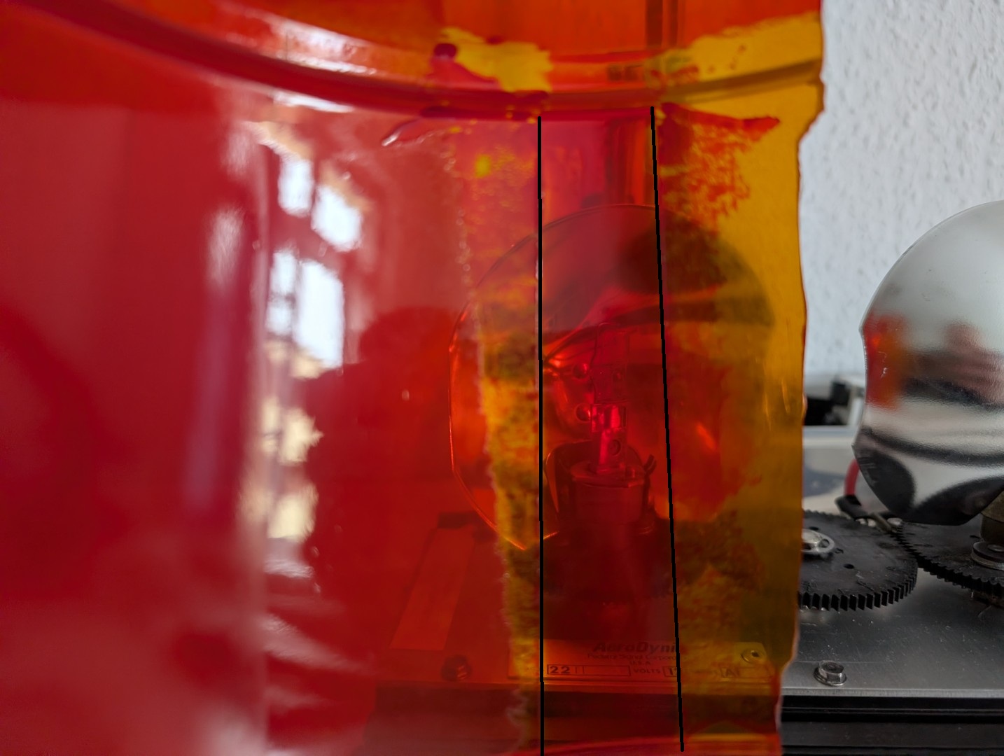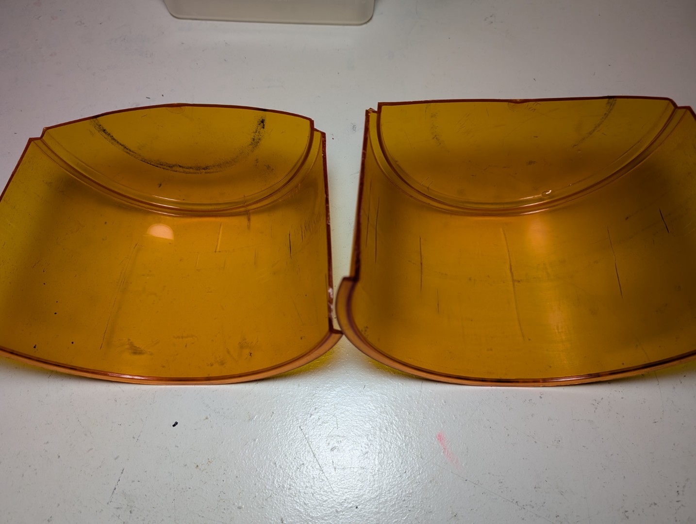 Es gibt ja zwei Möglichkeiten (mit allen Vor- und Nachteilen): zwei Hälften zusammenkleben oder einen amber dome hälftig in transparent rot lackieren. Mit folgenden Sachen habe ich den Versuch gestartet: Anhang 30726 Auto-K Nummer 33115 in 150ml Anhang 30727 ein arg gebrauchter model 14 dome, der allein vom hinschauen schon zerfallen ist. Anhang 30728 und so kam es auch... Anhang 30729 Das Abkleben diente nur zur Einschätzung der Farbkante. Im richtigen Einsatz muss natürlich alles abgeklebt werden was amber bleiben soll. Ich habe links nicht angeschliffen, rechts etwas angerauht mit 3000er NSP. Anhang 30730 Anhang 30731 Nach dem Lackieren von außen gesehen Anhang 30732 Anhang 30733 Innenseite, ein Kreppband bereits entfernt. Lackbild ist soweit gut. Anhang 30734 Anhang 30735 Aber dann zeigt sich das Dilemma. Auch wenn die Grundlage nicht mehr toll ist, zeigt sich das milchige Gesamtbild der lackierten Fläche. Hier mal zum Vergleich die werkseitige Lackierung bei einer GROTE 7622 Haube. Anhang 30736 Anhang 30737 |