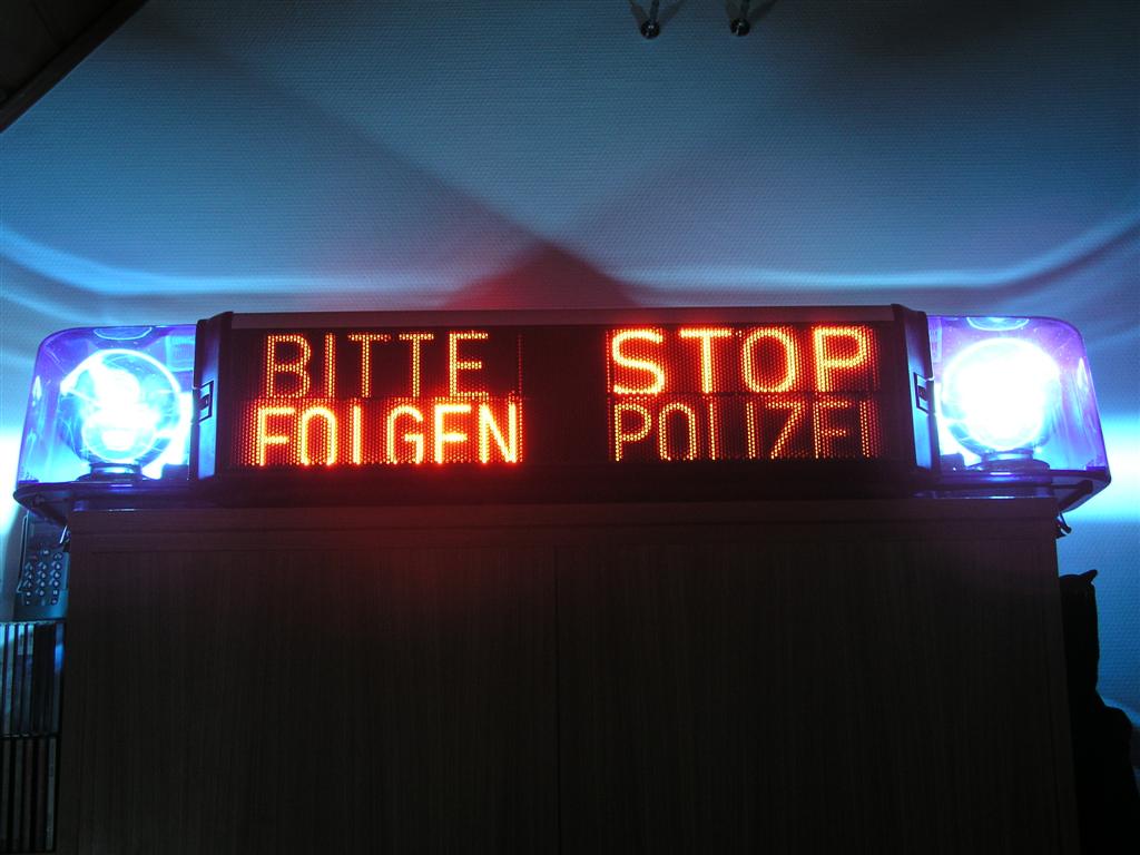 Diese RTK ist mit 2 nach vorne gerichteten Lautsprechern ausgestattet und besitzt 3 Anhaltesignalgeber (ASG). 2 nach hinten (BITTE FOLGEN / STOP POLIZEI) und einer nach vorne (STOP POLIZEI in Spiegelschrift). Ausserdem besitzt diese RTK 4-SL eine Vorrichtung für ein zusätzlichen Aufsteckblaulicht um z.B. vor einem Stauende oder einer bevorstehenden Gefahrenstelle zu warnen. Anhang 292 Anhang 295 Anhang 293 Langzeitbelichtung. Daher scheint es auf dem Foto so, als ob alle Textzeilen gleichzeitg an wären. Anhang 294 |