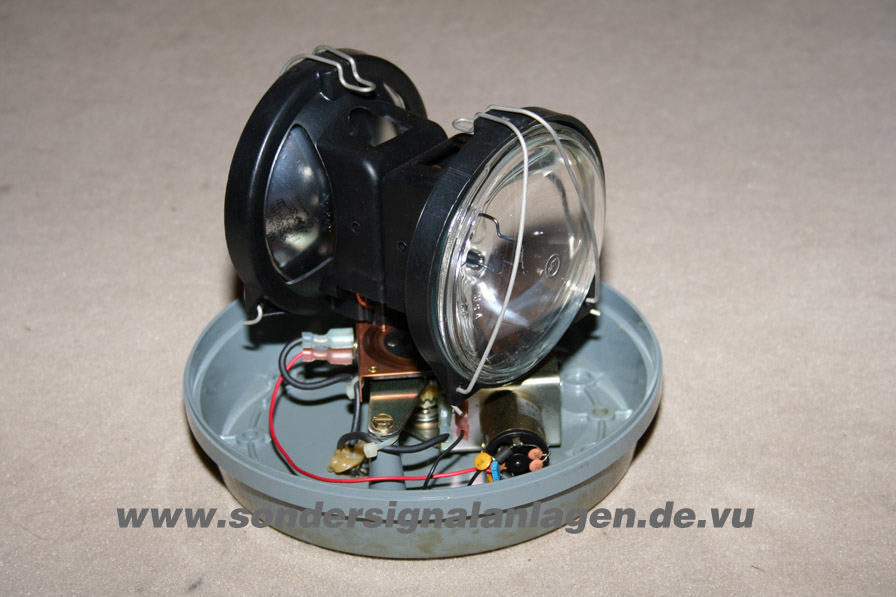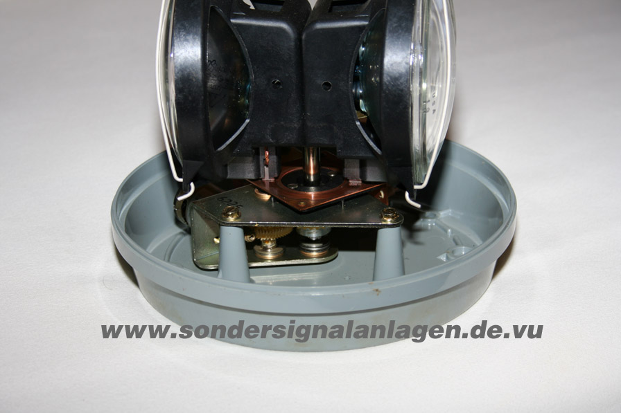 Dies ist die Federal Signal Beacon Model MS 51317-03. Eine Rundumleuchte mit 2 sogenannten "sealed beam" Leuchtkörpern. Diese ergeben den bekannten "Leuchtturmeffekt", da sich die Leuchte zwar langsam dreht aber dafür pro Umdrehung zwei mal einen intensiven Lichtkegel wirft. Anhang 676 Die Gühbirne ist fest mit dem Reflektor und der Linse verschweisst und mit einem Bügel in der Leuchte befestigt. Ist die Glühbirne defekt, so tauscht man die jeweilige komplette Reflektoreinheit. Im Boden erkennt man den recht kleinen Antriebsmotor. Anhang 677 Hier kann man sehr gut den Schneckenantrieb der Leuchte sehen. Ausserdem den Stromabnehmerring mit den beiden Schleifkontakten. Anhang 678 |