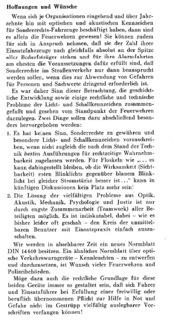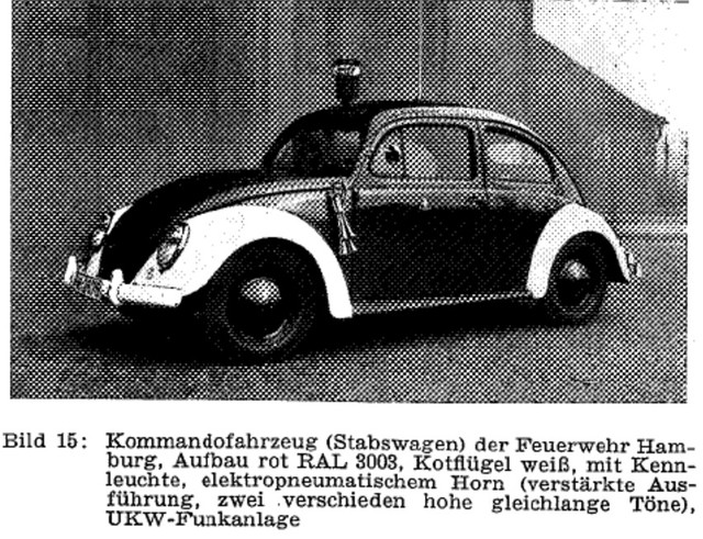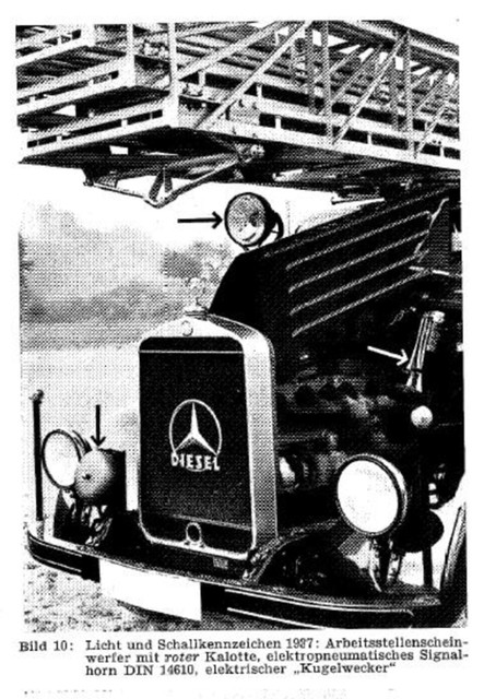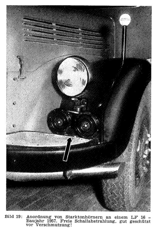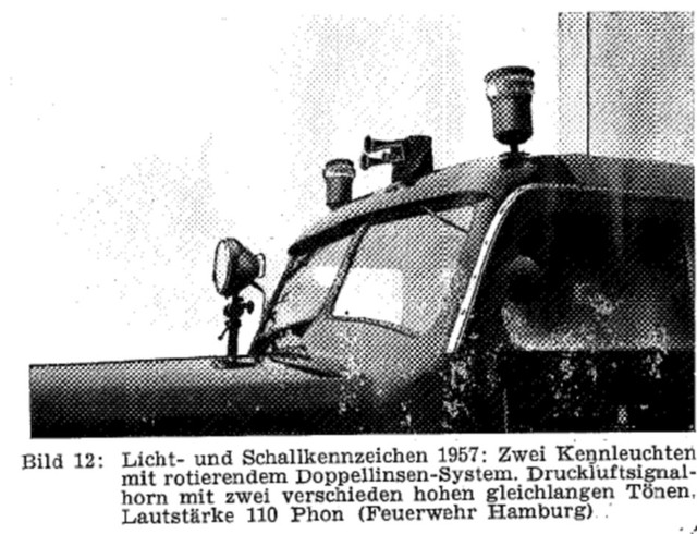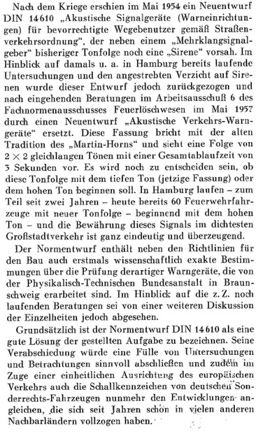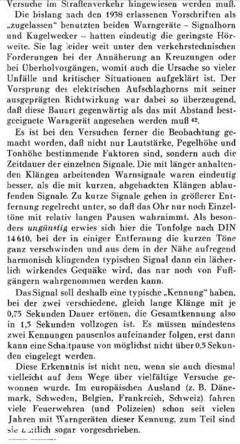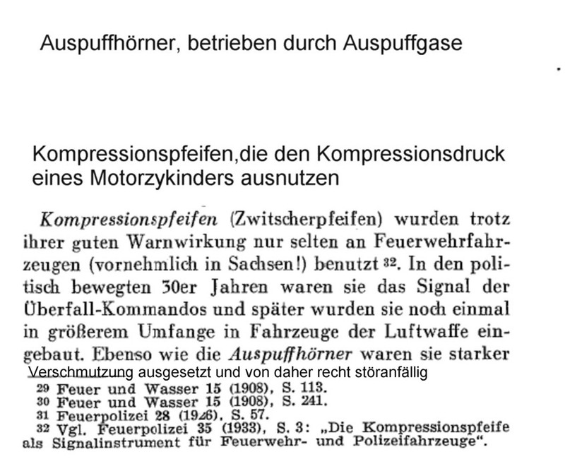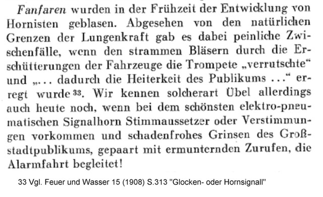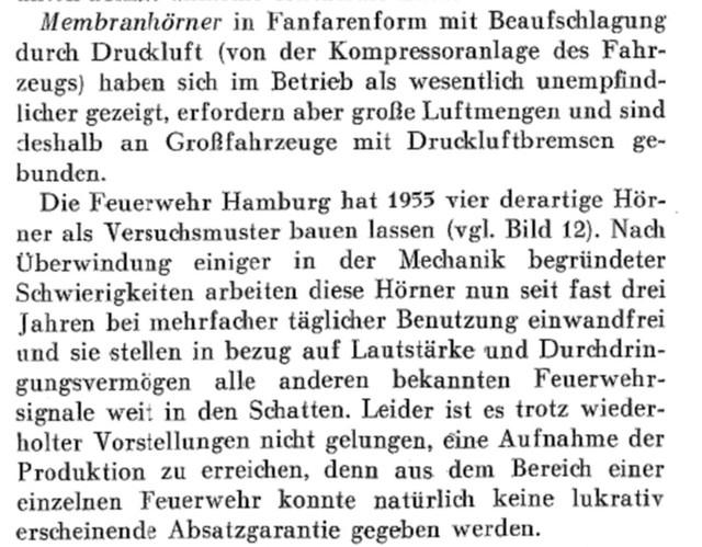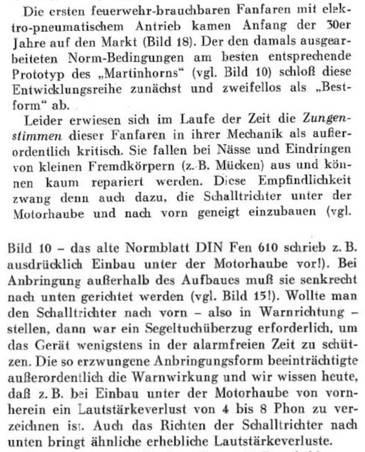 Anhang 4871 Mittels Kurbelbetrieb wurde Versucht, die Glocke zu mechanisieren. Anhang 4872 Mit Zunahme des Verkehrs in den 1930er Jahren und der Tendenz, Autos mit geschlossener statt offener Karosserie zu bauen, wurde die Warnwirkung der Glocke mehr und mehr als unzureichend empfunden Die Firma Siemens & Halske verbesserte die Alarmglocke (Stösselglocke) und produzierte bis in die 50er Jahre ein elektromechanisches Geläute, den Motorkugelwecker. Anhang 4873 In den 50er Jahren gab es in den Grosstädten Klagen darüber, dass die Glocke der Strassenbahn der der Feuerwehr zum Verwechseln ähnlich war, was die Warnwirkung einschränkte. Zudem entsprach das Geklingel in Tonhöhe "h"auch nicht dem Wortlaut der STVO vom 29.3.1956, in der es in § 55 (4) heisst "...eine Warnvorrichtung mit einer Folge verschieden hoher Töne muss an Fahrzeugen angebracht werden..." Der Motorkugelwecker war ab diesem Datum für Neufahrzeuge nicht mehr zulässig, wurde aber an vorhandenen Fahrzeugen belassen und auch weiterhin noch einige Jahre benutzt. Als Exoten unter den Signalen gab es: Anhang 4874 Da direkt nach dem 2. Weltkrieg die einzigen beiden Hersteller von Sondersignalen, die Firmen Max B. Martin und Siemens & Halske (Motorkugelwecker) in der Sowjetischen Besatzungszone lagen und somit als Lieferant (vorerst) ausfielen, bot es sich, insbesondere in der amerikanischen Besatzungszone an, amerikanische Sirenen mit Wail-Signal zu verwenden. Im südwestdeutschen Esslingen/Waghäusel stellte die Firma Elektror elektromechnische Wail-Sirenen her, welche von deutschen Feuerwehren bis gegen Ende der 50er-Jahre verwendet wurden. Anhang 4875 Anhang 4876 Bereits vor dem 2. Weltkrieg fanden diese Sirenen in Deutschland keine Anklang. Nun empfand man den Ton als "nervensägendes Geheul" und fühlte sich dadurch auch an die Luftschutzsirenen des WK II erinnert Negativ war auch der extrem hohe Stromverbrauch, der bei längeren Alarmfahrten rasch die Batteriekapazität überstieg. Sirenen betrachtete man bereits 1957 als "Notlösung der Nachkriegsjahre". Anhang 4877 Im Mai 1954 war im Neuentwurf DIN 14610 für Akustische Signalgeräte neben einem "Mehrklangsignalgeber bisheriger Tonfolge" noch die Sirene vorgesehen. Im Hinblick auf die Ergebnisse von Hamburger Signalversuchen 1954/1955 wurde sie fallen gelassen. In der STZVO vom 29.3.1956 stand unter § 55 (4) explizit: "Sirenen dürfen an Fahrzeugen nicht angebracht sein". Anfangs der 30er Jahre entwickelte die Firma Max B. Martin ein elektropneumatisches Signalhorn DIN 14610 (Tremolo-Fanfare), das Martinhorn, welches entweder vom Hornist via Atemluft, Anhang 4878 oder auch mechanisch mittels "Handpumpe" zu betreiben war. Anhang 4879 Anhang 4880 Es wurde im Verlauf elektropneumatisch ausgeführt: Anhang 4881 Martinhorn 2097: Anhang 4882 Das Martinhorn in der urspünglichen Ausführung war nicht wie heute mit Membranen, sondern mit sogenannten Zungenstimmen versehen, die zu einigen Nachteilen führten. Anhang 4883 Anhang 4884 Anhang 4902 Anhang 4885 Anhang 4886 Die Feuerwehr Hamburg hat sich im Jahr 1955 Drucklufthörner mit Membranen, statt Zungenstimmen bauen lassen. Es ist nicht bekannt, von wem. Anhang 4887 Anhang 4888 Man kann spekulieren, ob es sich dabei um die Firma Max B. Martin handelte, denn diese stellte in der Produktion des Martinhorn auf Membranen um, so dass die Schalltrichter nicht mehr nach Unten oder verdeckt einzubauen waren und zusätzlich mit Fliegengittern gesichert werden konnten. Der deutsche Fahrzeugzulieferer SWF (Spezial Werkzeugfabrik Feuerbach) hatte ebenfalls ein Kompressorhorn im Programm SWF Horn mit Membranen: Anhang 4889 Auf Grund zunehmender Verkehrsunfälle von Feuerwehrfahrzeugen in den deutschen Grosstädten hat die Hamburger Feuerwehr zusammen mit der Hamburger Polizei und dem Sachverständigen für Akustik,Dipl.-Ing. R. Kraege in den Jahren 1954/1955 umfangreiche Messungen mit verschiedenen Sondersignalen im Strassenverkehr durchgeführt Dabei zeigte sich, dass das erst 1954 entwickelte Bosch Starktonhorn / Aufschlaghorn mit 100 bis 250 m Hörweite eine wesentlich höhere Durchdringungskraft besass als das elektropneumatische Martinhorn mit nur 34 m. Die Hamburger Feuerwehr stellte deshalb sämtliche Alarmfahrzeuge auf das Starktonhorn um. Später wurde bewusst, dass das Martinhorn durch die fächerartige, breite Schallausbreitung gerade für Alarmfahrten innerhalb der Stadt ideal ist, wogegen das Starktonhorn durch seine extreme Schallbündelung besser für den Einsatz auf Landtrassen und Autobahnen geeignet ist. Idealerweise wurden deshalb vor Einführung der elektronischen Sondersignalanlagen beide Typen am Einsatzfahrzeug verbaut. Anhang 4890 Anhang 4891 Anhang 4892 Die klassische Wechselklang-Tonfolge nach Din 14610 (Martinhorn) war bis 1957 folgende Tonfolge In den Hamburger Versuchen wurde herausgefunden dass diese Tonfolge nur im Nahbereich gut zu erkennen war. In weiterer Entfernung waren die kurzen Töne nicht gut zu hören. Auf Grund dieser Erkenntnisse wurde in den 60er-Jahren die Tonfolge in die noch heute Gültige geändert. Anhang 4893 Anhang 4894 Anhang 4895 Quellenangabe: VFDB-Zeitschrift Forschung und Technik im Brandschutz Heft 4 1957 Oberbrandrat Dipl.-Ing. H.Brunswig VDI Hamburg |