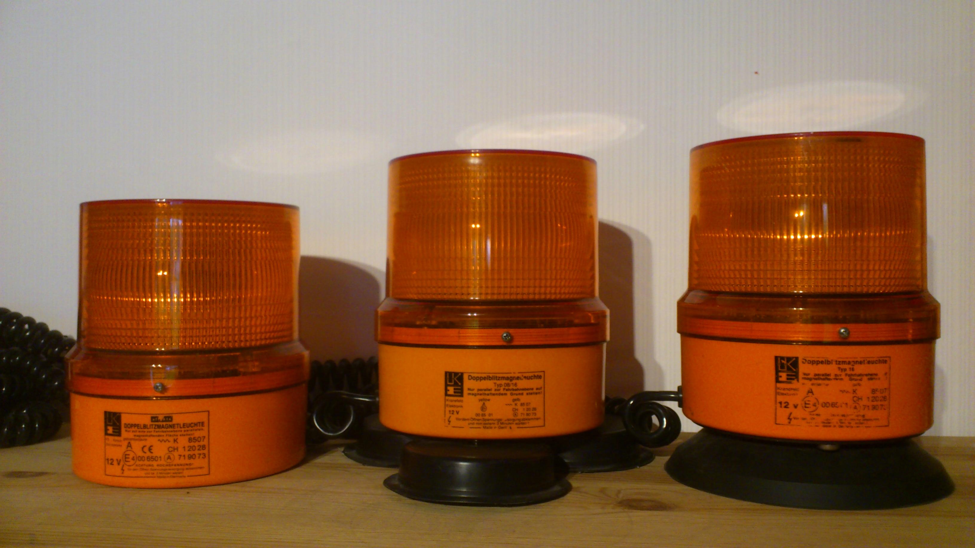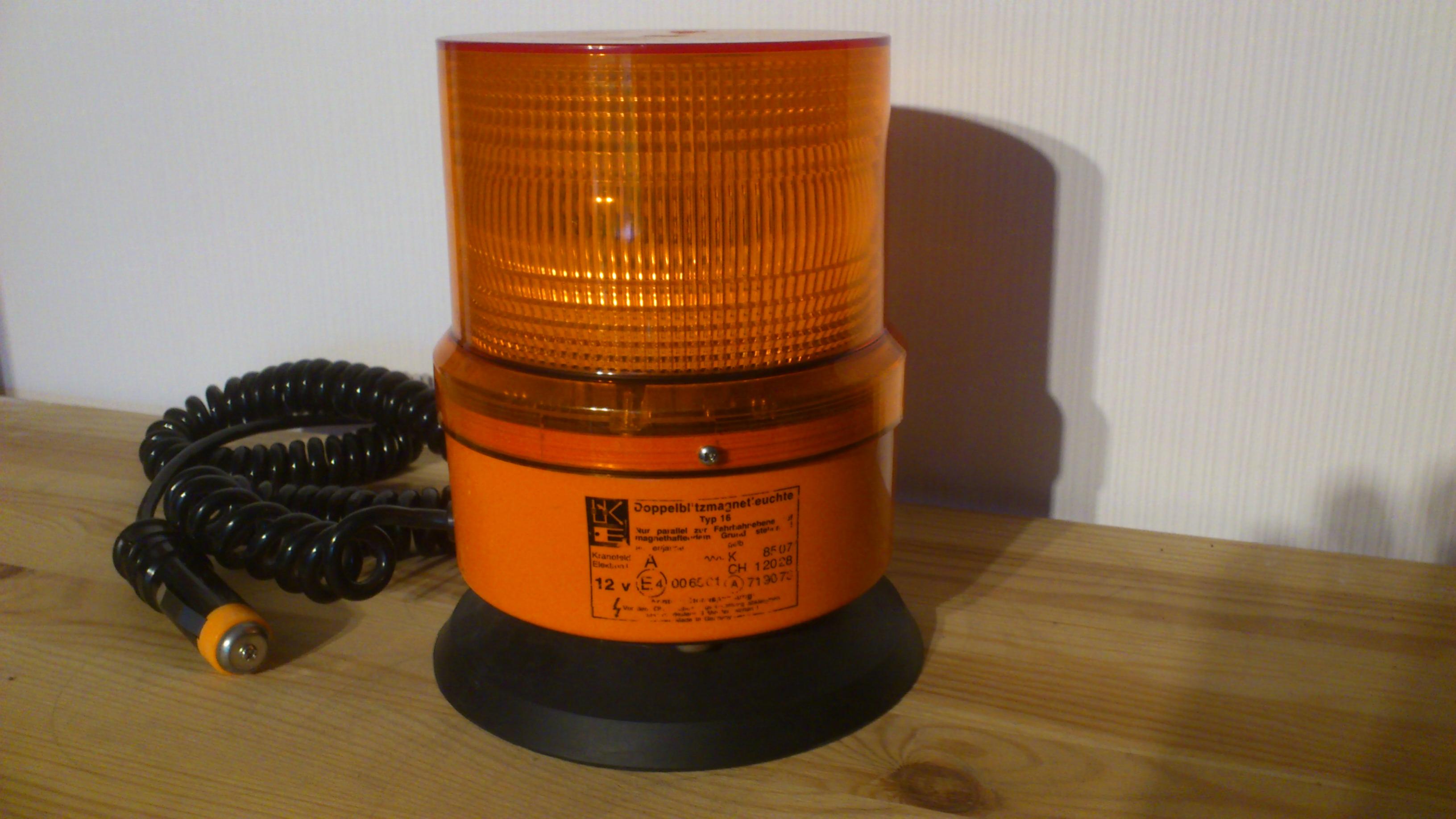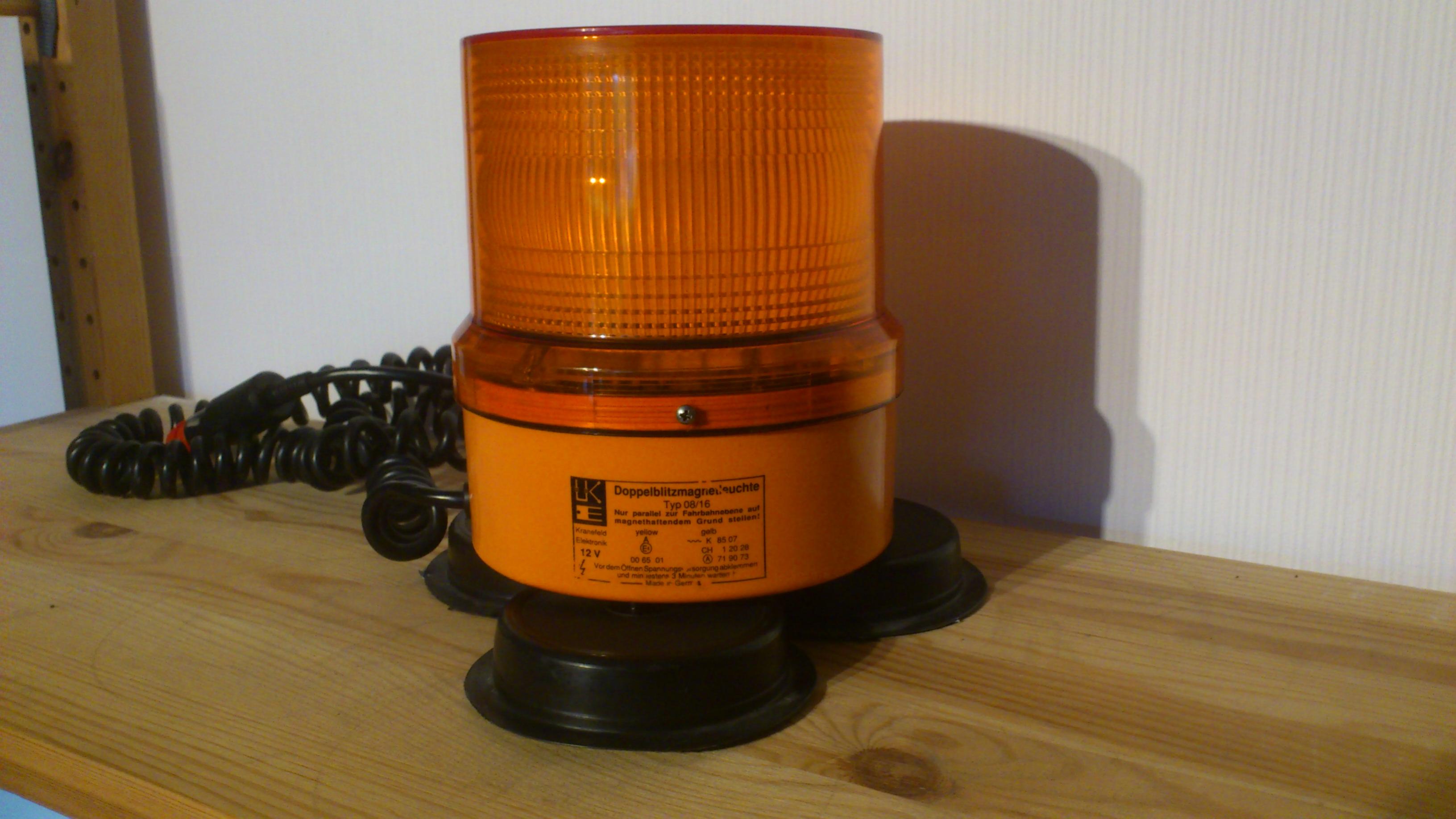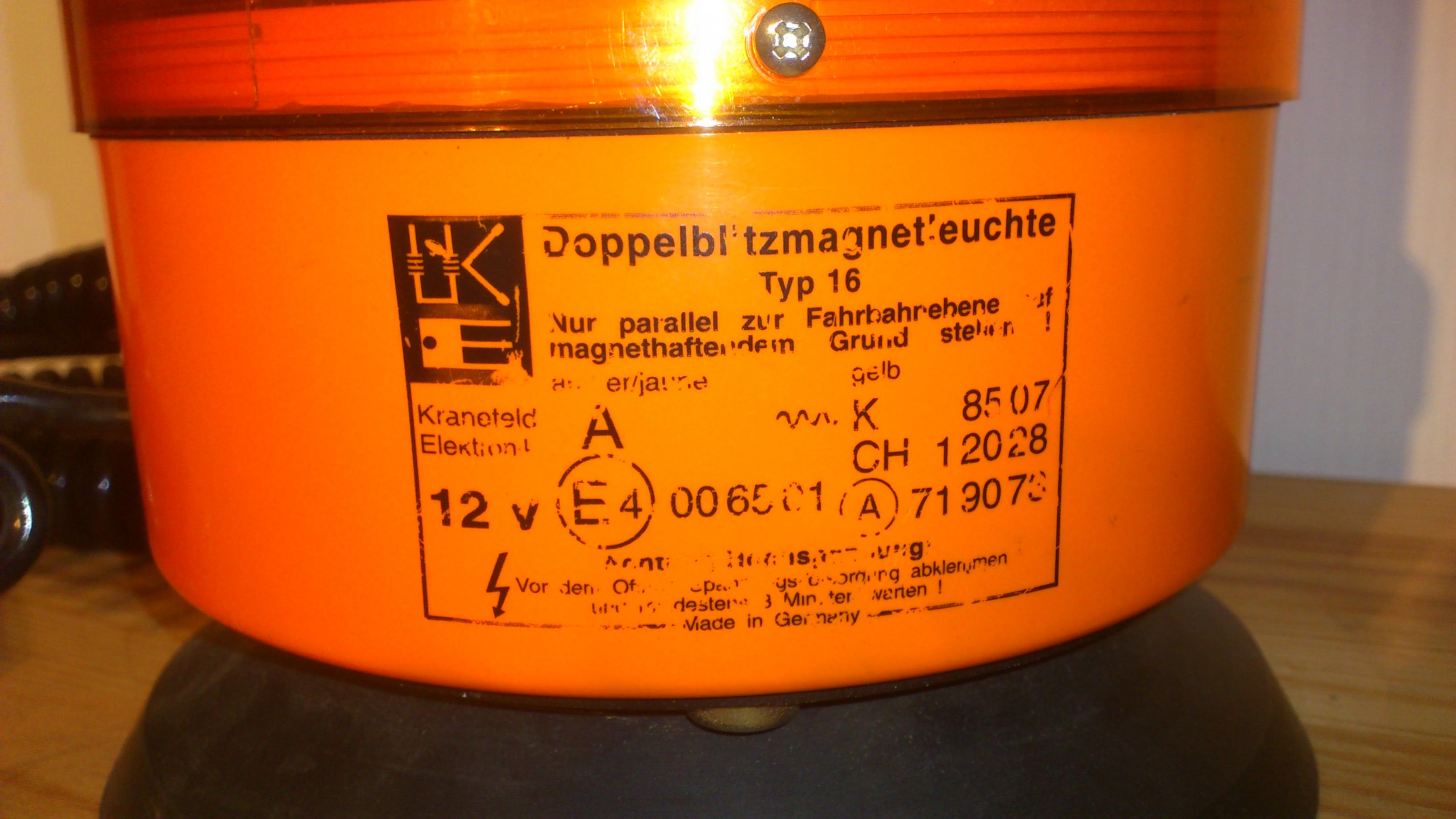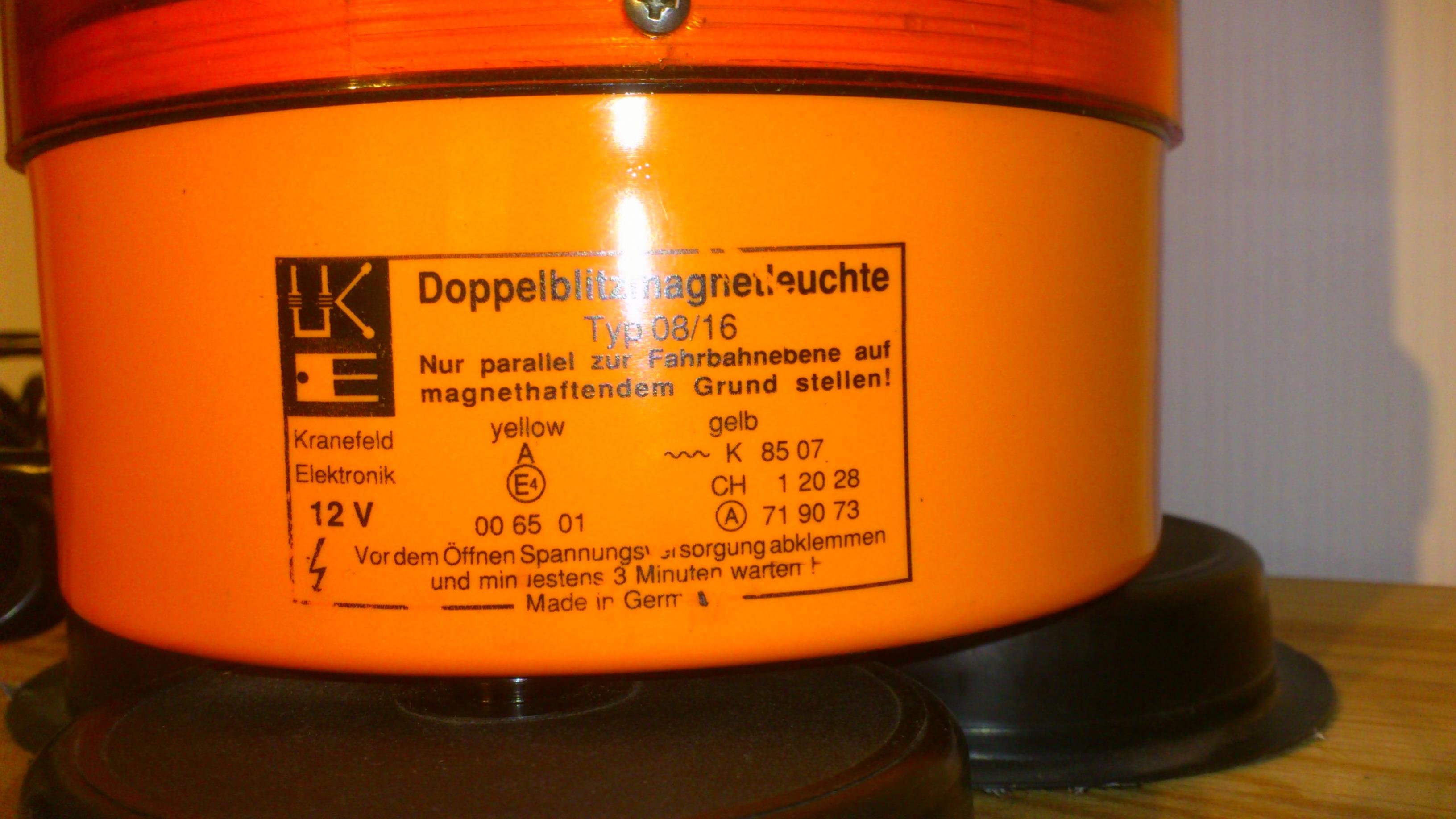 Neue Bilder werden nach und nach hochgeladen. *** Das ist meine Hänsch effekta. Es handelt sich dabei um eine Doppelblitzleuchte mit 12 Volt Betriebsspannung. Die Stromversorgung erfolgt über ein Spiralkabel mit Universal-Stecker. Anhang 21618 Das Typenschild der effekta ist auf das Leuchtengehäuse aufgedruckt. Neben der Zulassung als reguläre Kennleuchte ("A E4 (im Kreis) 00 6501") ist die Leuchte mit der "~~~K 8507" als zusätzliche Warnleuchte bei stehendem Fahrzeug mit Warnblinklicht zugelassen. Die schwarze Gummidichtung zwischen Lichthaube und Leuchtengehäuse dichtet das Innenleben der effekta zuverlässig ab. Bild Das Typenschild wiederholt sich auf der Lichthaube. Bild Auf der Unterseite des Leuchtengehäuses finden sich drei weiße Gummis. Sie sollen die Leuchte am Verrutschen hindern. Bild Im Inneren des Leuchtengehäuses befindet sich ein Ringmagnet. Bild Im Inneren der Lichthaube ist eine Platine mit der Blitzröhre und den Bauteilen zur Erzeugung des Doppelblitz-Signals. Bild Die Lichthabe ist innen mit einer weißen Fresnellinse ausgestattet. Außen ist die orange Lichthaube glatt. Sie wird mit einer Schraube zusätzlich gegen ungewolltes Verdrehen/Lösen vom Gehäuse gesichert. Bild Die Blitzröhre ist auf der Platine angelötet und darf nur vom Hersteller (Hänsch) ausgewechselt werden. Bild Auf der Oberseite der Platine ist die Zahl 1002 aufgedruckt. Ihre Bedeutung ist mir unbekannt. Bild Die Hänsch effekta ist eine vollwerige Doppelblitzkennleuchte (§ 52 StVZO), die zusätzlich als zusätzliche Warnleuchte für Privatanwender nach § 53 a Abs. 3 StVZO zugelassen ist. Das Blitzsignal ist sehr auffällig und die Benutzung der Leuchte stellt ein deutliches Sicherheitsplus dar. Der innen liegende Ringmagnet verhindert, dass die Leuchte im Fahrbetrieb sicher auf dem Fahrzeugdach gehalten wird. |