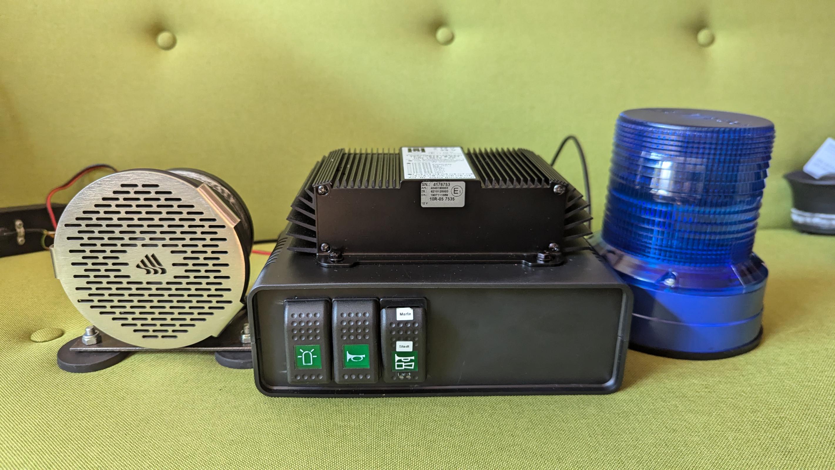 als Bedienung dienen 3 Hella Kippschalter der Baureihe 832 wovon einer dreistufig ist, dieser ist für die Hornumschaltung zuständig. Am hinteren ende der Box Befindet sich der Elektrische Anschluss als Kennleuchten anschluss dient eine Normale