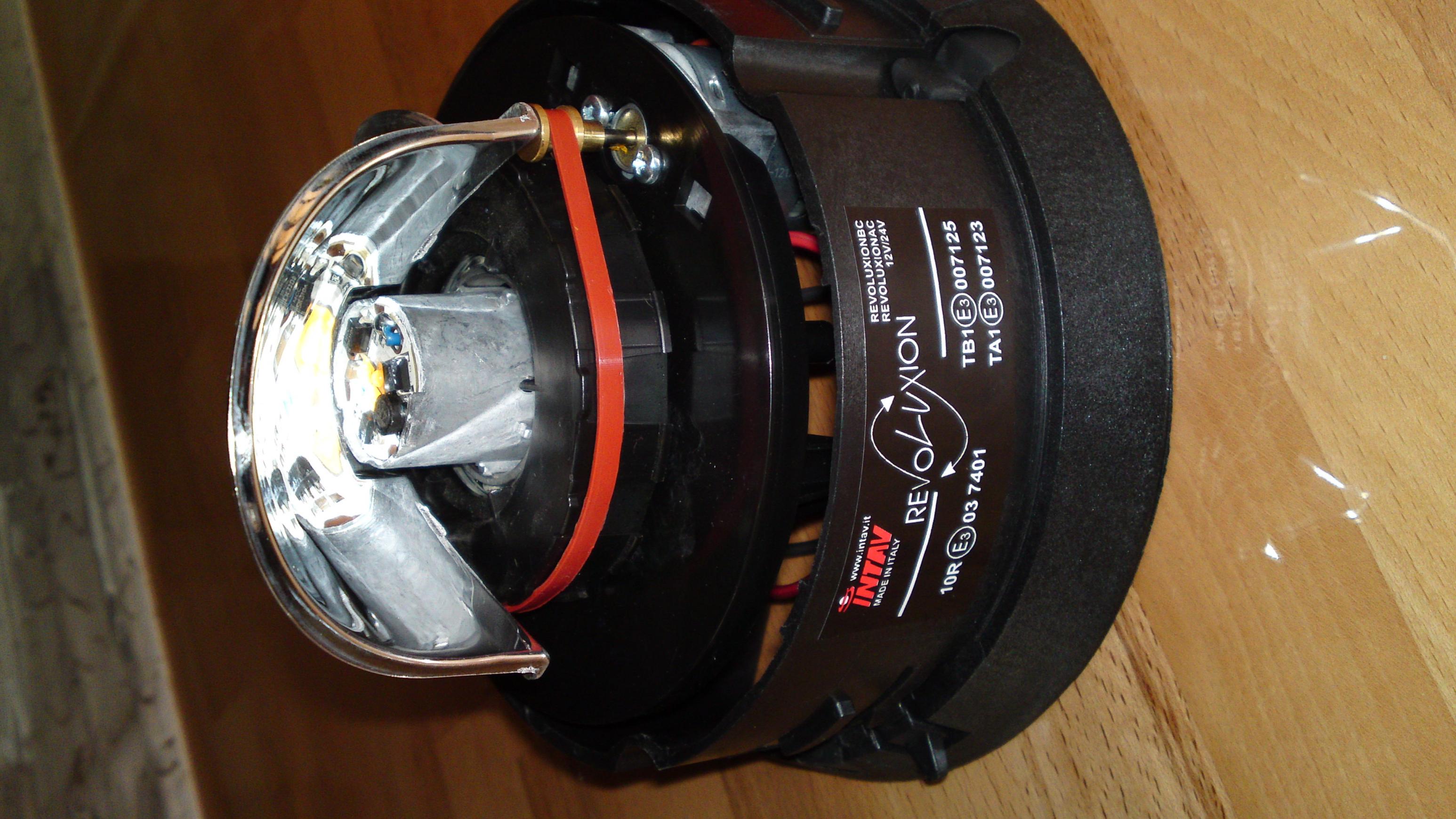 Die Lichtleistung ist akzeptabel. Nichts besonderes. Was mich an der Leuchte interessiert ist die Technik. Der drehende Spiegel wird von unten von einer LED beleuchtet. |