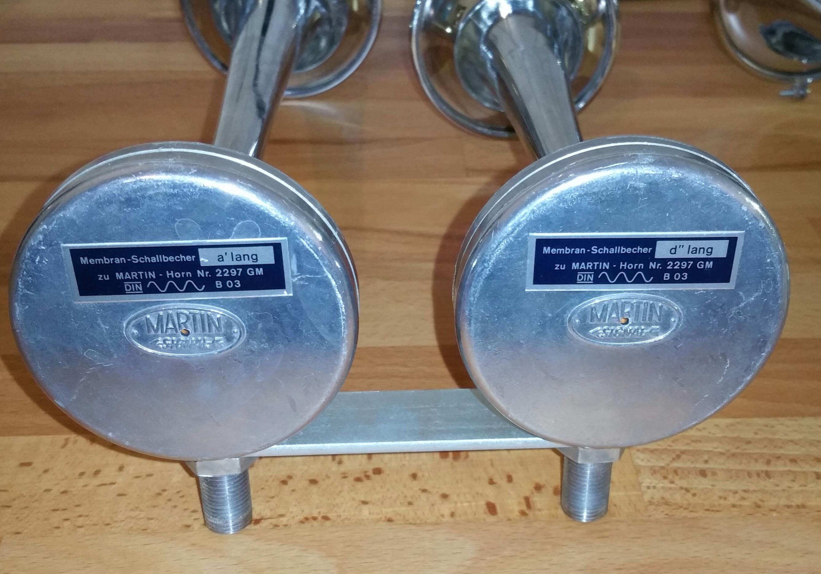 Die Beiden langen Schallbecher sind zusammen ein Ton und die kurzen Schallbecher ebenso. Also a'lang und a'kurz zusammenschalten und d'lang , d'kurz zusammenschalten. Auf dem Alugehäuse am Kompressor (Gebläse) ist an den Luftauslässen klein ein a und ein d eingestanzt. |