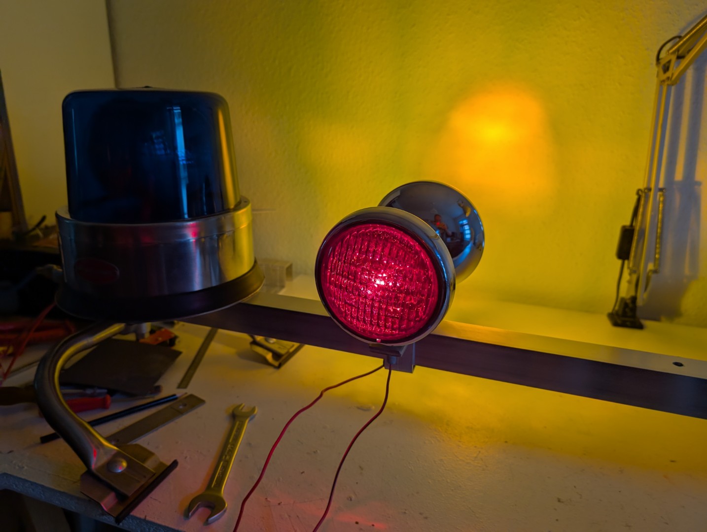 Der Reflektor ist mit der Streuscheibe verbunden und im Grunde wie eine sealed beam mit wechselbarer H3 Birne. Bei Kleinanzeigen hatte ich zwei weitere Lampen gefunden, also habe ich nun 3 Stück. Die vierte kaufe ich dann wieder im Motorradfachgeschäft. Also das alles entfernt und eine 4414R verbaut. Das minus direkt ans Gehäuse angebunden und ein Pluskabel durch die Montageschraube. Hier sind die beiden roten für die Front fertig, für die rear flasher suche ich noch geeignete amber PAR36. |
