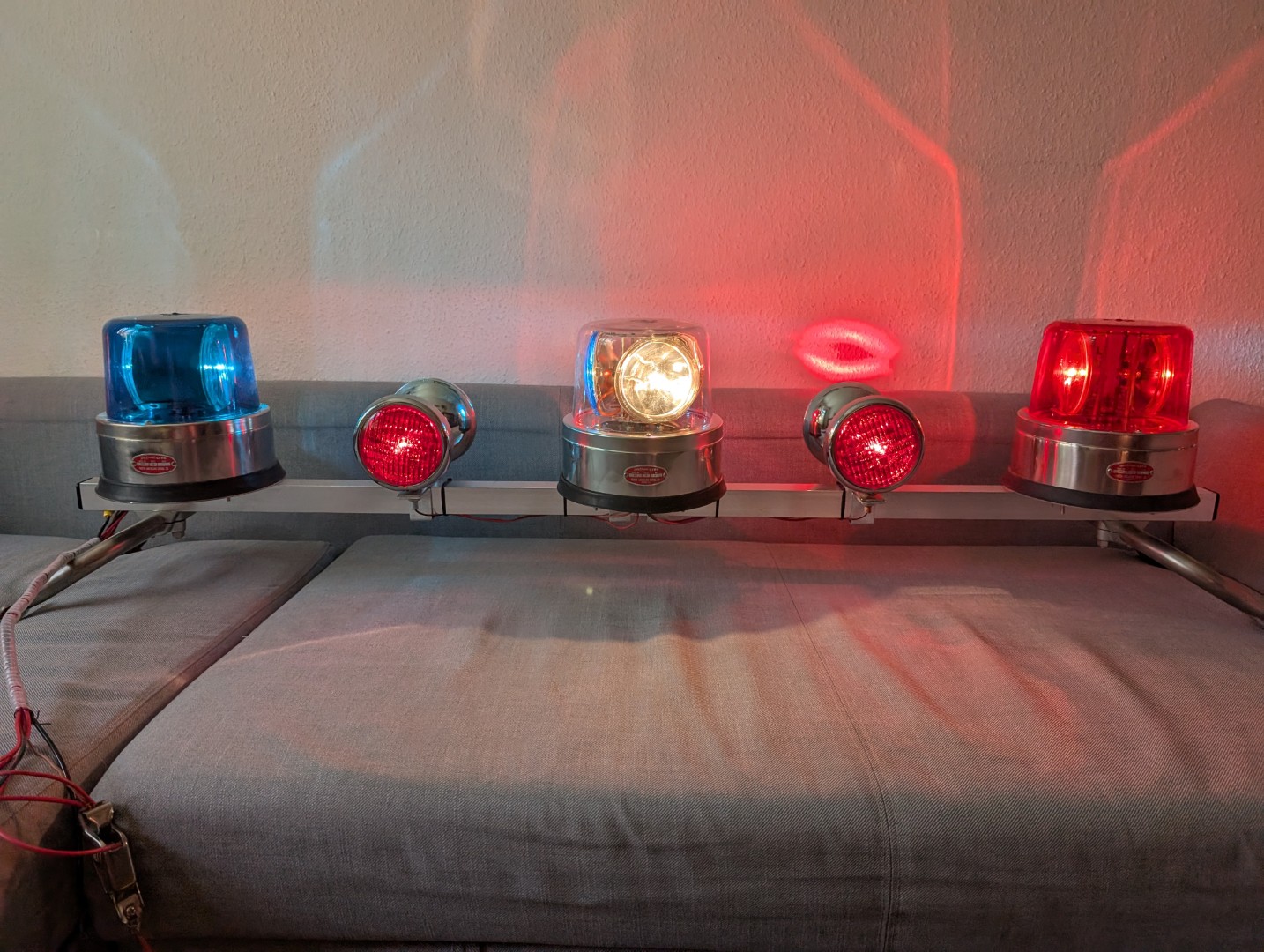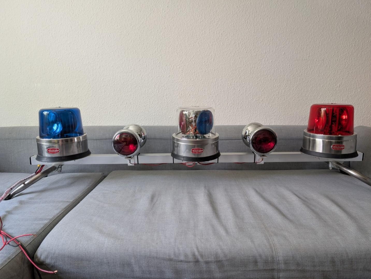 Da die mittlere Platte nicht direkt am Rahmen befestigt werden kann, habe ich die Winkelstücke entsprechend genutzt. Die model 300 montiert, im Unterteil den flasher für die amber rear lights verlegt und dann war es auch schon soweit fertig. Hier die Bilder des North American Signal lightbar rack 60AAB-153C mit 2 Leuchten vom Typ 250, einer Leuchte Typ 300 und zwei roten steady burn und zwei amber rear flasher. Und natürlich mit Beleuchtung: Nachfolgende Bilder von hinten: |