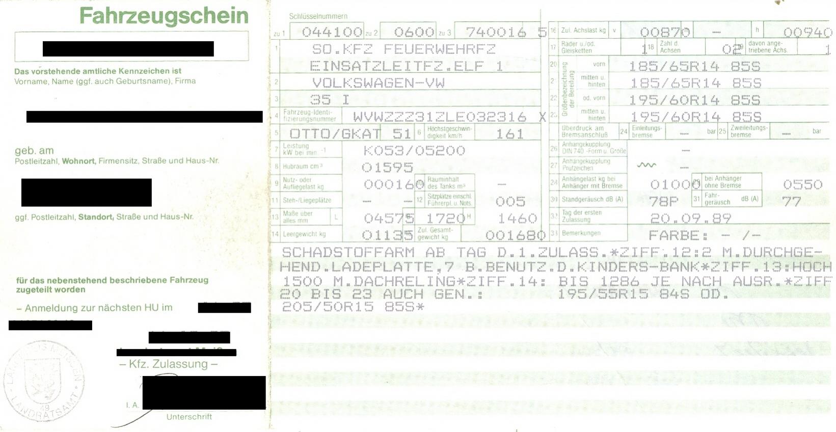Aber lasst mich bitte erst kurz die Geschichte erklären: Zu meinem Vater habe ich einmal gesagt "Ich würde gern mal ein Fahrzeug als Feuerwehrfahrzeug ausbauen. Nur um meine Kreativität auszuleben. Oder ein älters Feuerwehrfahrzeug wieder neu aufpeppen mit neuer Sondersignalanlage und neuer Folierung." Ja das war ein Traum. Ich wöllte vieles umbauen aber so dass alles trotzdem TÜV-gerecht ist. Da würde mich das Endergebniss noch stolzer machen. Wobei ich dieses Fahrzeug wohl nie zulassen würde außer es wird dann am Ende wieder verkauft. Nun kann der Traum wahr werden... Heute, zum 17. Geburtstag, gab es den Autoschlüssel für einen alten VW-Passat KdoW/ELW. Nun kann ich meine Kreativität und mein Handwerk daran auslassen. Vieleicht wird es dann irgendwann weiterverkauft oder auch nicht... Andere nehmen Drogen, ich baue ein Fahrzeug neu aus... Nun zu meiner eigentlichen Frage: Ich studiere grad die Fahrzeugpapiere. Das Fahrzeug hat eine RTK4 verbaut. In den Papieren ist diese allerdings überhaupt nicht eingetragen. Kann das sein? Ich war der Meinung diese muss immer drin stehen. Oder reicht die Ausführung "Sonder-KFZ Feuerwehrfahrzeug" aus? Ich wollte wissen wie das eingetragen ist um zu schauen ob man Problemlos die RTK4 gegen eine RTK6 tauschen kann oder nicht. Das kommt ja immer darauf an wie es eingetragen ist. Das Fahrzeug war gute zehn Jahre im Feuerwehrdienst somit kann ich mir eigentlich nicht erklären warum diese Anlage nicht eingetragen ist. Wie (bzw. ob überhaupt) muss die RTK4 denn also in den Fahrzeugpapieren aufgeführt sein? |