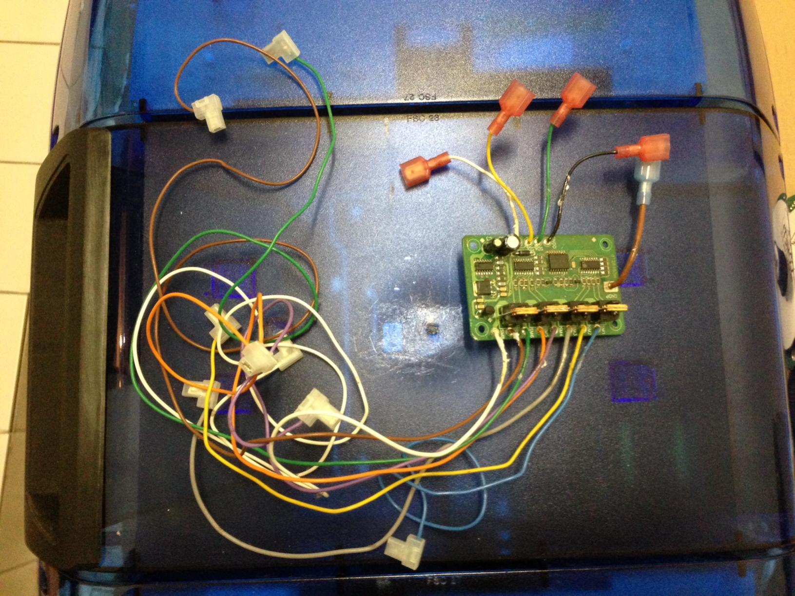 Wenn ich das jetzt noch richtig in Erinnerung habe, ist das die Platine, die mit im Signalmaster verbaut ist. Die Abgänge gehen zu den einzelnen Leuchten. Die andere Seite wird per vorkonfektionierter Leitung verlängert und geht dann auf das Amaturenbrett-Steuergerät (Taster) vom Signalmaster. Eine Leitung (ich glaube sw (schon zu lange her)) wird über den Handbremshebel auf Masse gelegt, damit die Anlage nur im Stand läuft.
