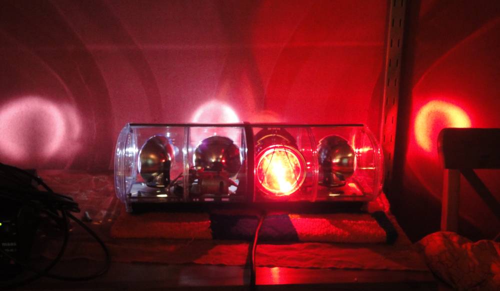 Nach entfernen eines Drehspiegels und Montage der für die Cal Spec. Ausführung benötigen beiden PAR Leuchtmittel wurde mittels Farbfiltern das gewünschte Farbmuster erstellt.