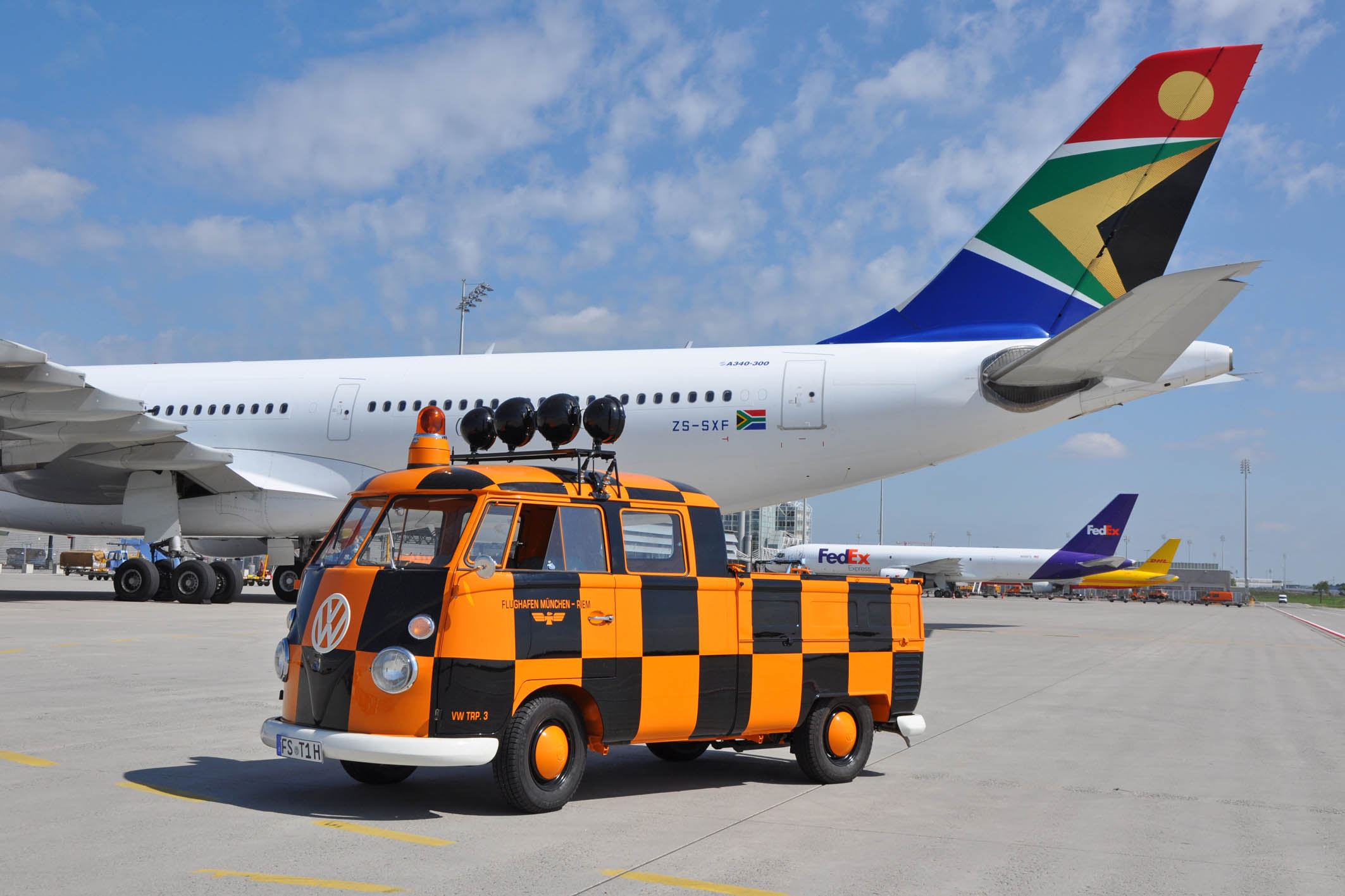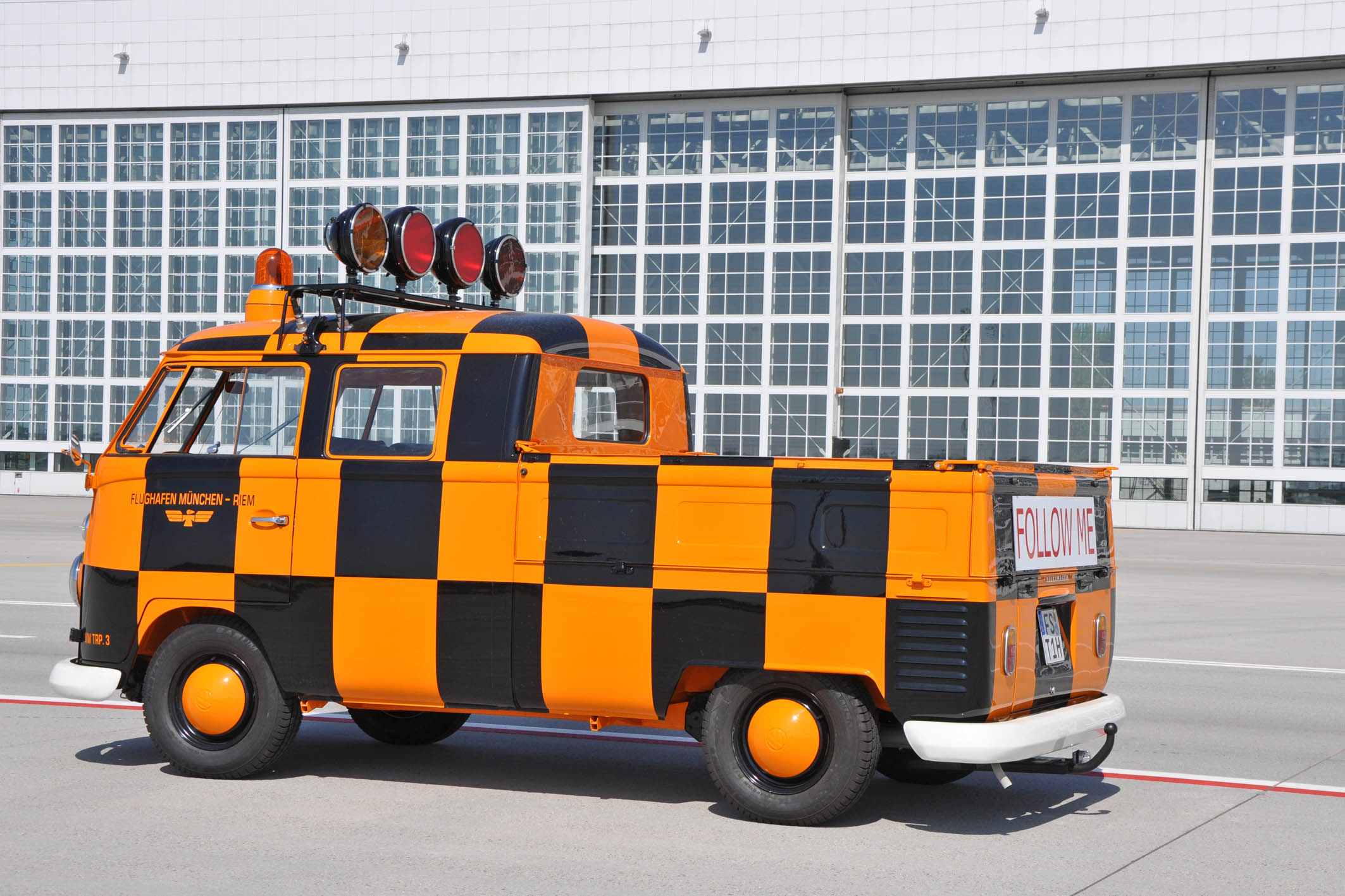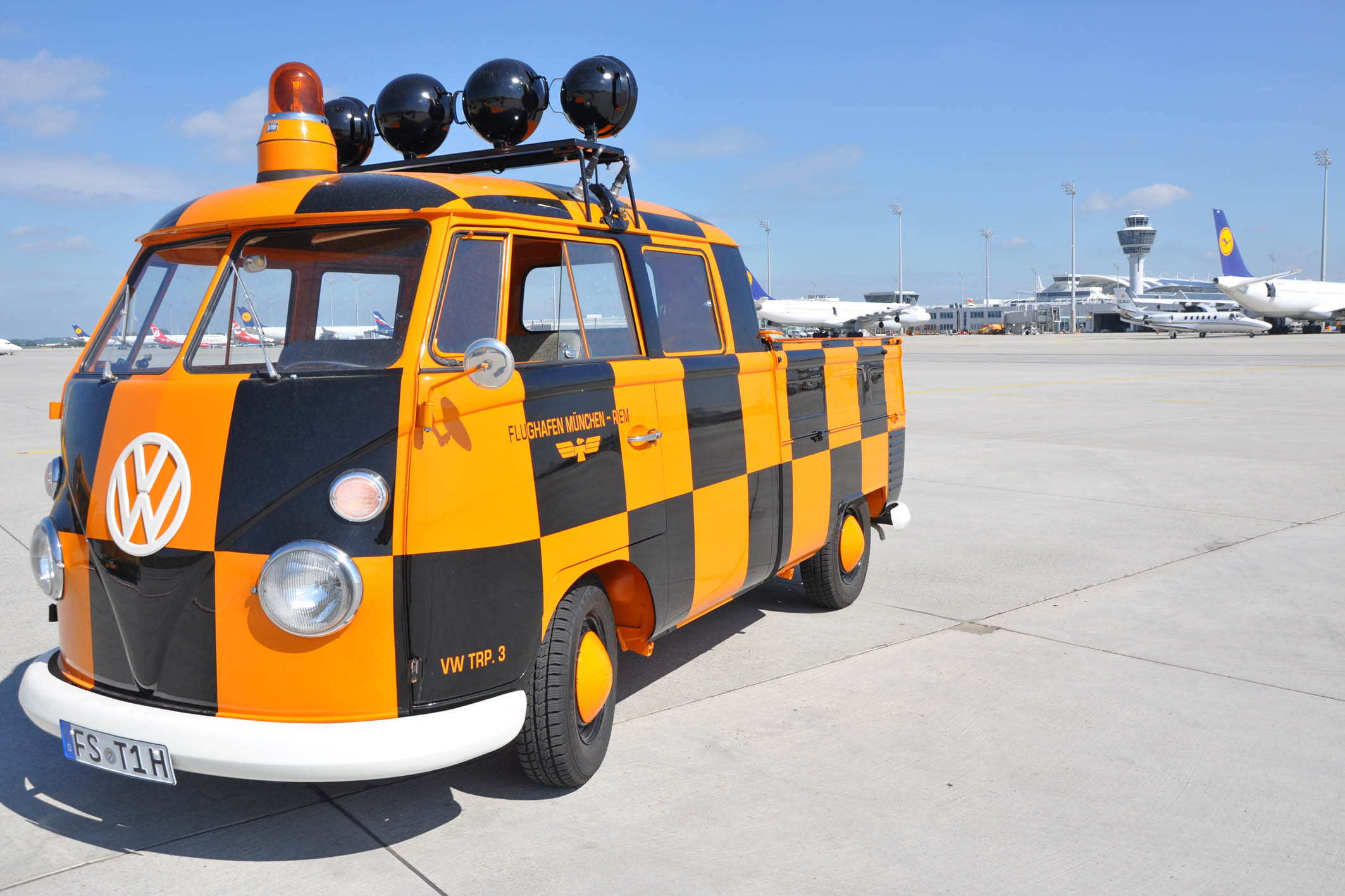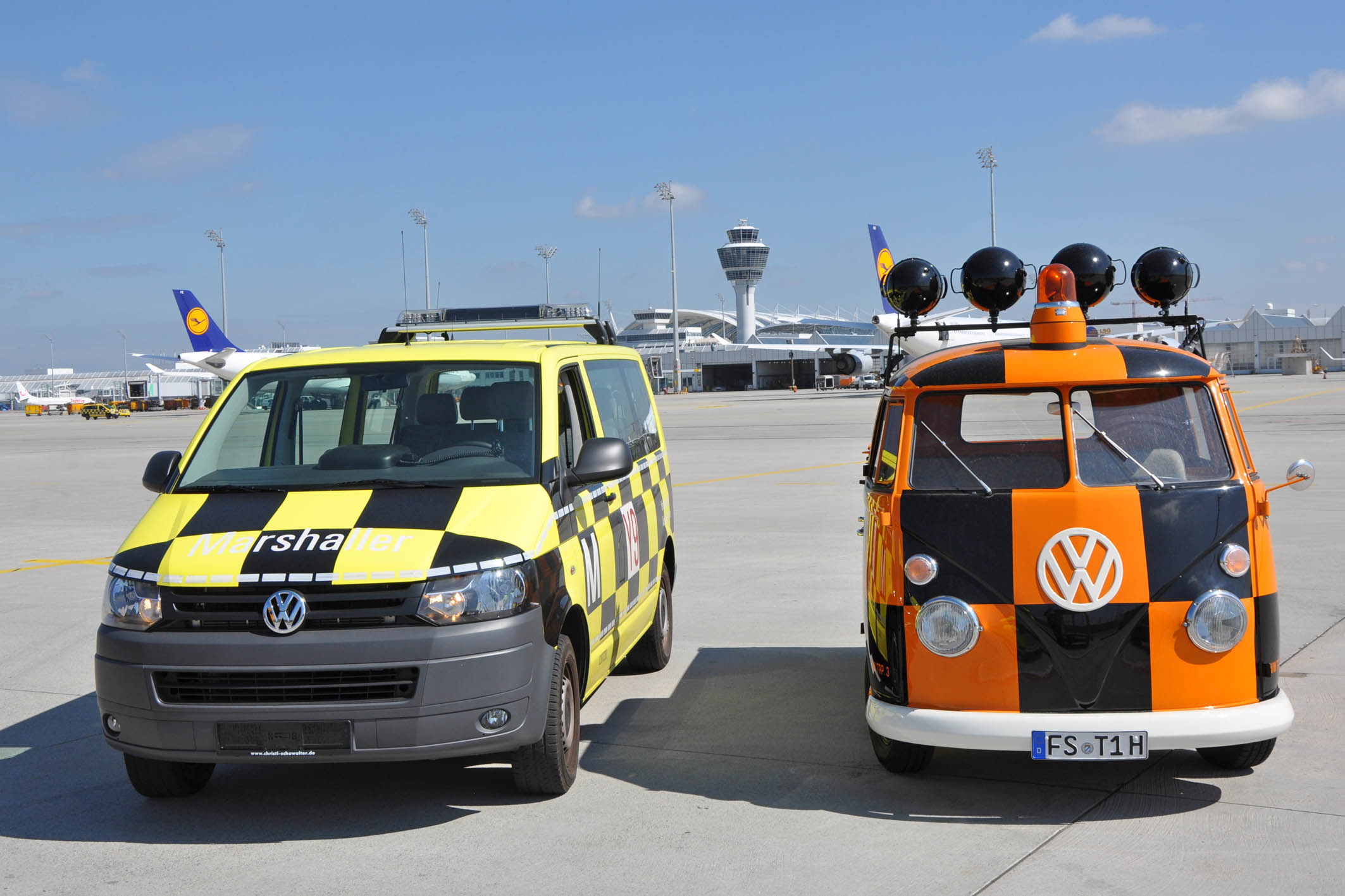 Der Flughafen München ist um ein Attraktion reicher: neu im Einsatz auf dem Vorfeld des Münchner Flughafens ist ein VW-Bulli aus Riemer Zeiten. Die seltene VW-Doppelkabine vom Typ T1, Baujahr 1966, wurde nach einem historischen Foto originalgetreu restauriert. Auf dem Fahrzeugdach wurde eine gelbe Hella KL 8 montiert (siehe auch Beitrag unter Hella). Das Traditionsfahrzeug des Münchner Flughafens wird auf Veranstaltungen, Messen oder im Besucherpark des Flughafens zu sehen sein. Das Foto unten zeigt den „Follow Me“ von 1966 neben einem modernen „Marshaller".“.