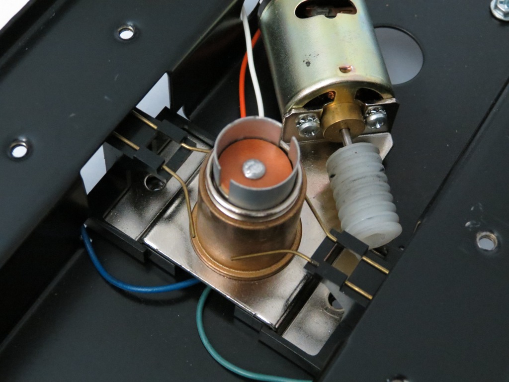 Der Motor, die Kontakt-Bügel (incl. der Halter) und das Zahnrad sind vom LP-Dreher. Der Grundträger sowie der Reflektor stammen von einem MX-Dreher.