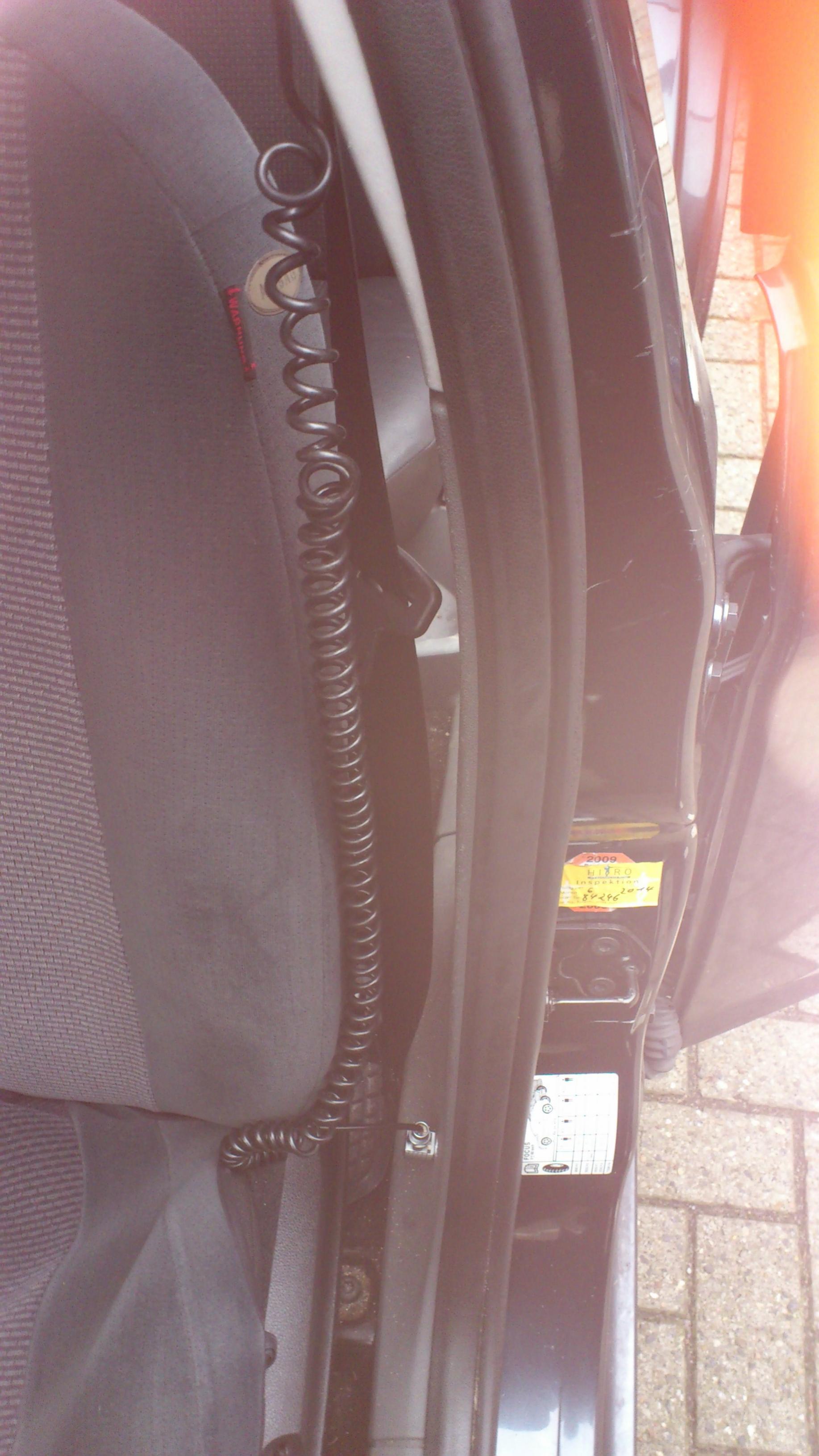 Entweder geht es von der A-Säule links aus hinter dem Fahrersitz und dann vor ihm lang oder (dank akrobatischer Fähigkeiten) auch hinter seinem Sitz entlang und verheddert sich dann mit dem Gurt des Beifahrersitzes